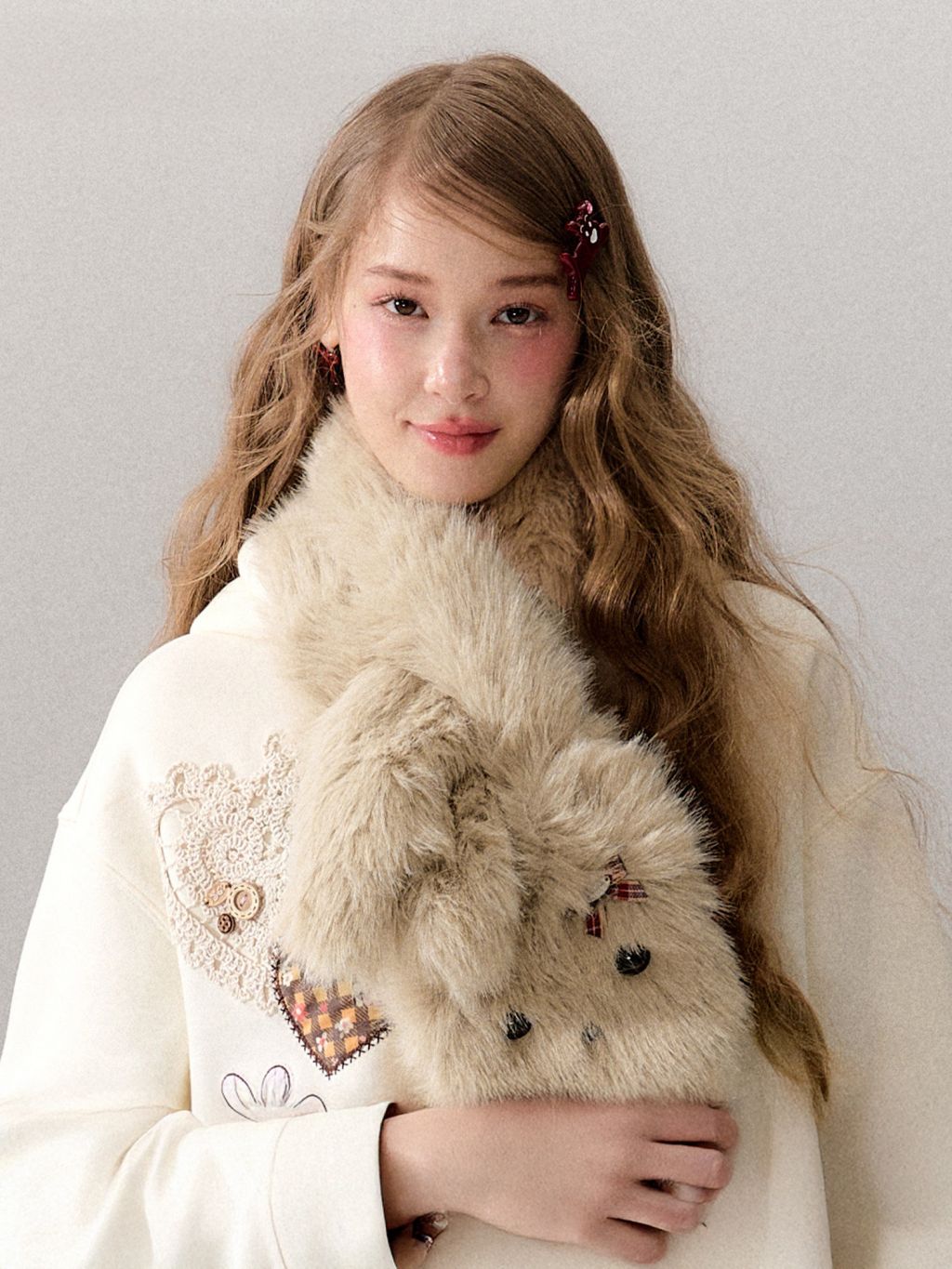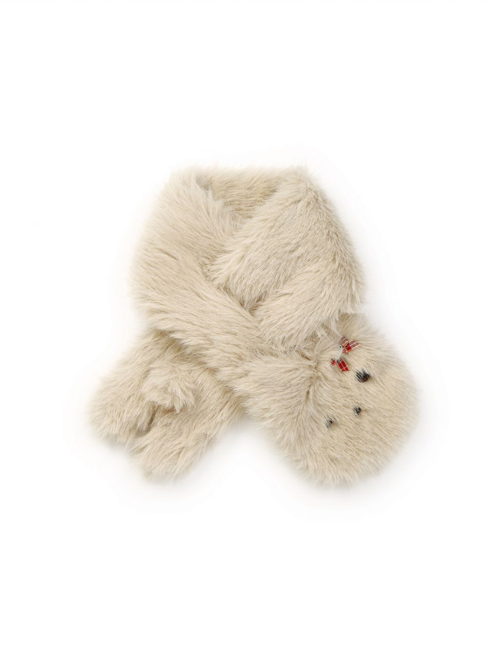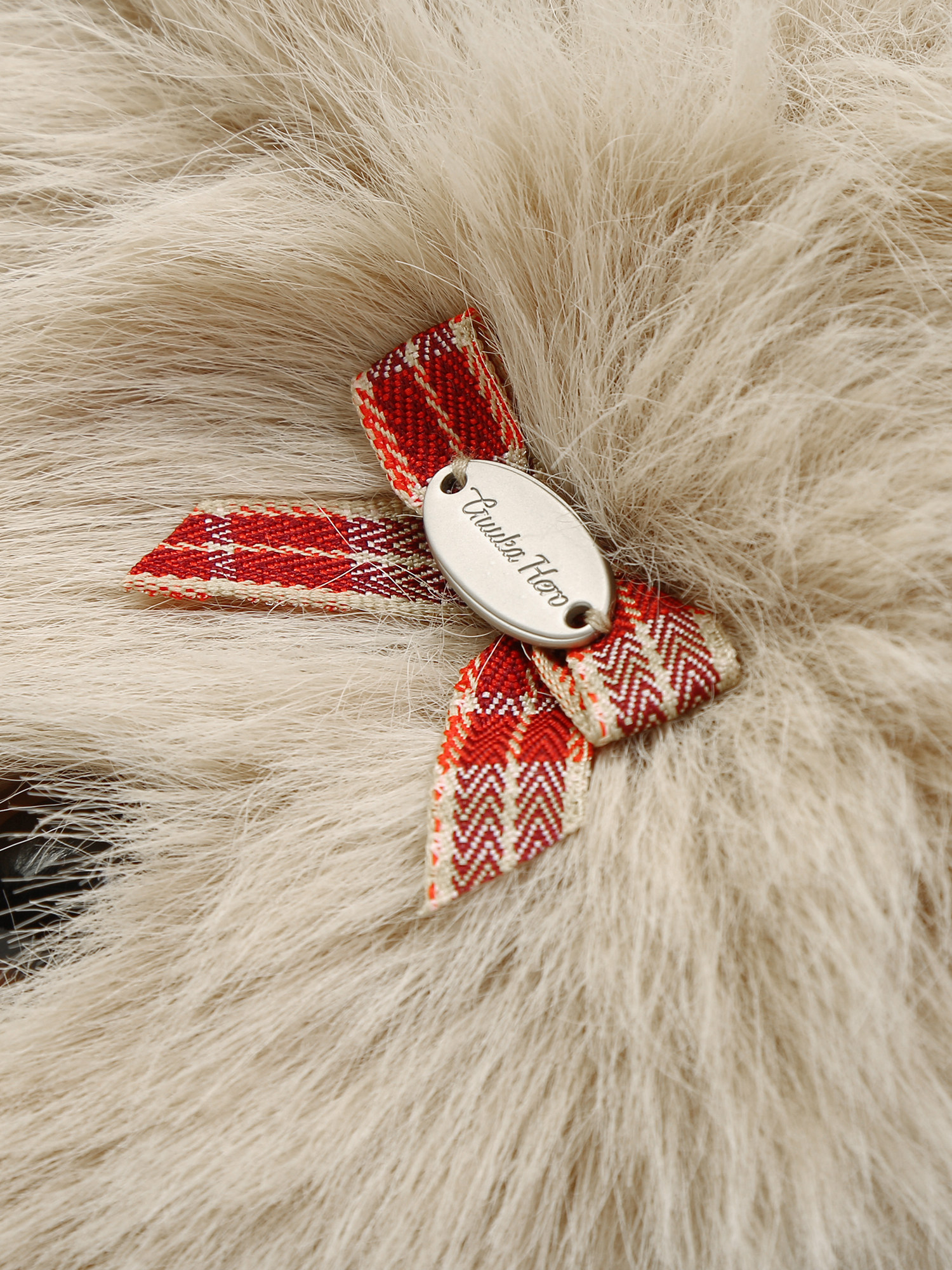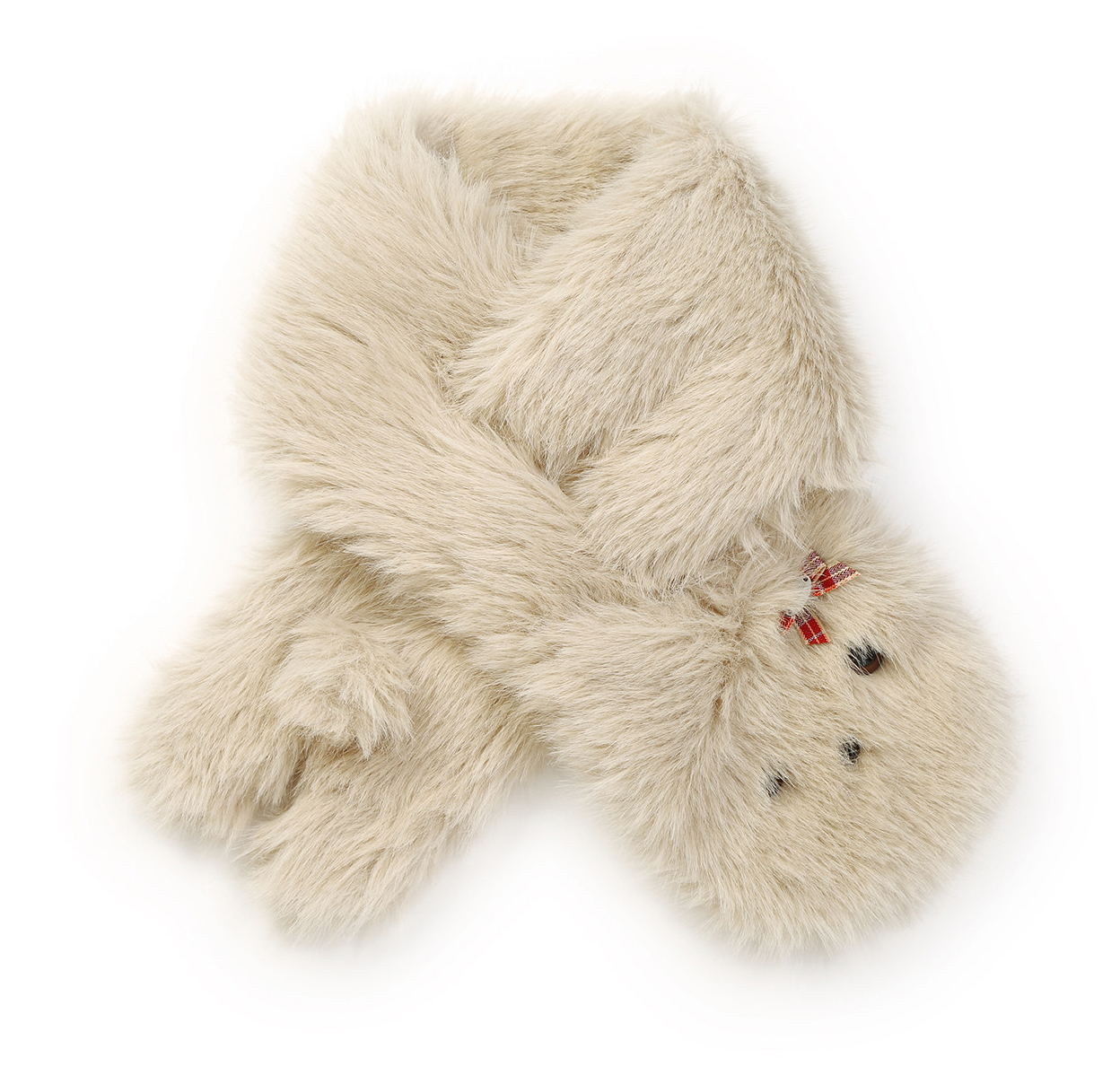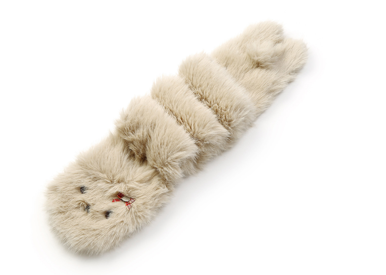 카키 톤의 보송한 퍼에 강아지 인형 디테일 + 리본 포인트를 더한, 목에 두르는 순간 바로 귀여워지는 퍼 목도리입니다.