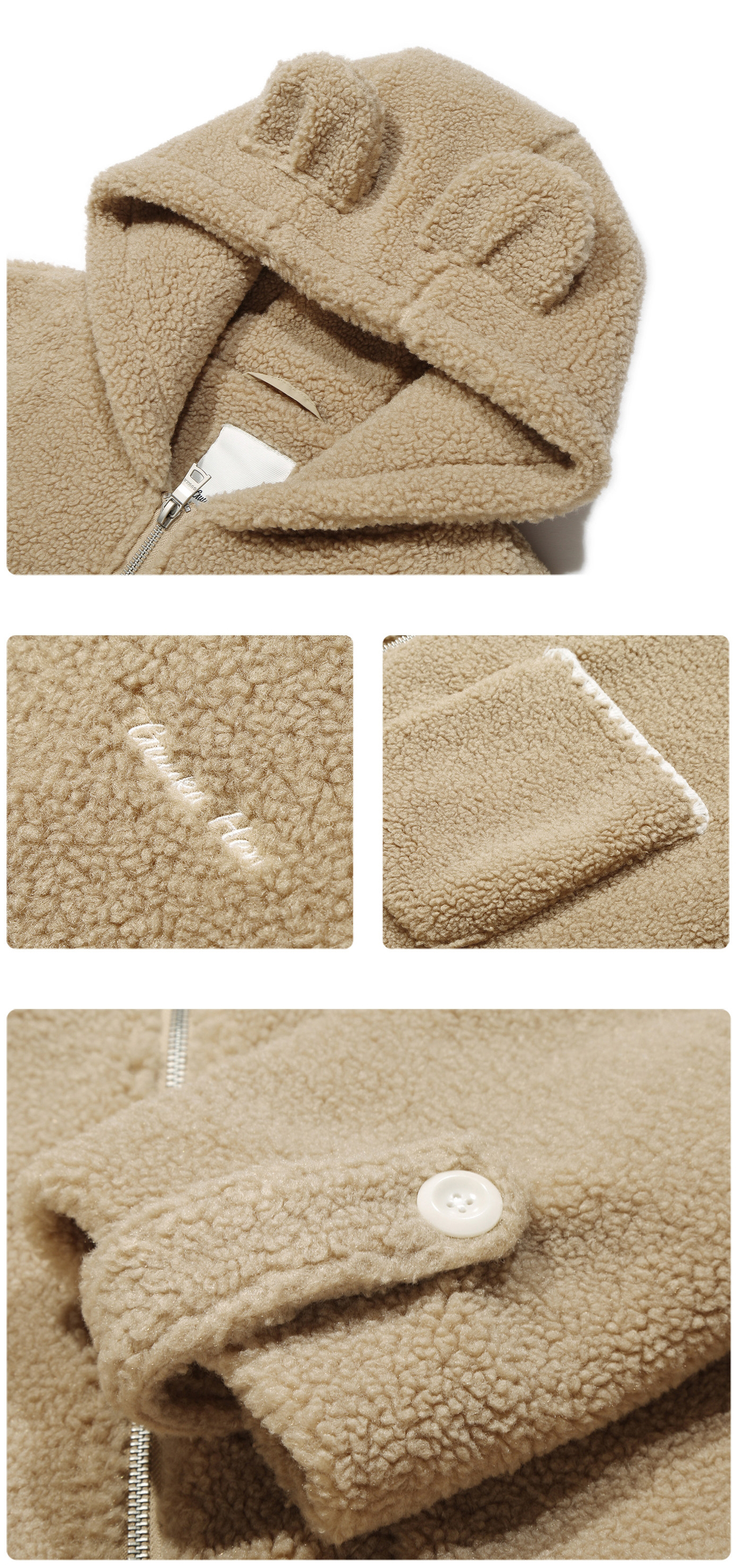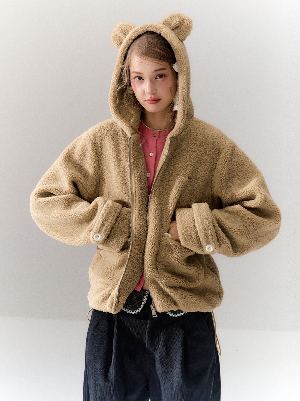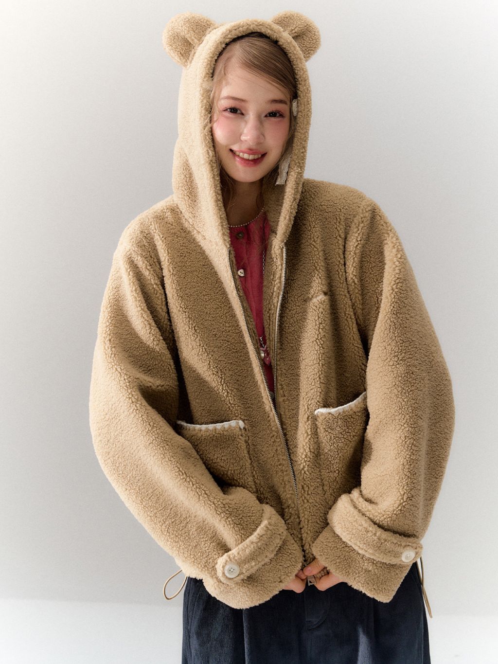 몽글몽글한 양털 텍스처에 베어 이어 후드를 더해, 걸치기만 해도 귀여움이 완성되는 집업 플리스 가디건 입니다. 루즈한 실루엣이라 이너 위에 툭—데일리 방한 아우터로 활용도까지 높습니다.