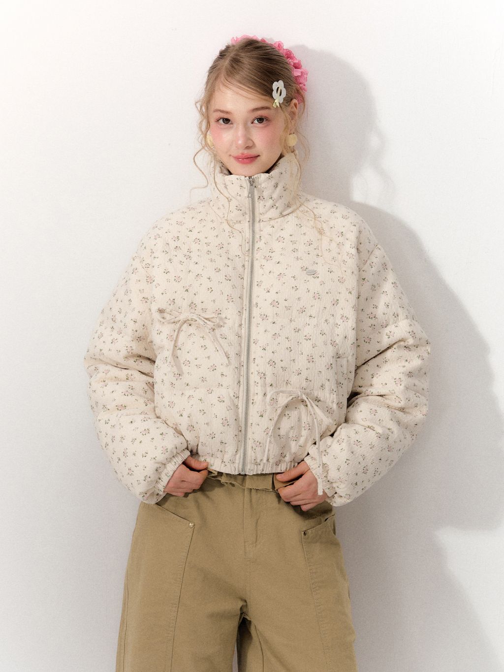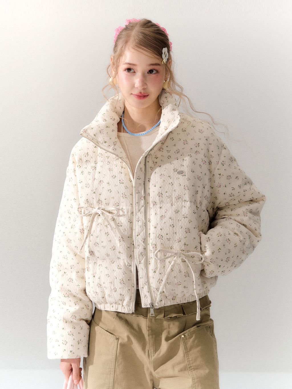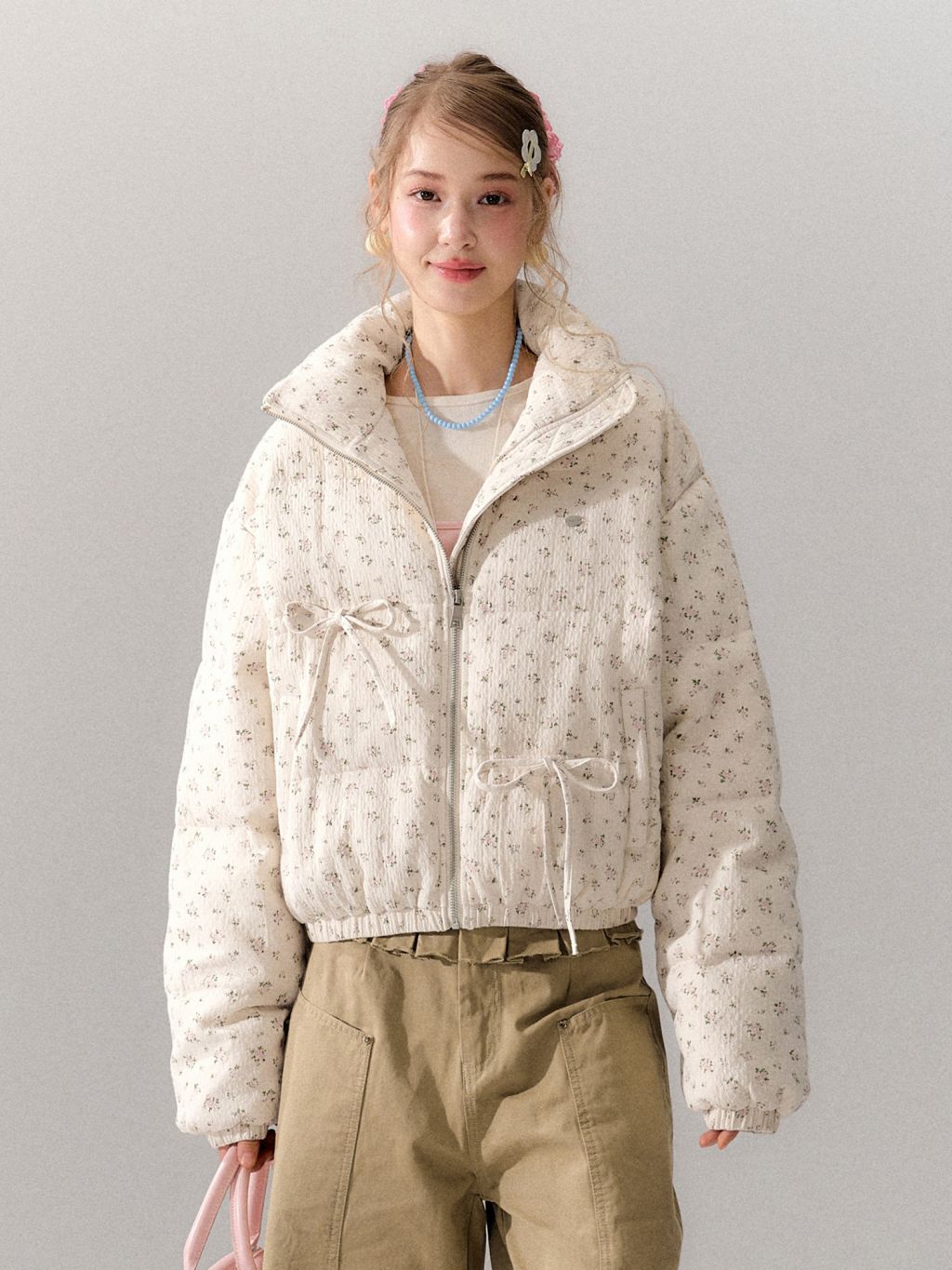잔잔한 디츠 플라워 패턴과 리본 디테일에 덕다운 충전재를 더해, 가볍지만 확실하게 따뜻한 숏 패딩 점퍼입니다. 볼륨감 있는 퍼프 실루엣으로 귀여운 무드는 살리고, 보온성은 한 단계 업그레이드했습니다.