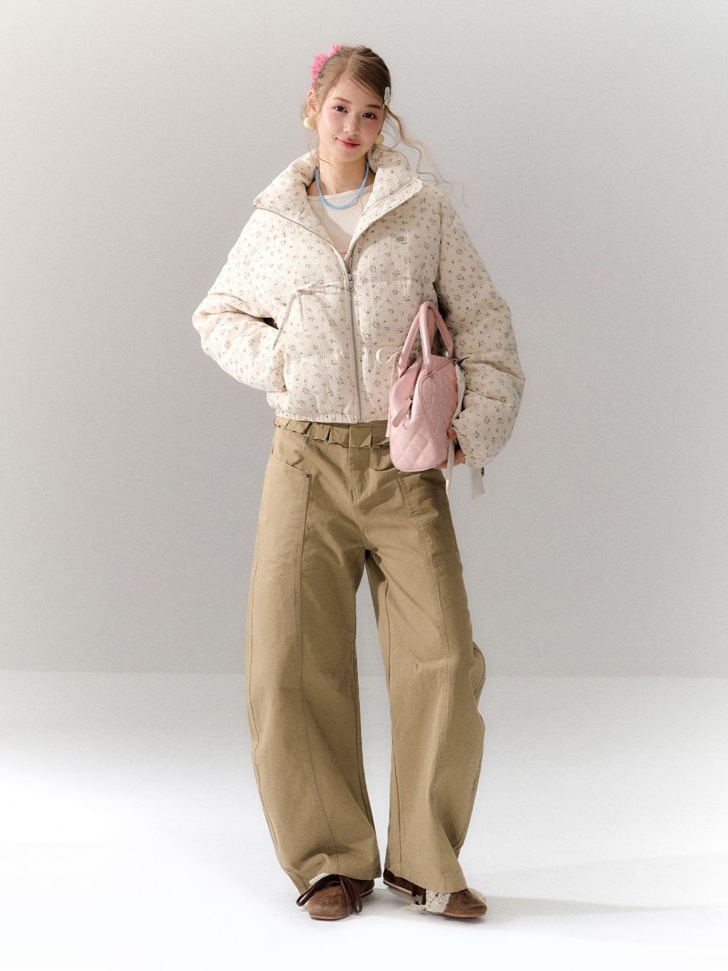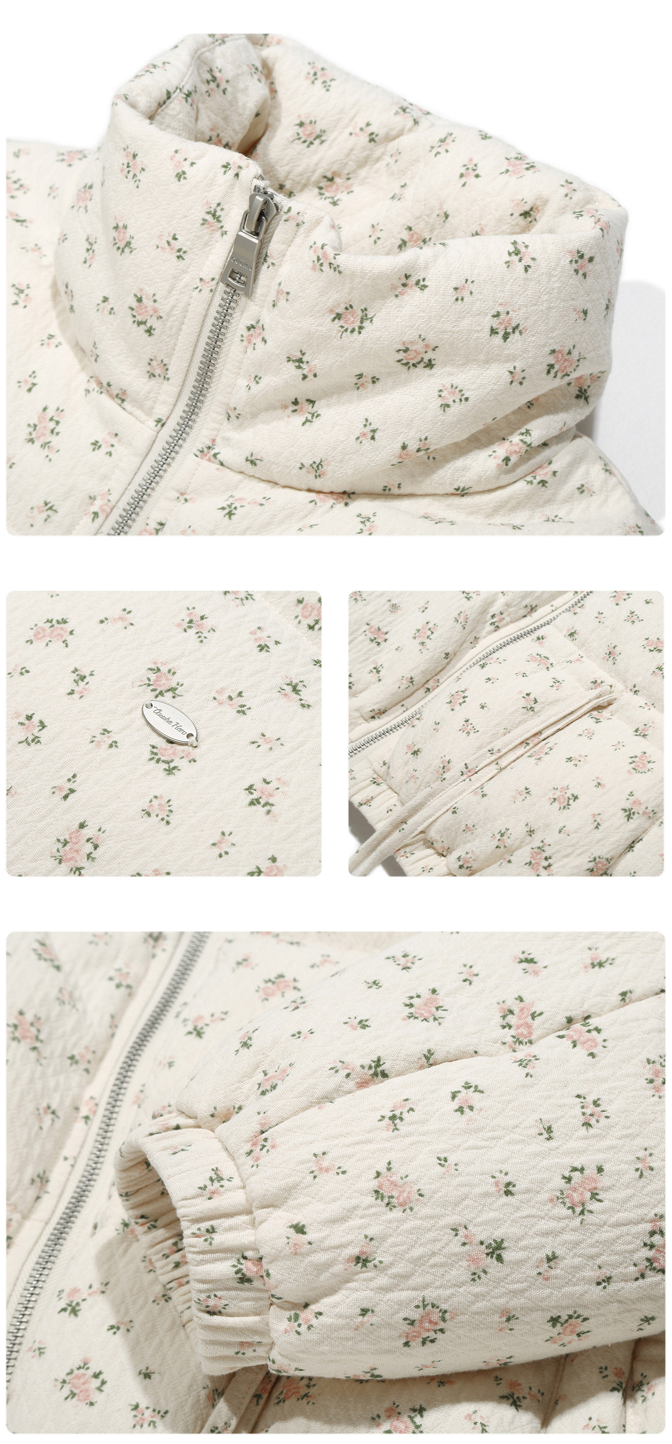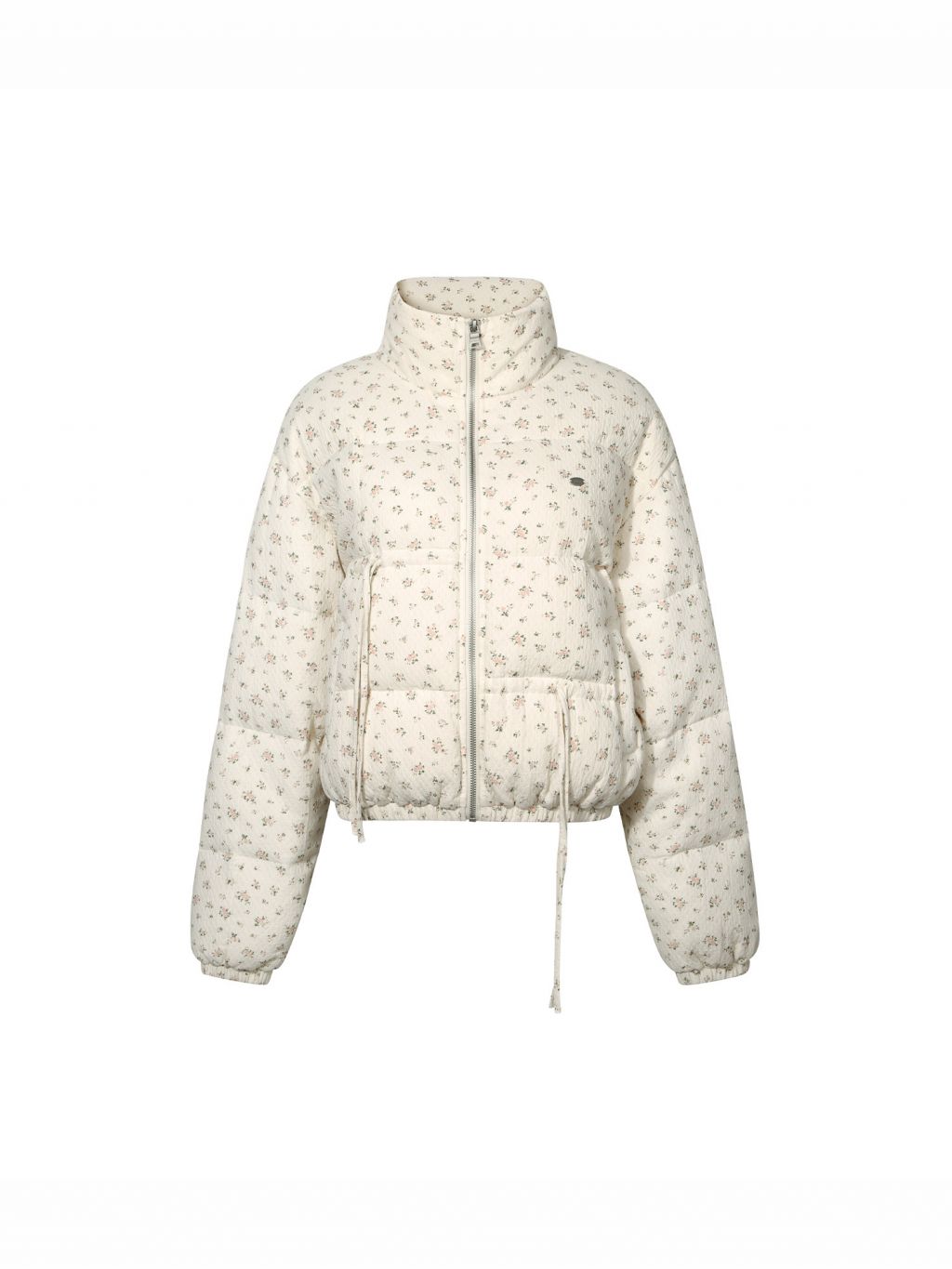 잔잔한 디츠 플라워 패턴과 리본 디테일에 덕다운 충전재를 더해, 가볍지만 확실하게 따뜻한 숏 패딩 점퍼입니다. 볼륨감 있는 퍼프 실루엣으로 귀여운 무드는 살리고, 보온성은 한 단계 업그레이드했습니다.