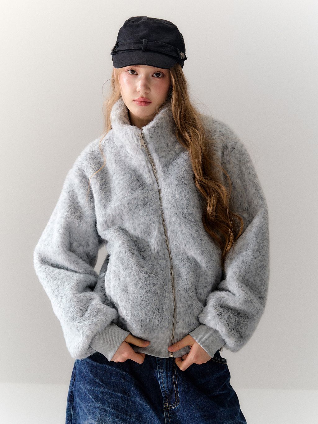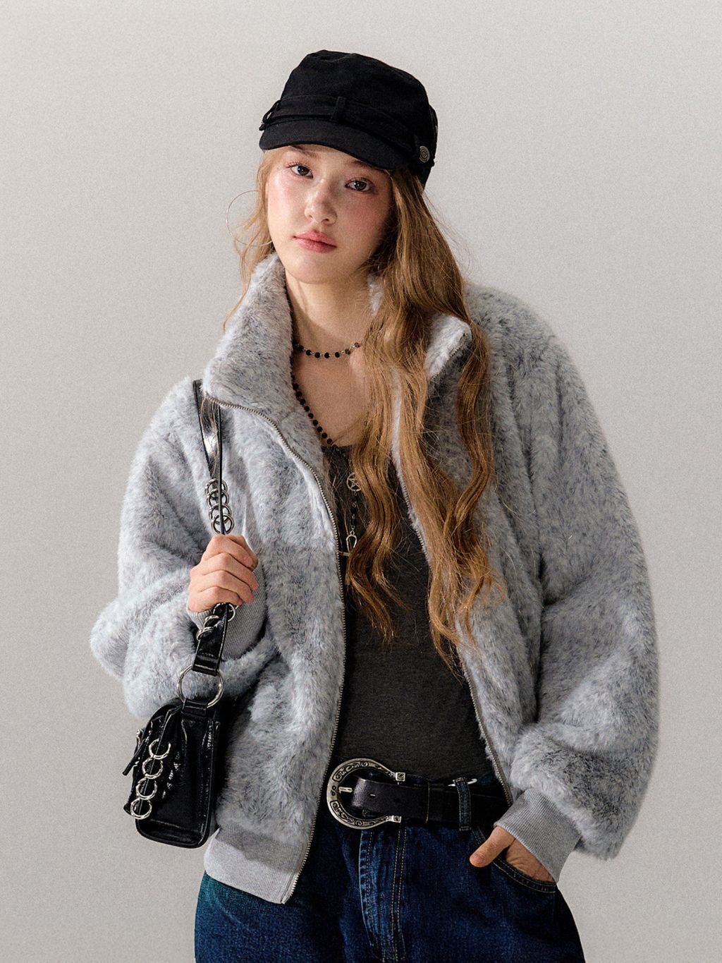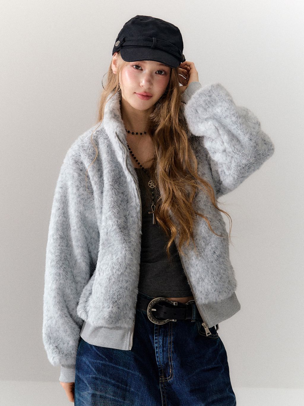 은은한 그레이 톤의 보송한 퍼 텍스처가 룩을 차분하게 잡아주는 퍼 자켓입니다. 하이넥 집업 디자인으로 목까지 따뜻하게 감싸주면서, 과하지 않은 컬러감으로 데일리하게 매치하기 좋습니다.