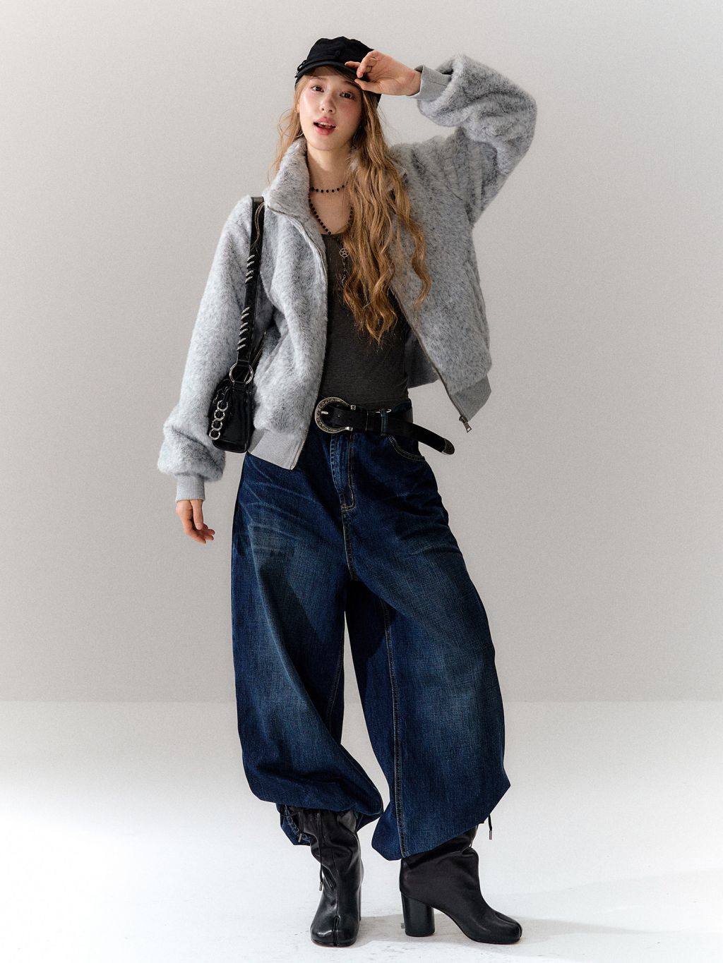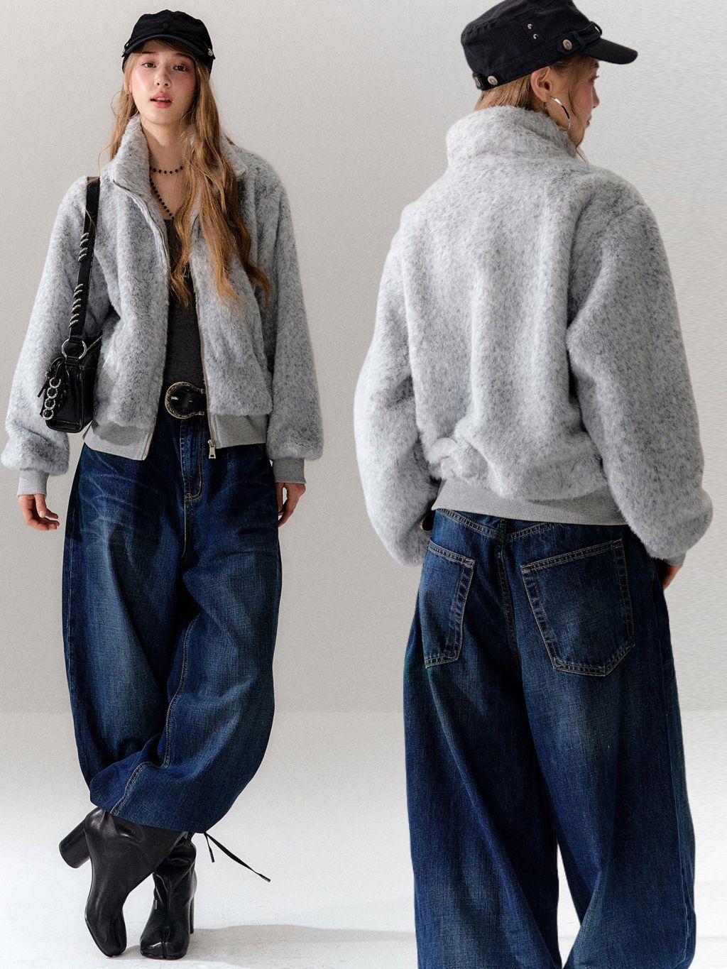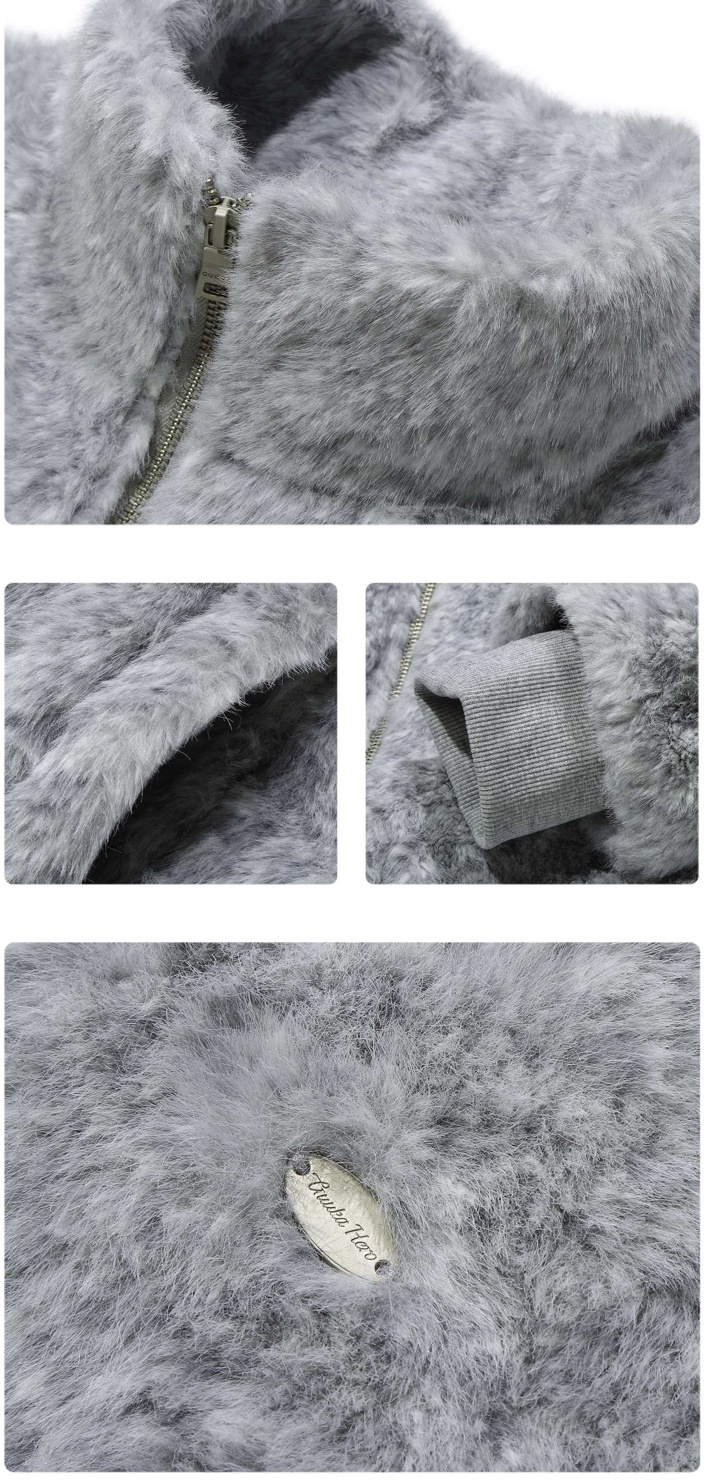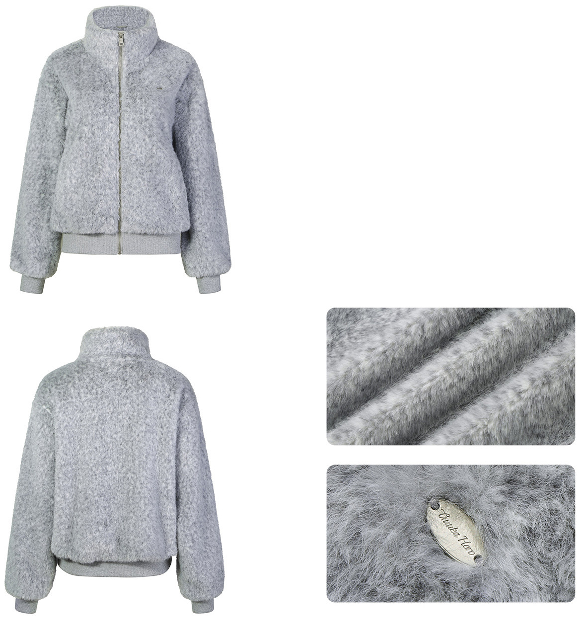 은은한 그레이 톤의 보송한 퍼 텍스처가 룩을 차분하게 잡아주는 퍼 자켓입니다. 하이넥 집업 디자인으로 목까지 따뜻하게 감싸주면서, 과하지 않은 컬러감으로 데일리하게 매치하기 좋습니다.