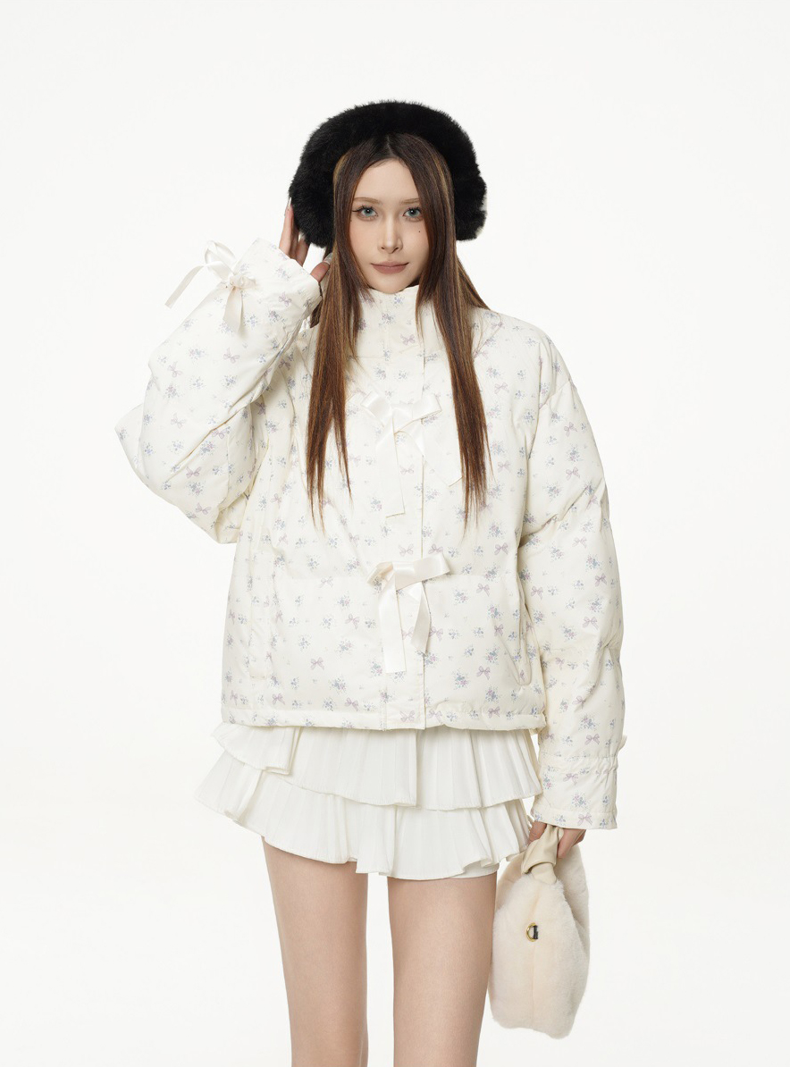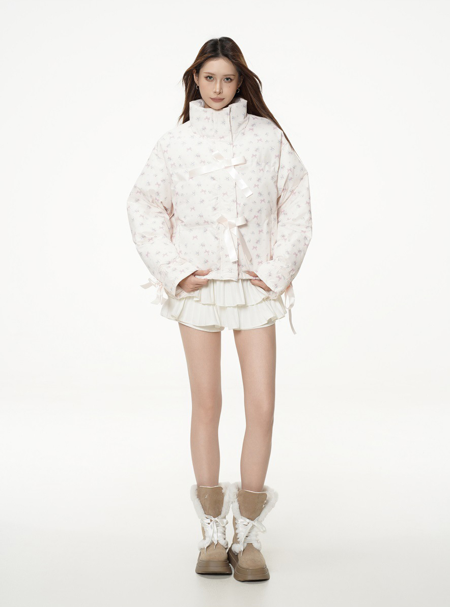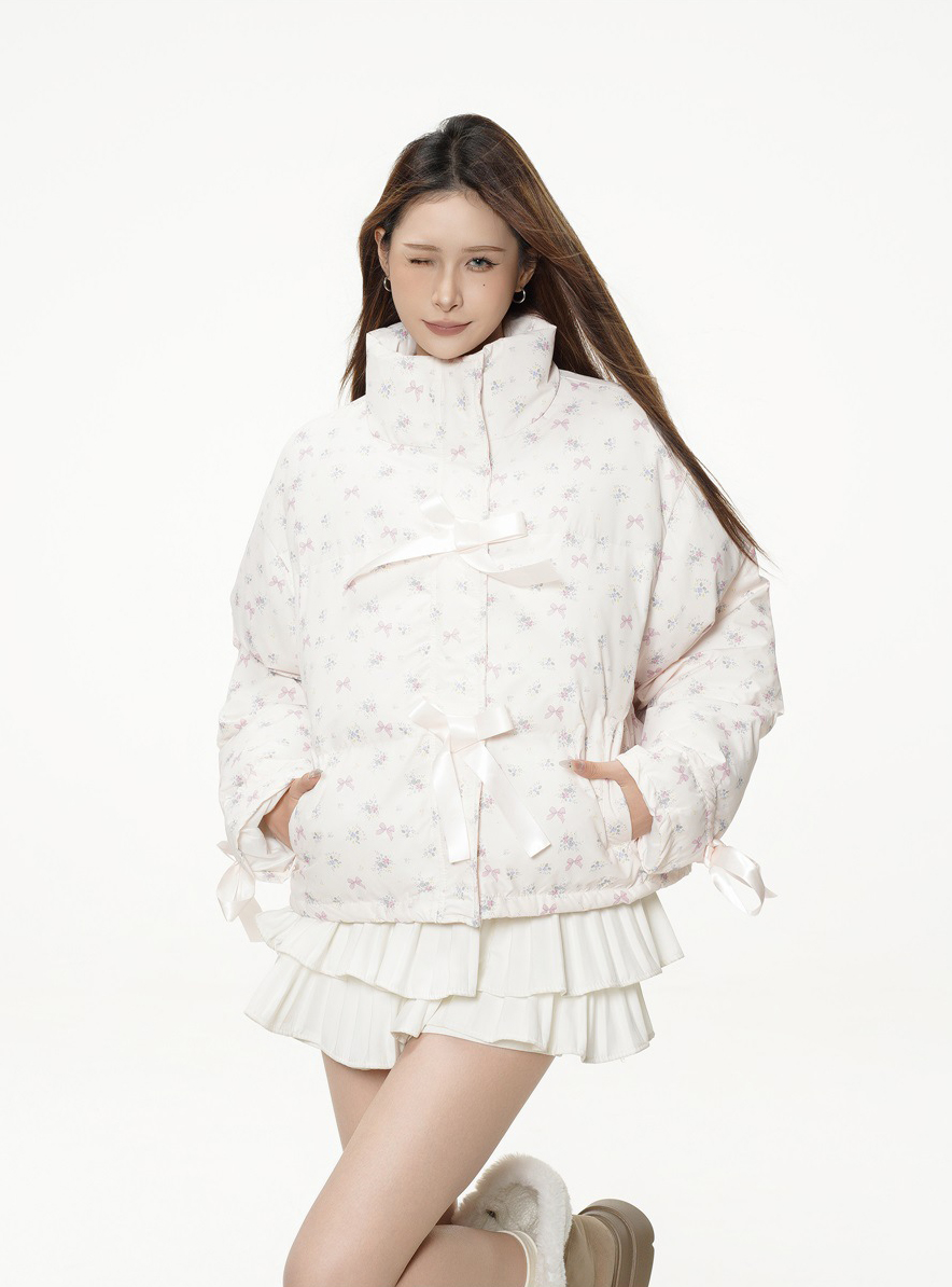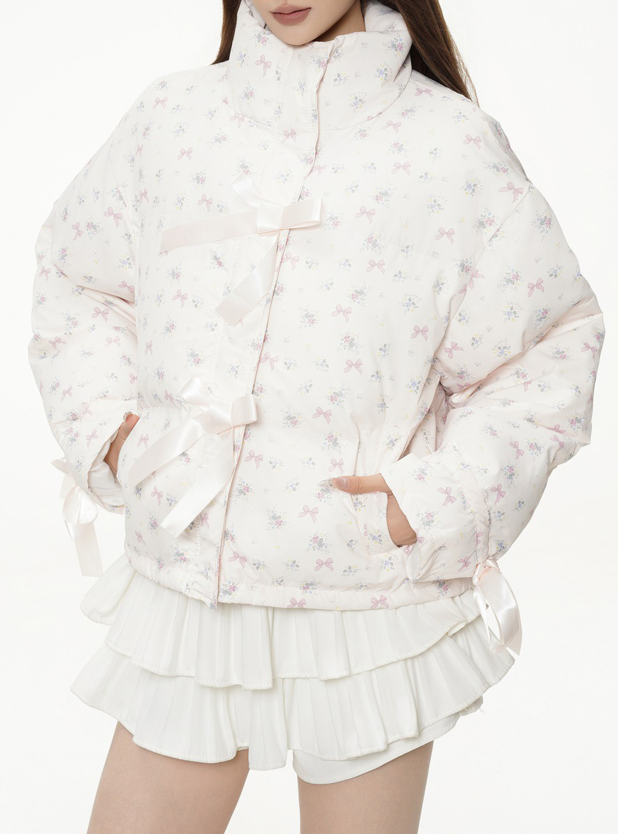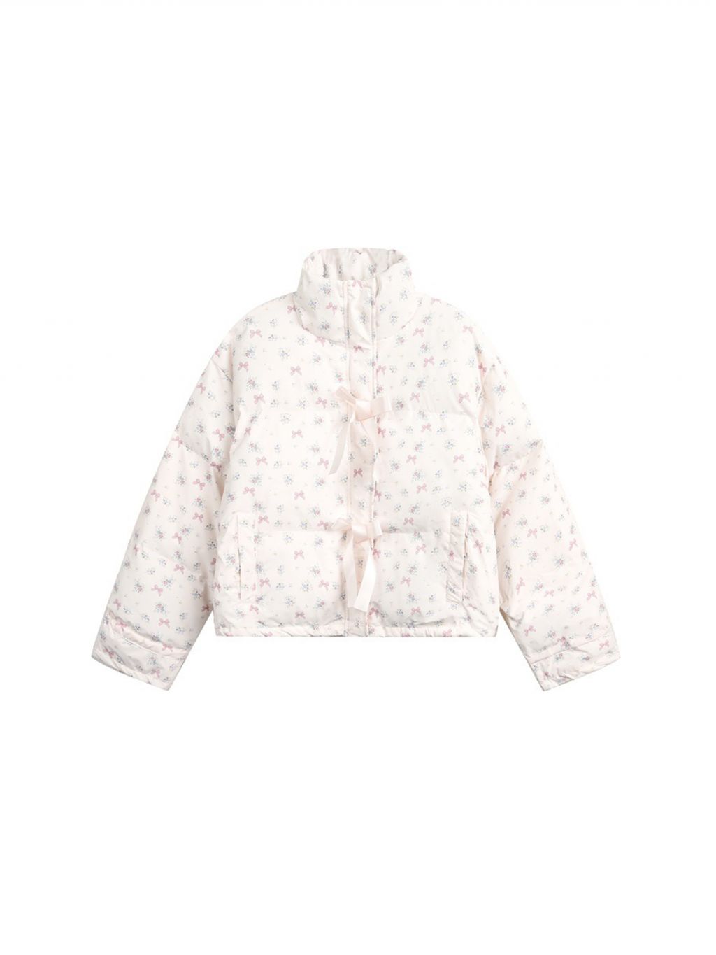 리본 타이 클로징과 미니 플로럴&보우 프린트가 한 번에 ‘러블리 무드’를 완성하는 패딩 자켓입니다.