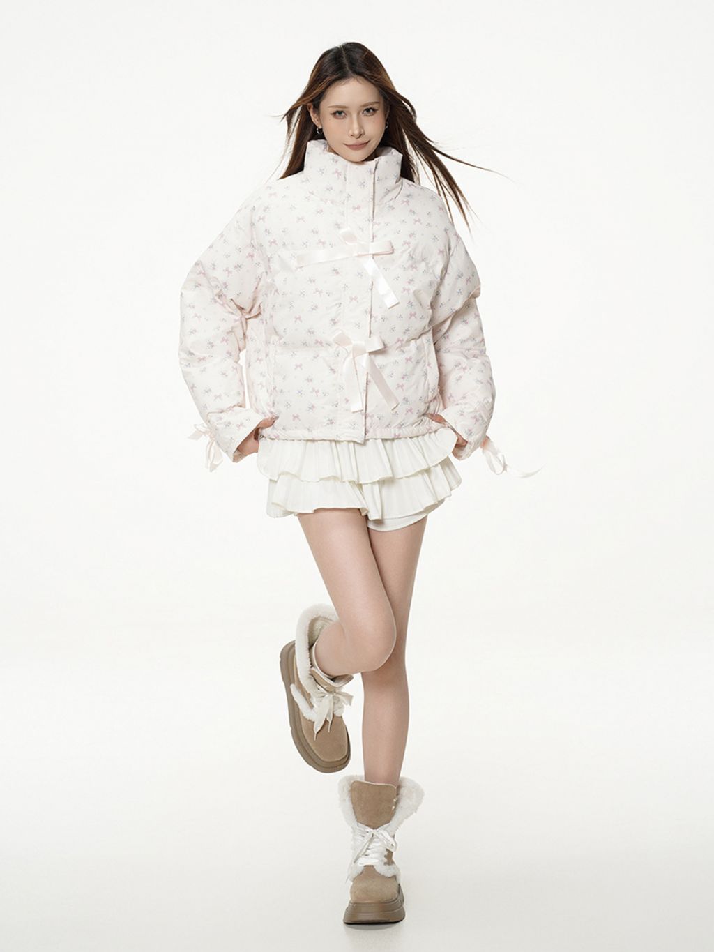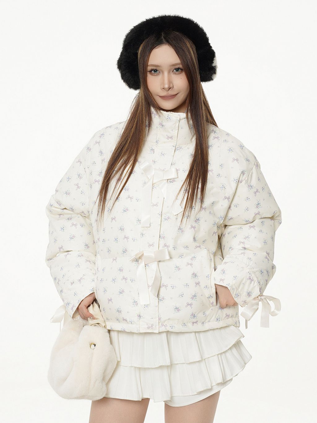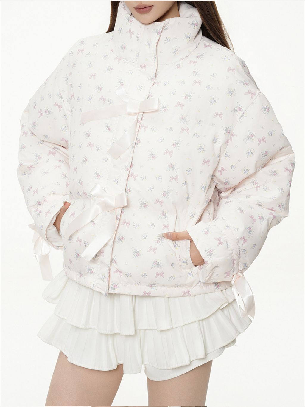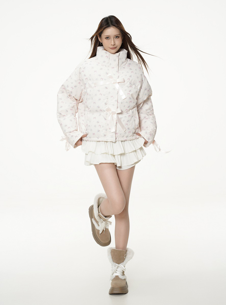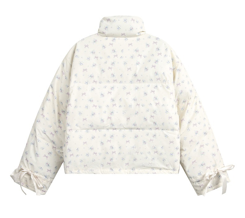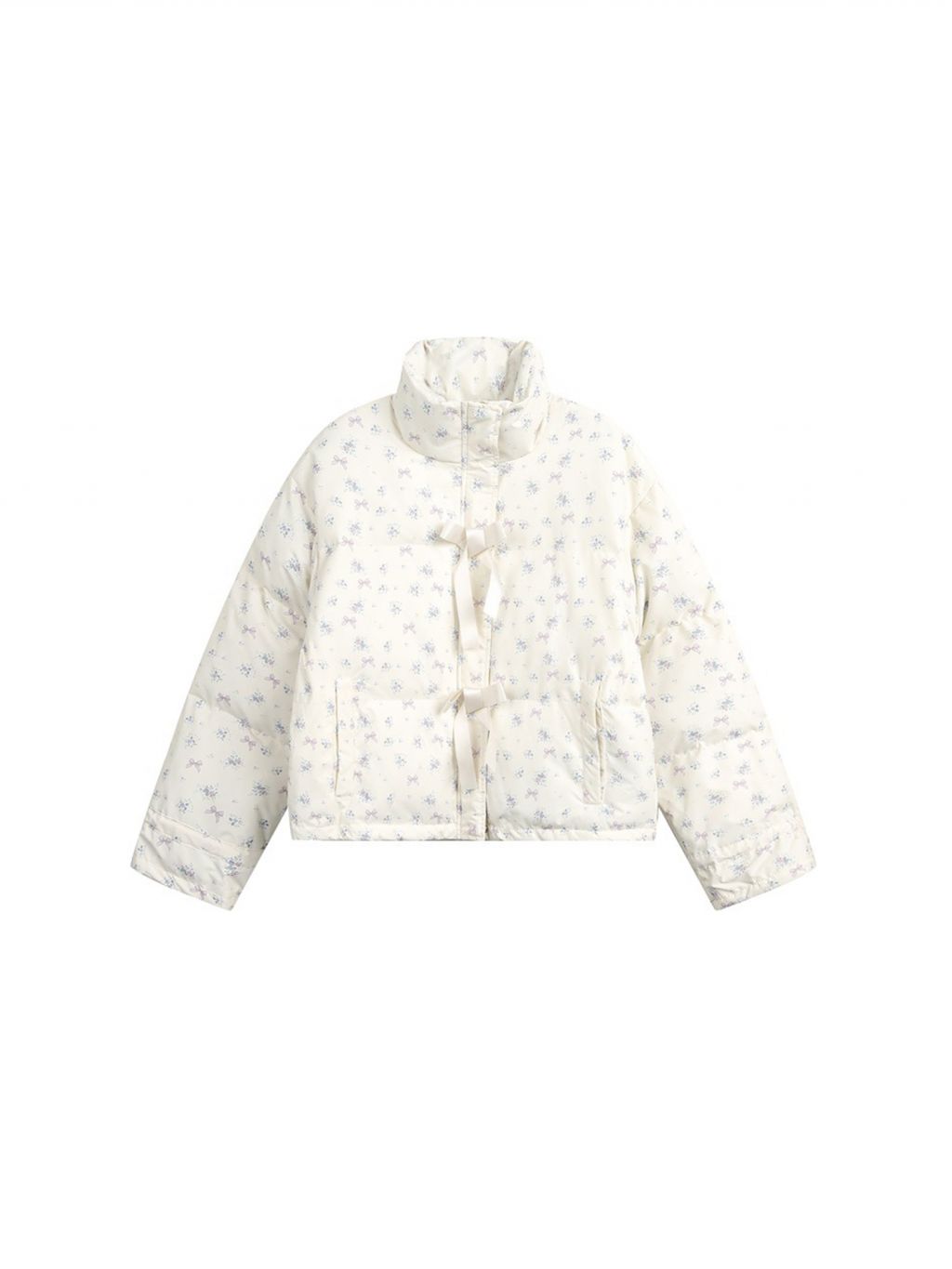 리본 타이 클로징과 미니 플로럴&보우 프린트가 한 번에 ‘러블리 무드’를 완성하는 패딩 자켓입니다.
