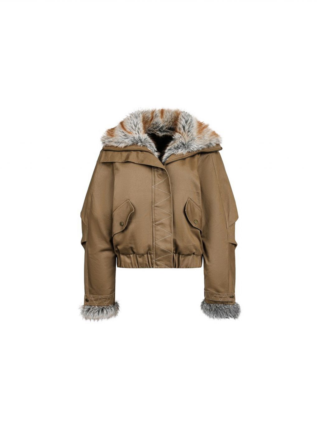 볼륨감 있는 퍼 칼라와 커프스 트리밍이 얼굴을 확 살려주고, 크롭 기장으로 하이웨이스트 룩에 비율이 예쁘게 떨어지는 패딩 자켓입니다. 워크 무드 포켓 디테일까지 더해져 “러블리+쿨” 밸런스가 딱 맞습니다.