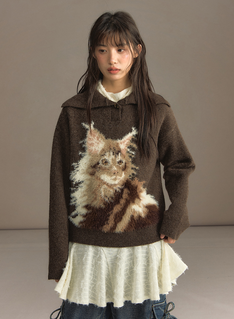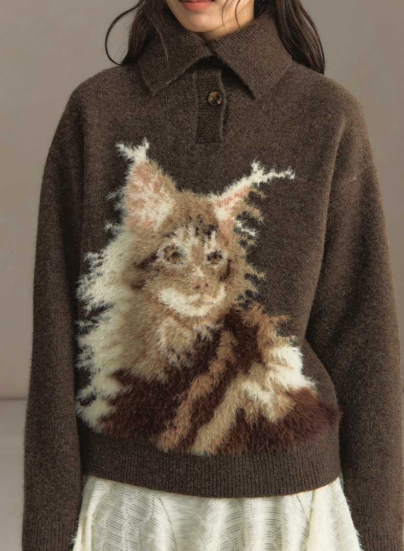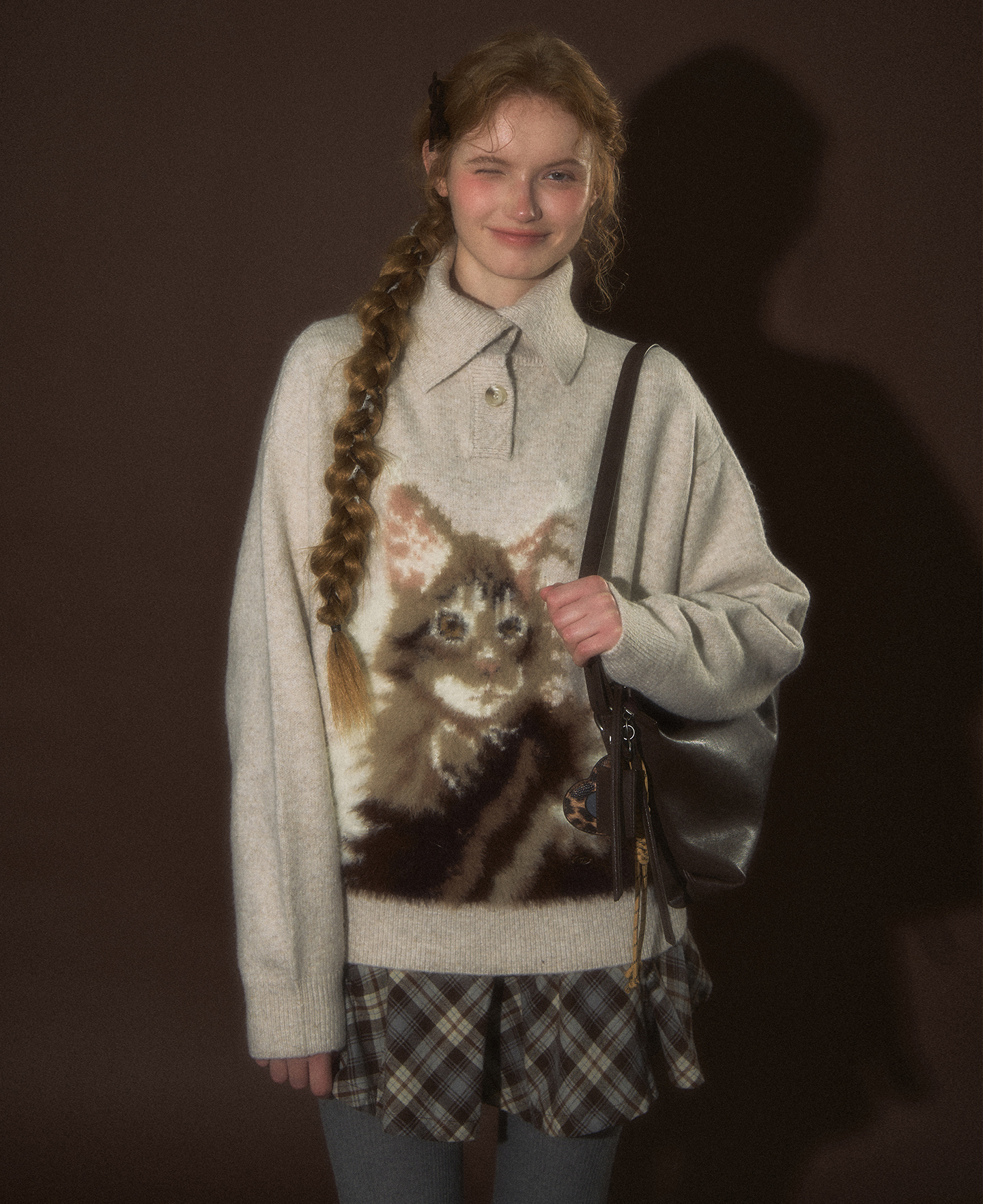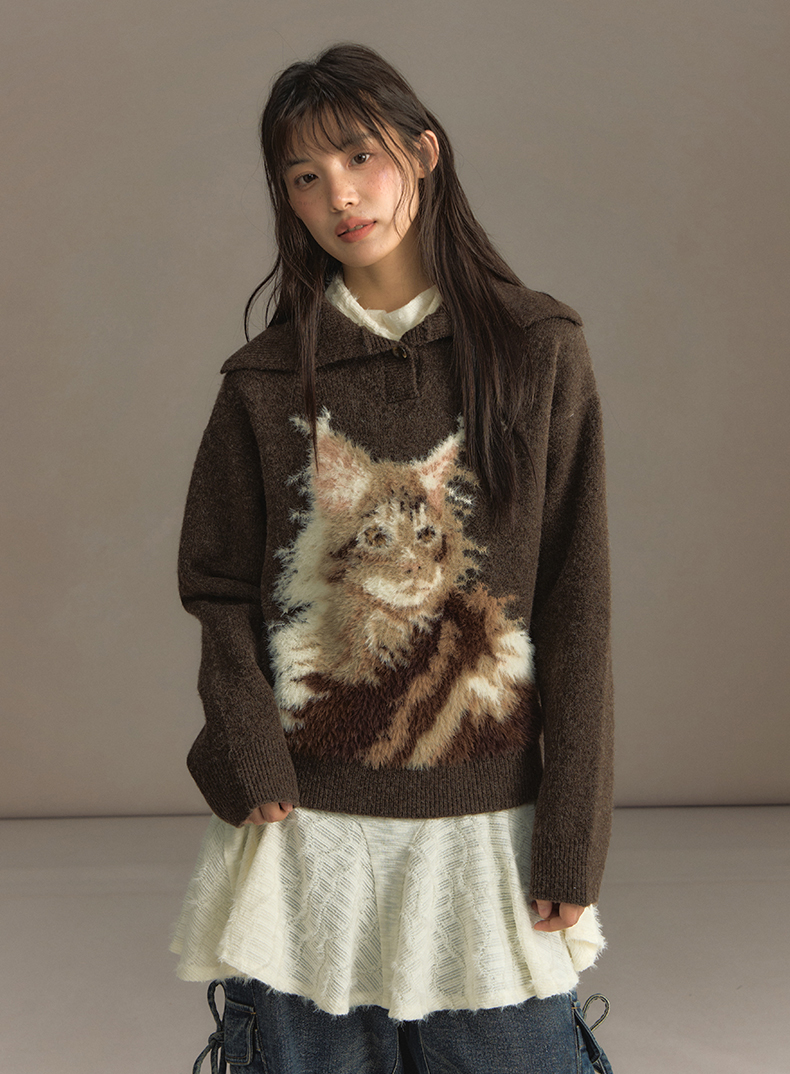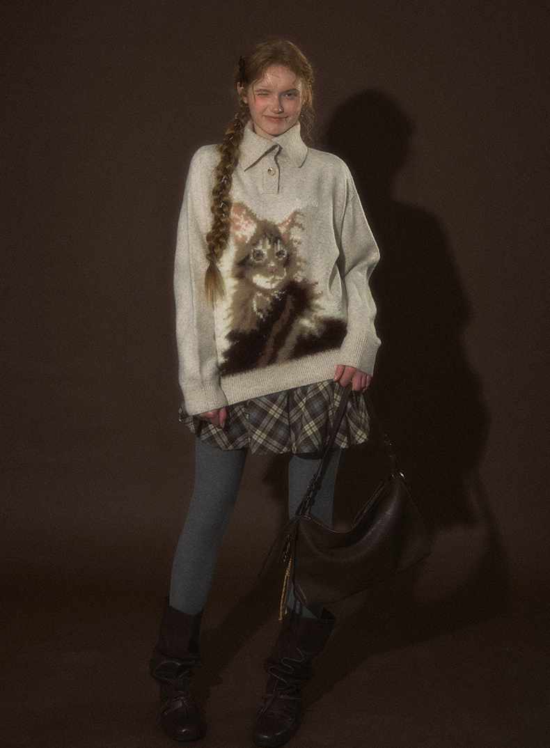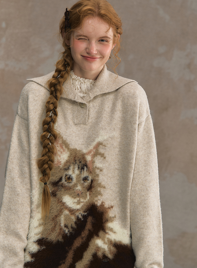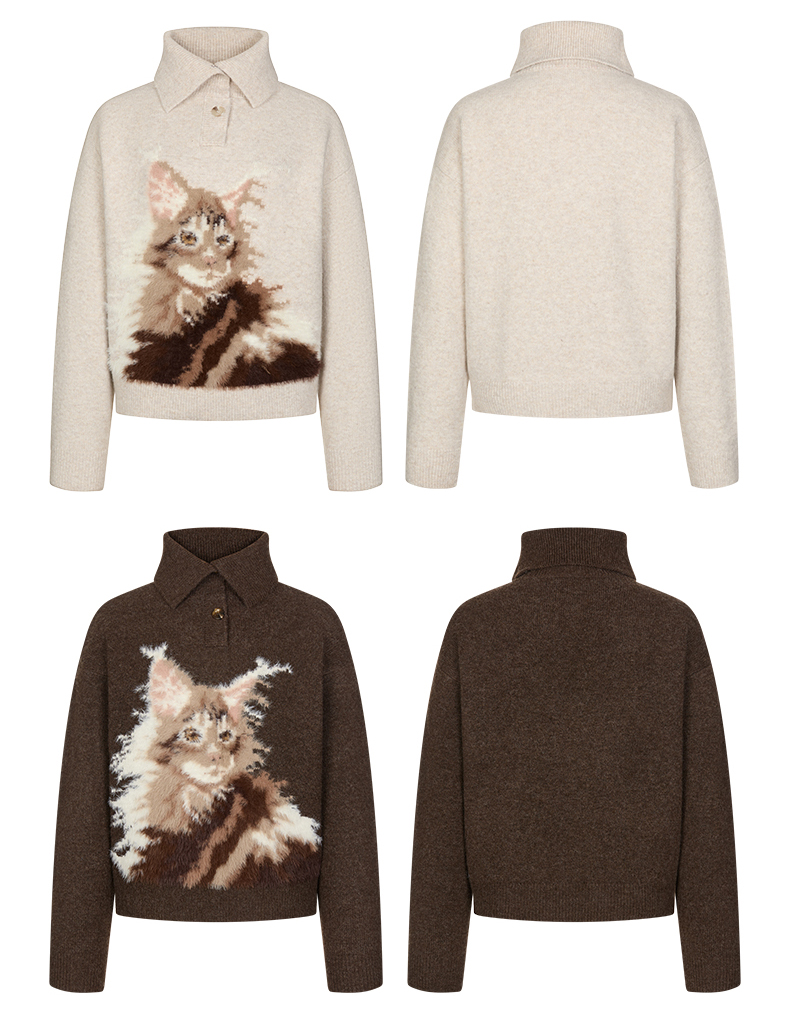 고양이 아트 그래픽과 부드러운 촉감이 매력적인 포인트 니트 스웨터입니다.