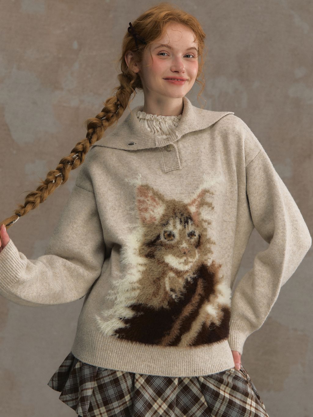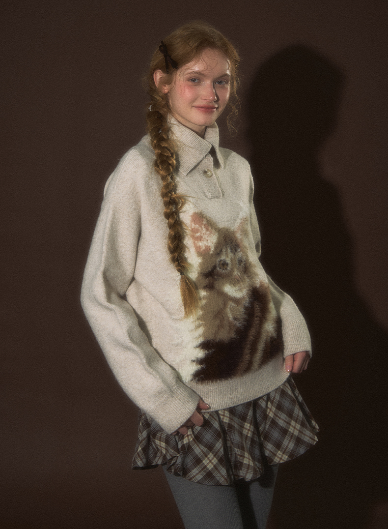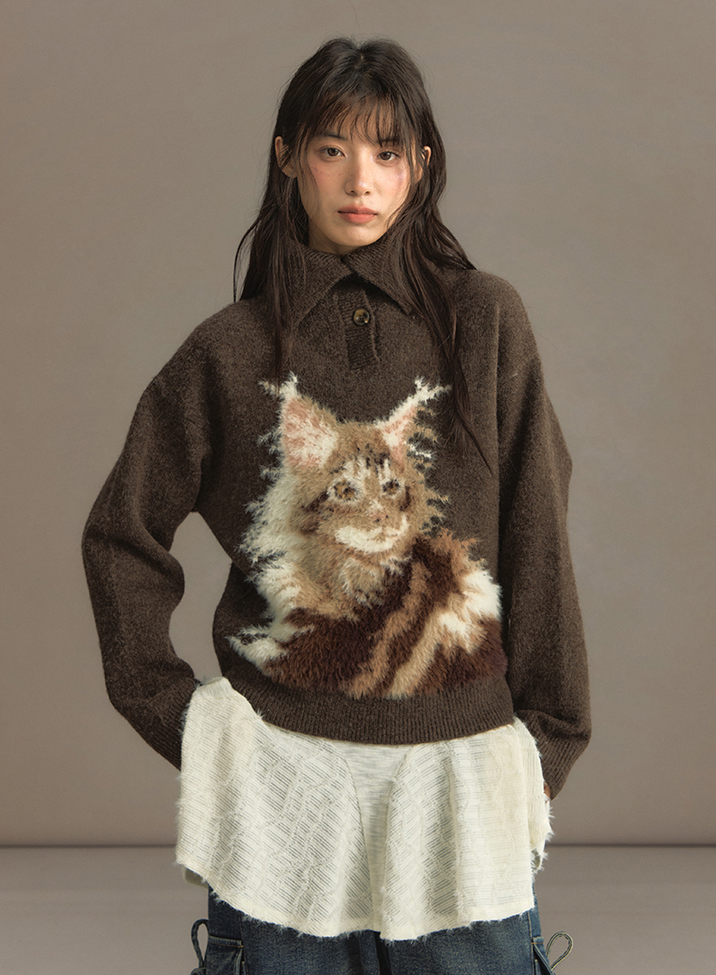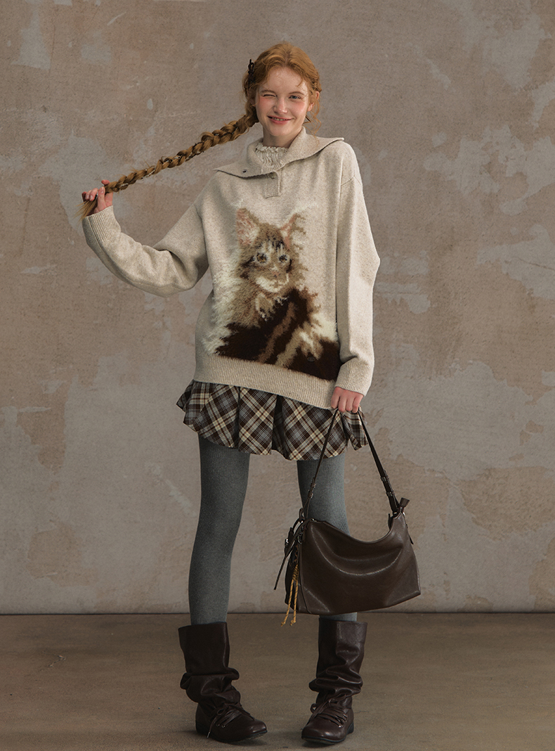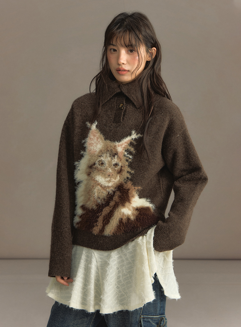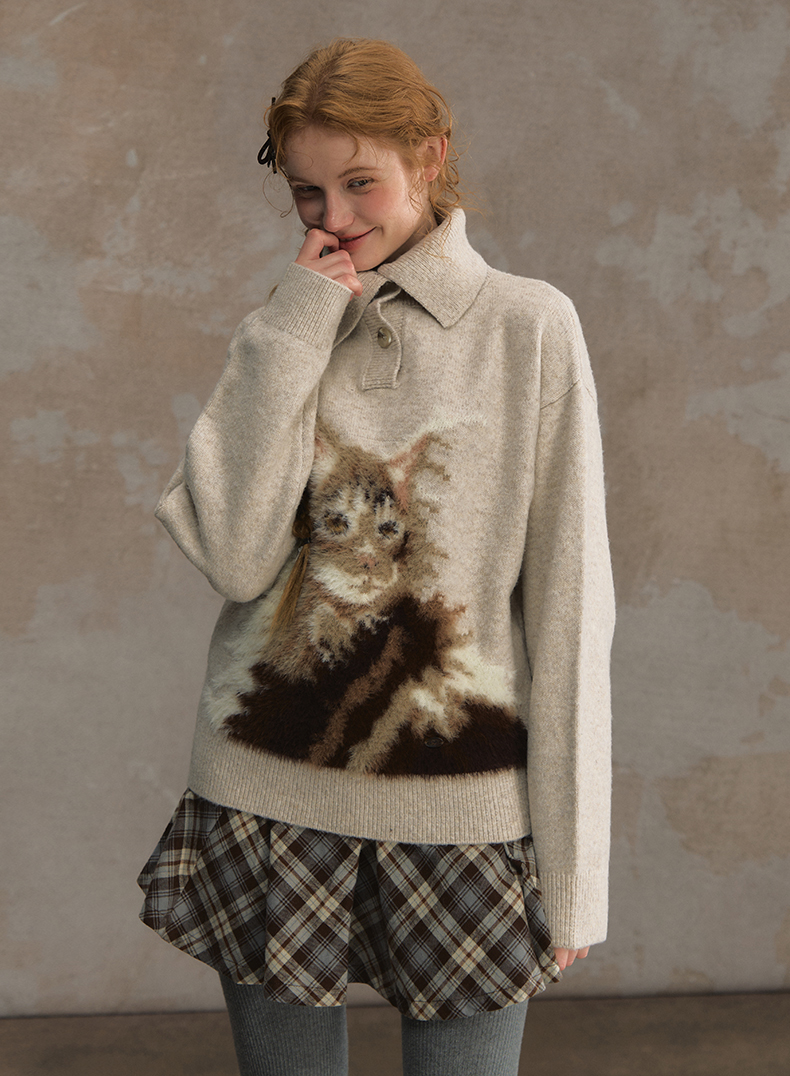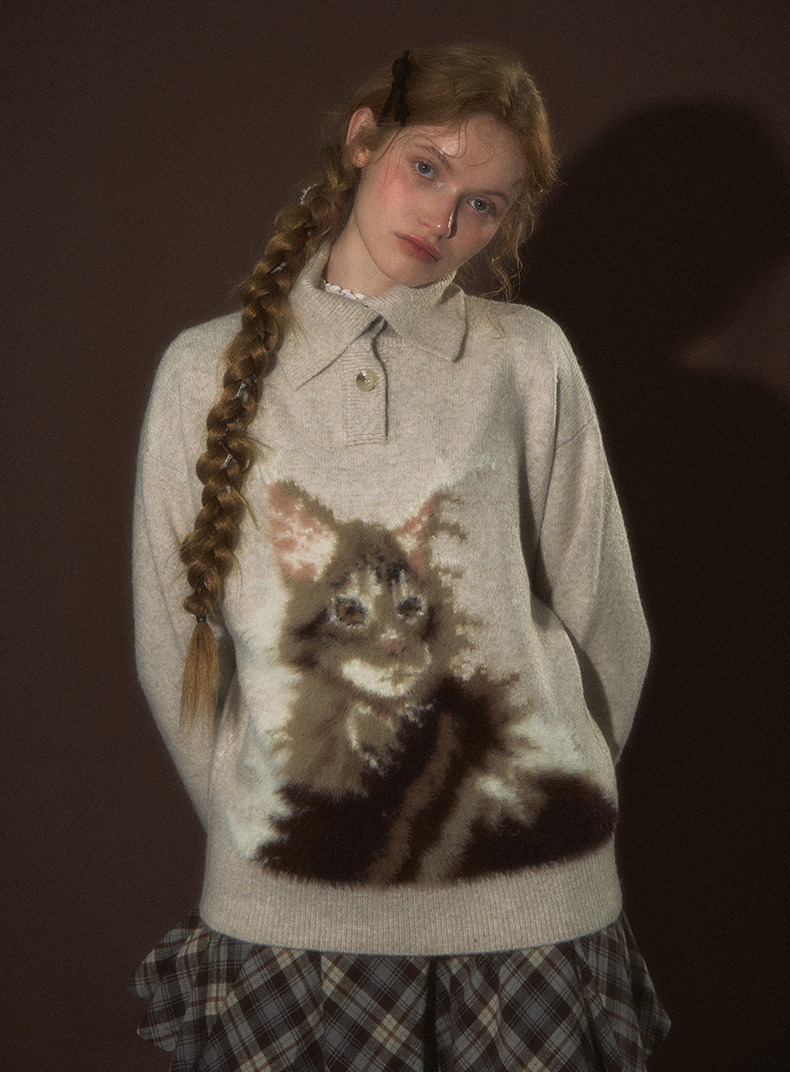 고양이 아트 그래픽과 부드러운 촉감이 매력적인 포인트 니트 스웨터입니다.