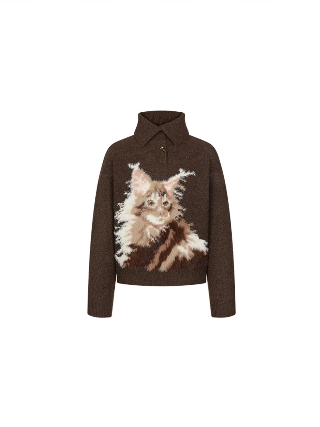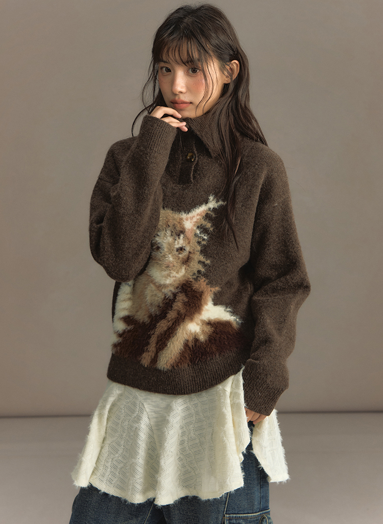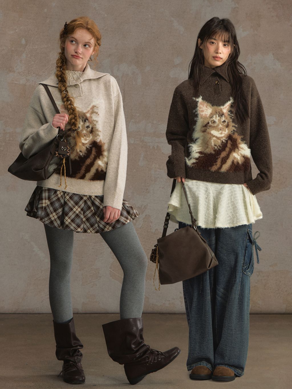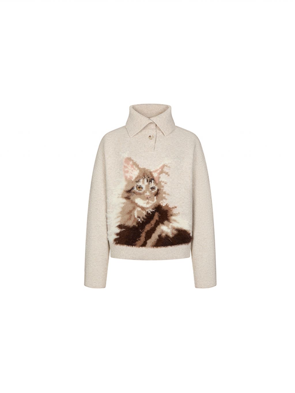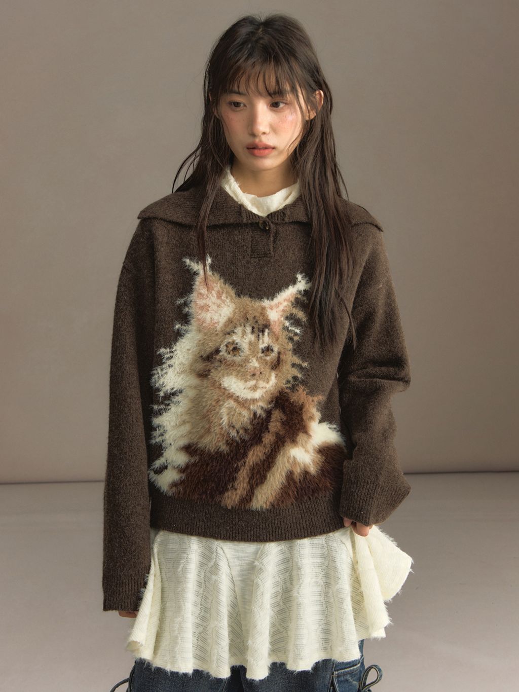 고양이 아트 그래픽과 부드러운 촉감이 매력적인 포인트 니트 스웨터입니다.