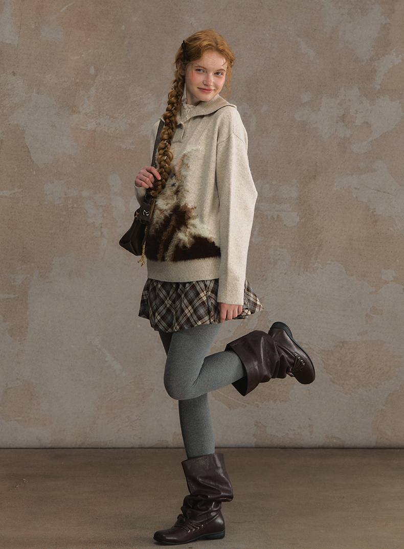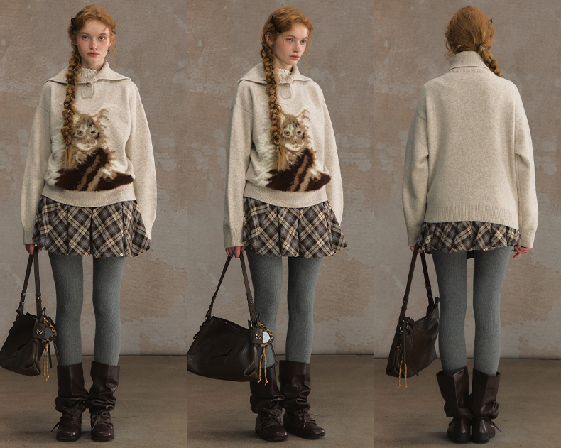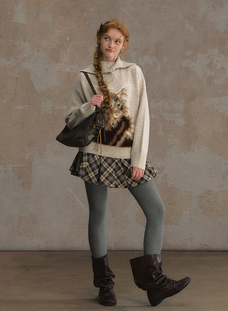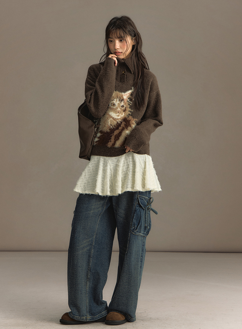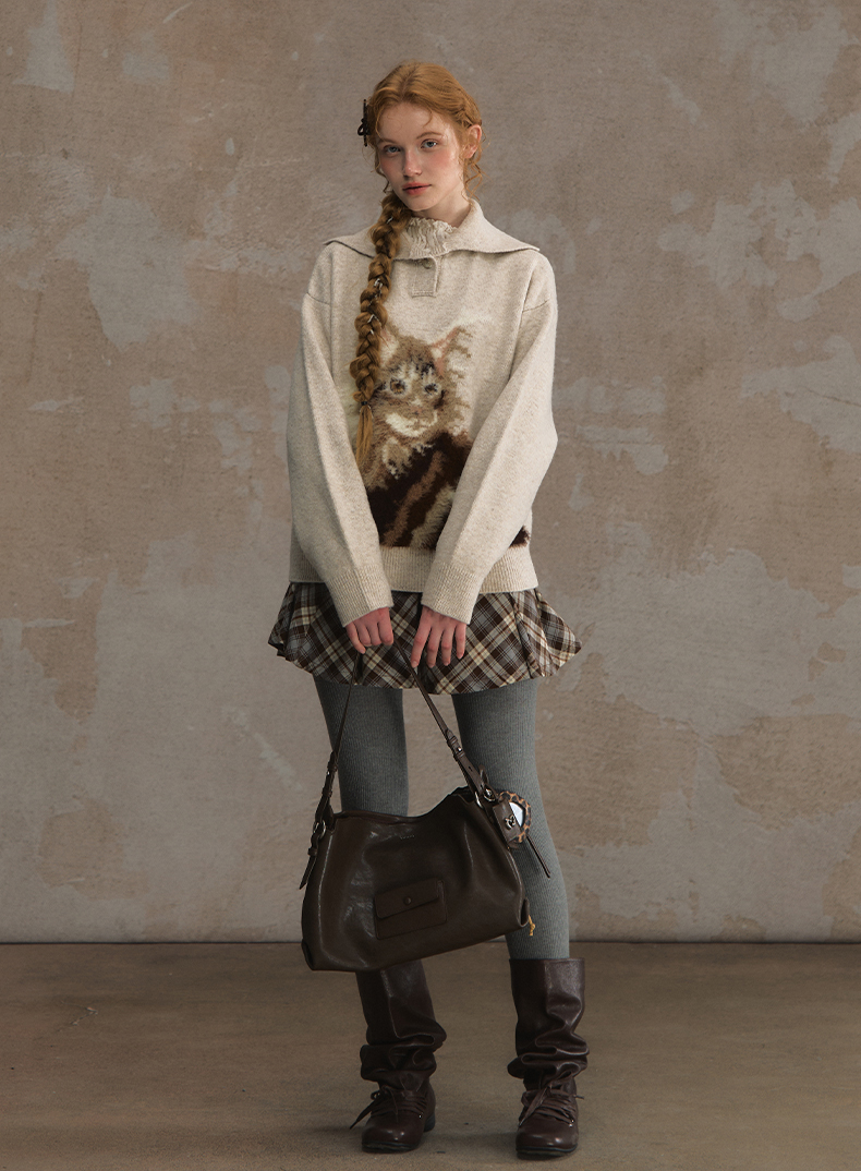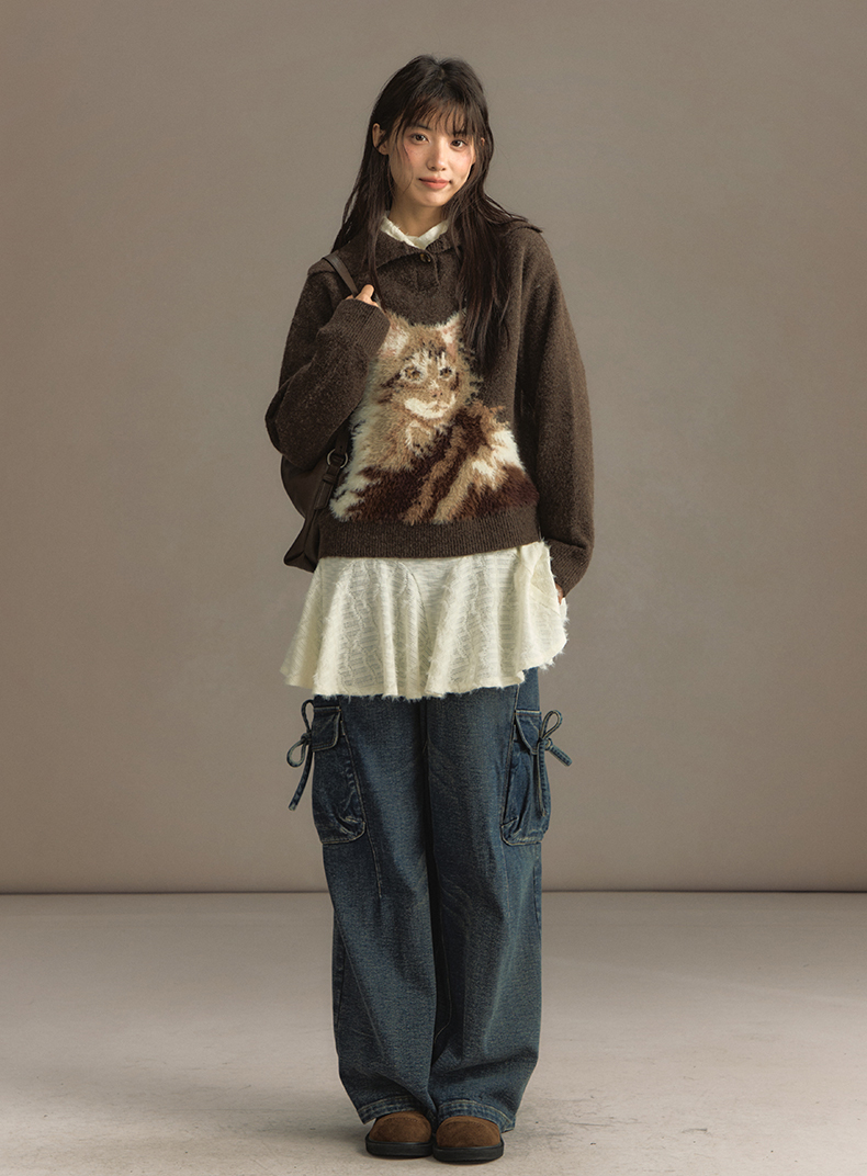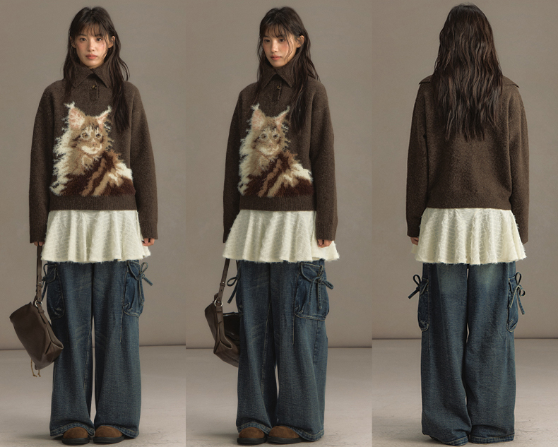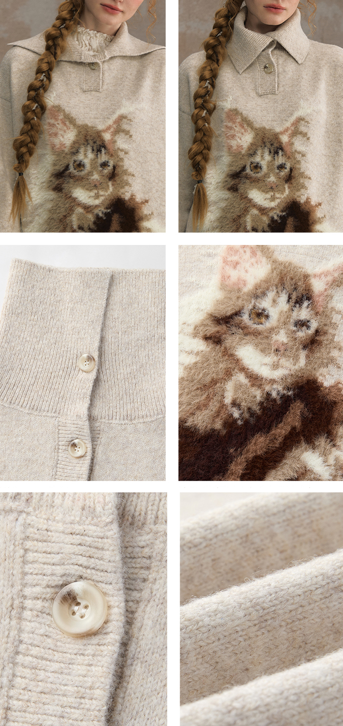 고양이 아트 그래픽과 부드러운 촉감이 매력적인 포인트 니트 스웨터입니다.