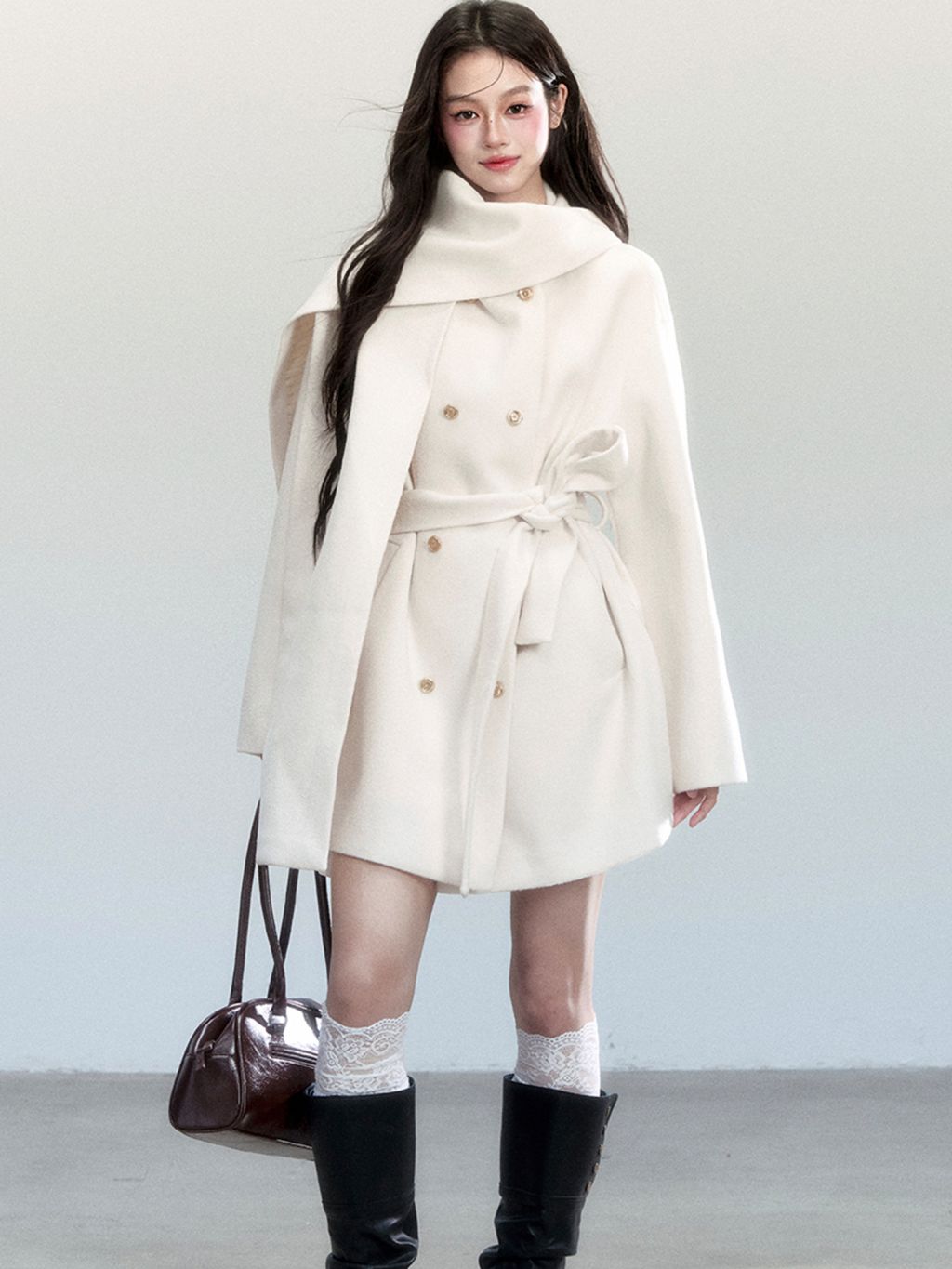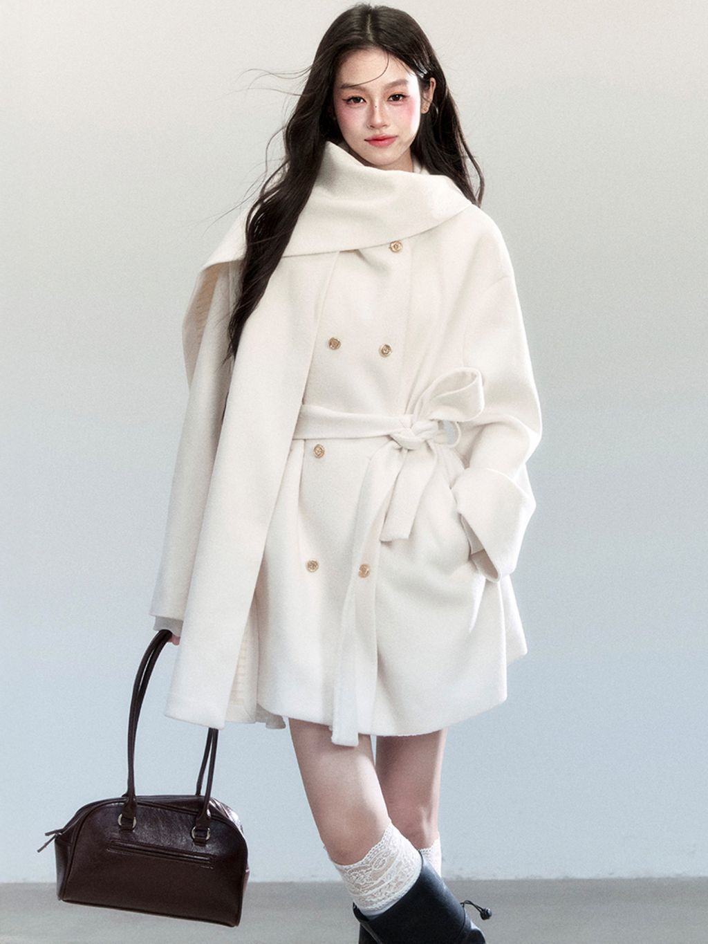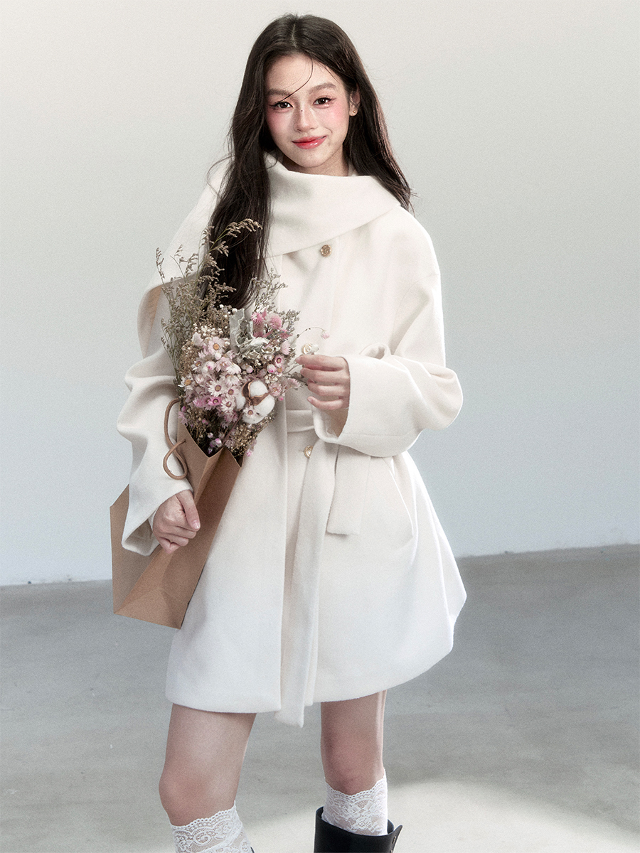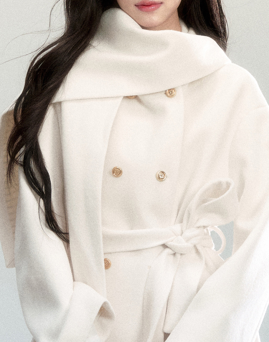 은은한 아이보리 컬러와 머플러 디테일이 조화를 이루며, 포근하고 우아한 윈터 무드를 완성하는 울 랩 코트입니다.