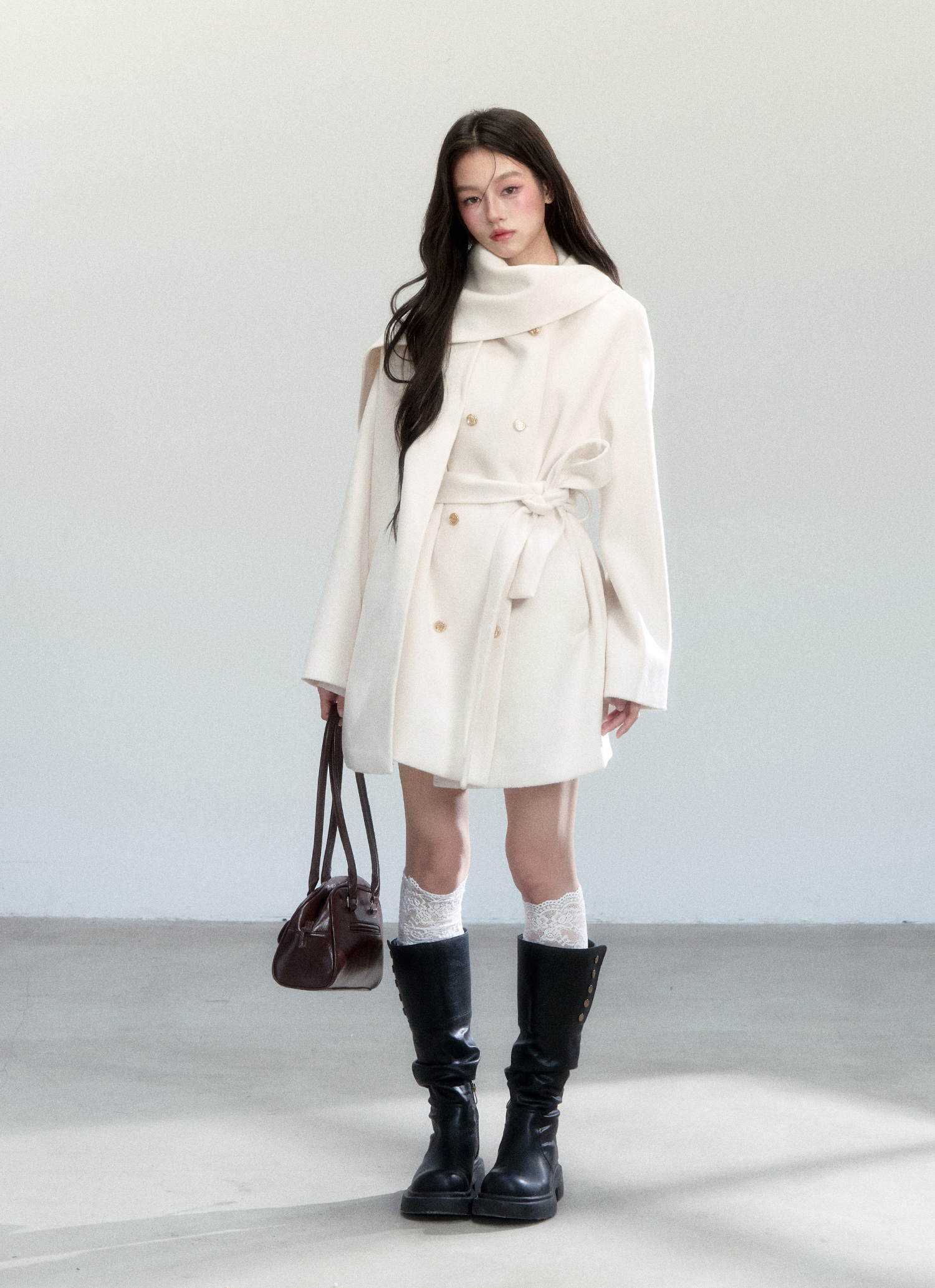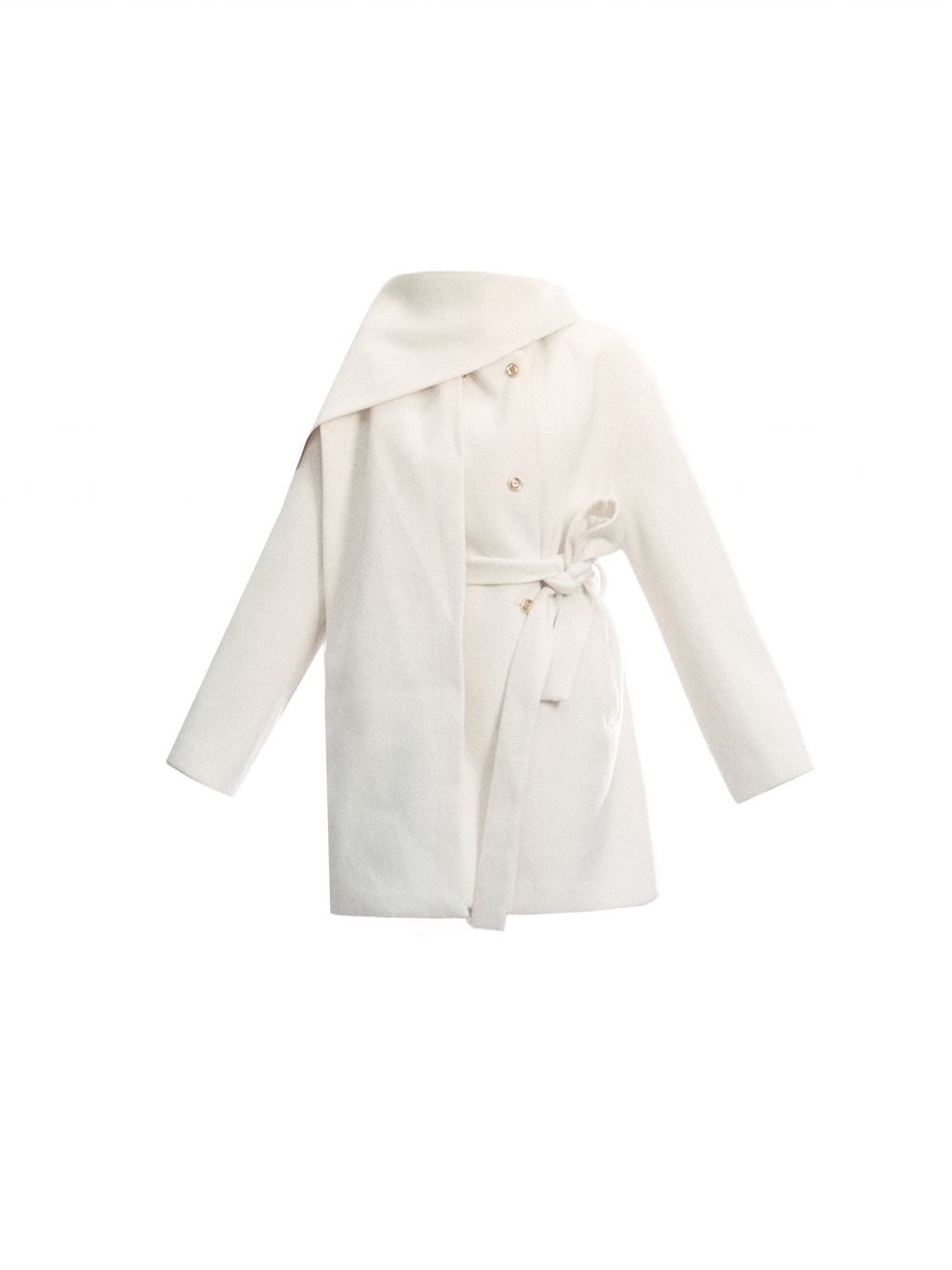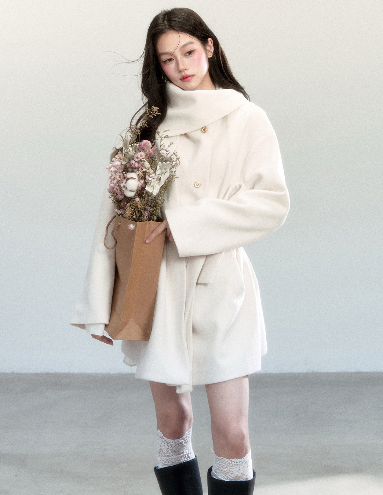 은은한 아이보리 컬러와 머플러 디테일이 조화를 이루며, 포근하고 우아한 윈터 무드를 완성하는 울 랩 코트입니다.