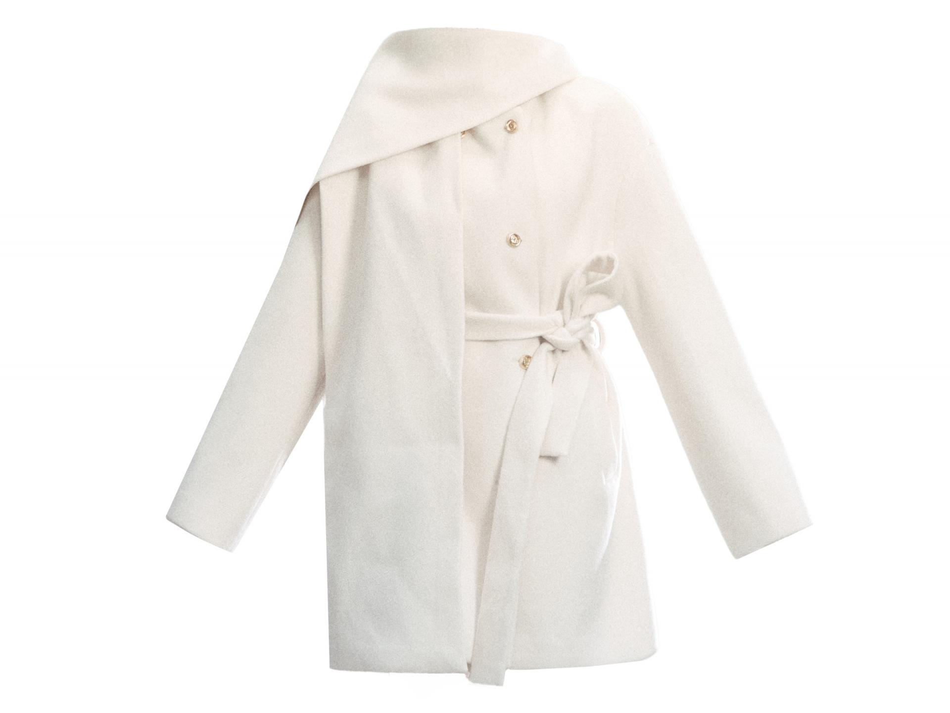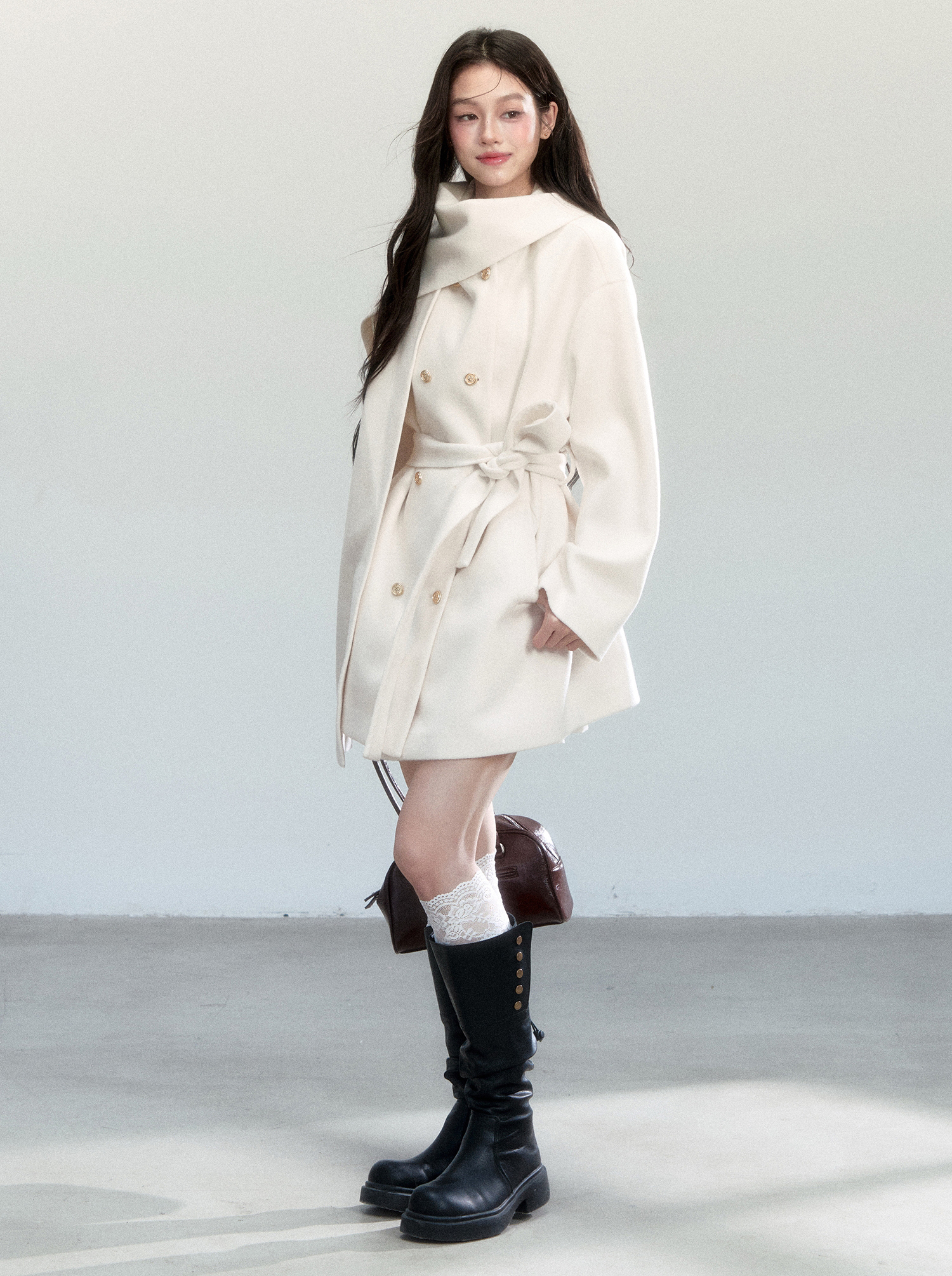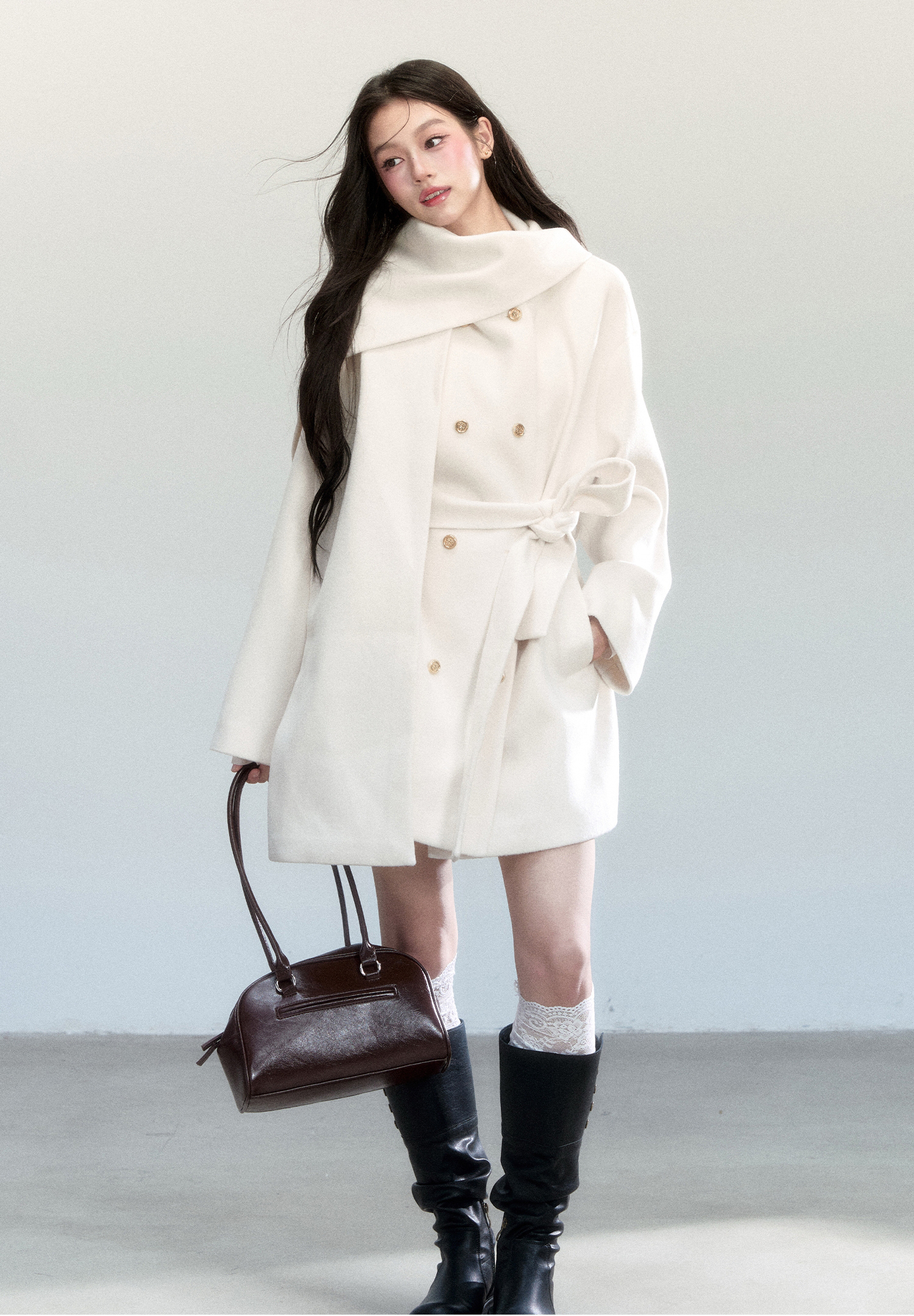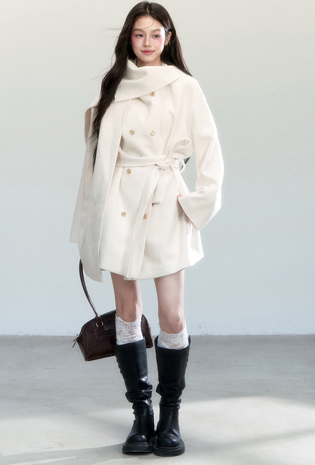 은은한 아이보리 컬러와 머플러 디테일이 조화를 이루며, 포근하고 우아한 윈터 무드를 완성하는 울 랩 코트입니다.