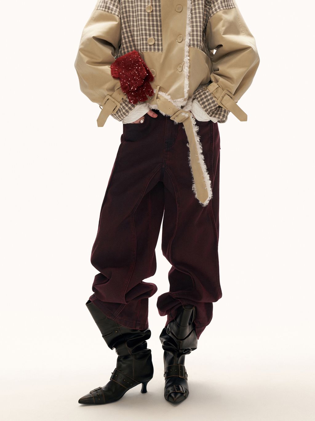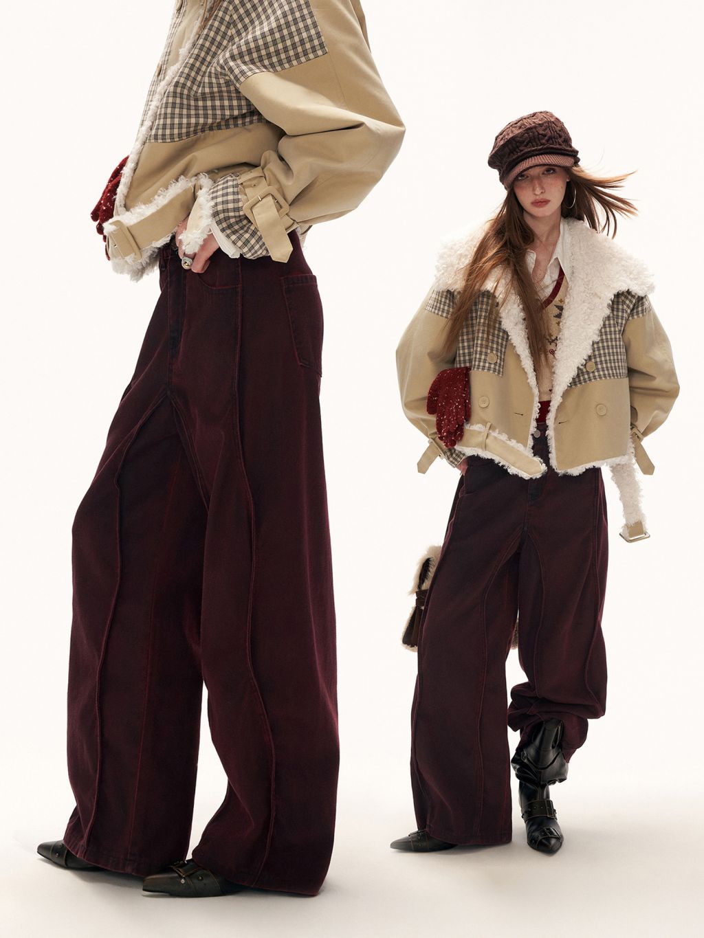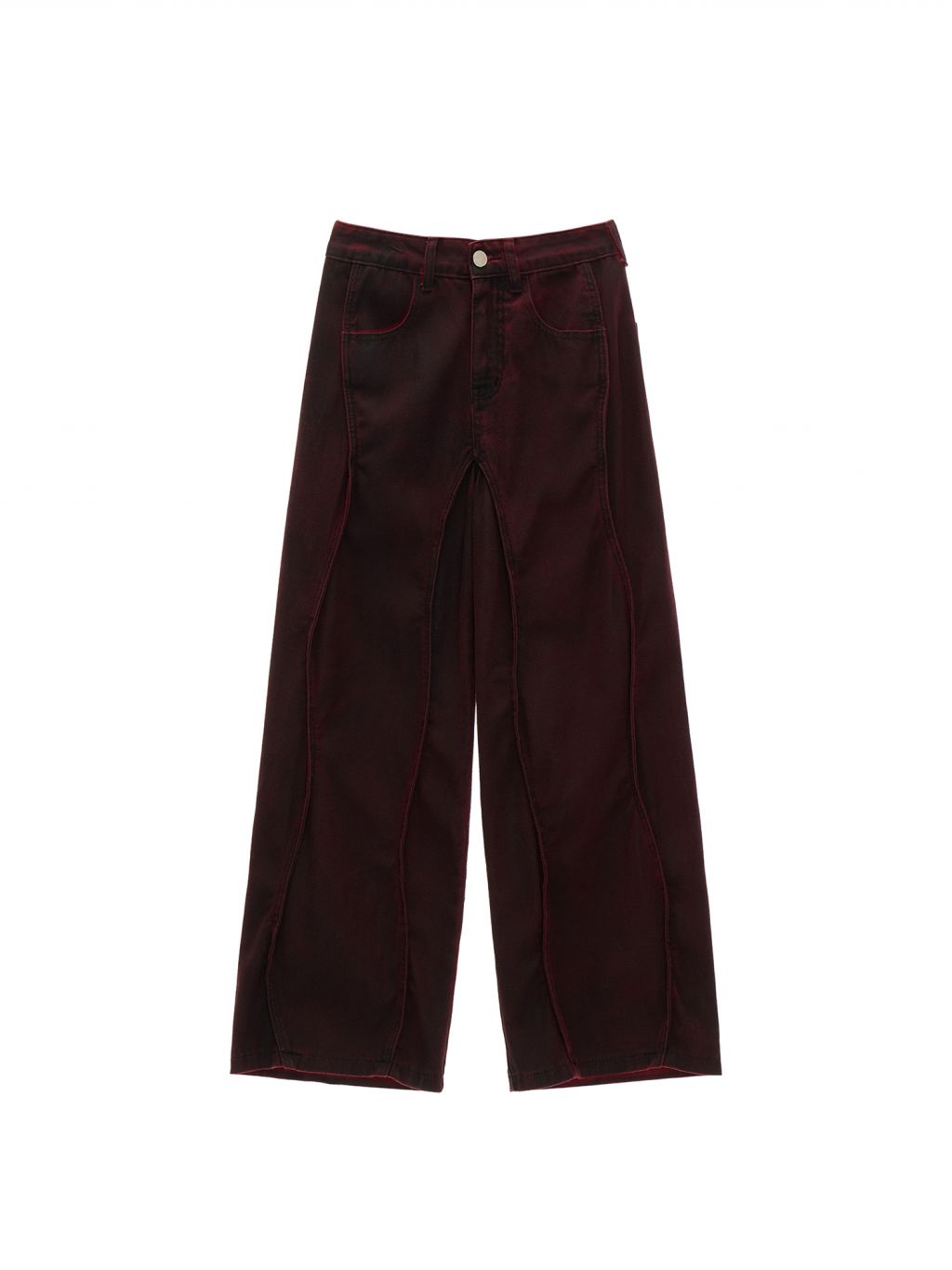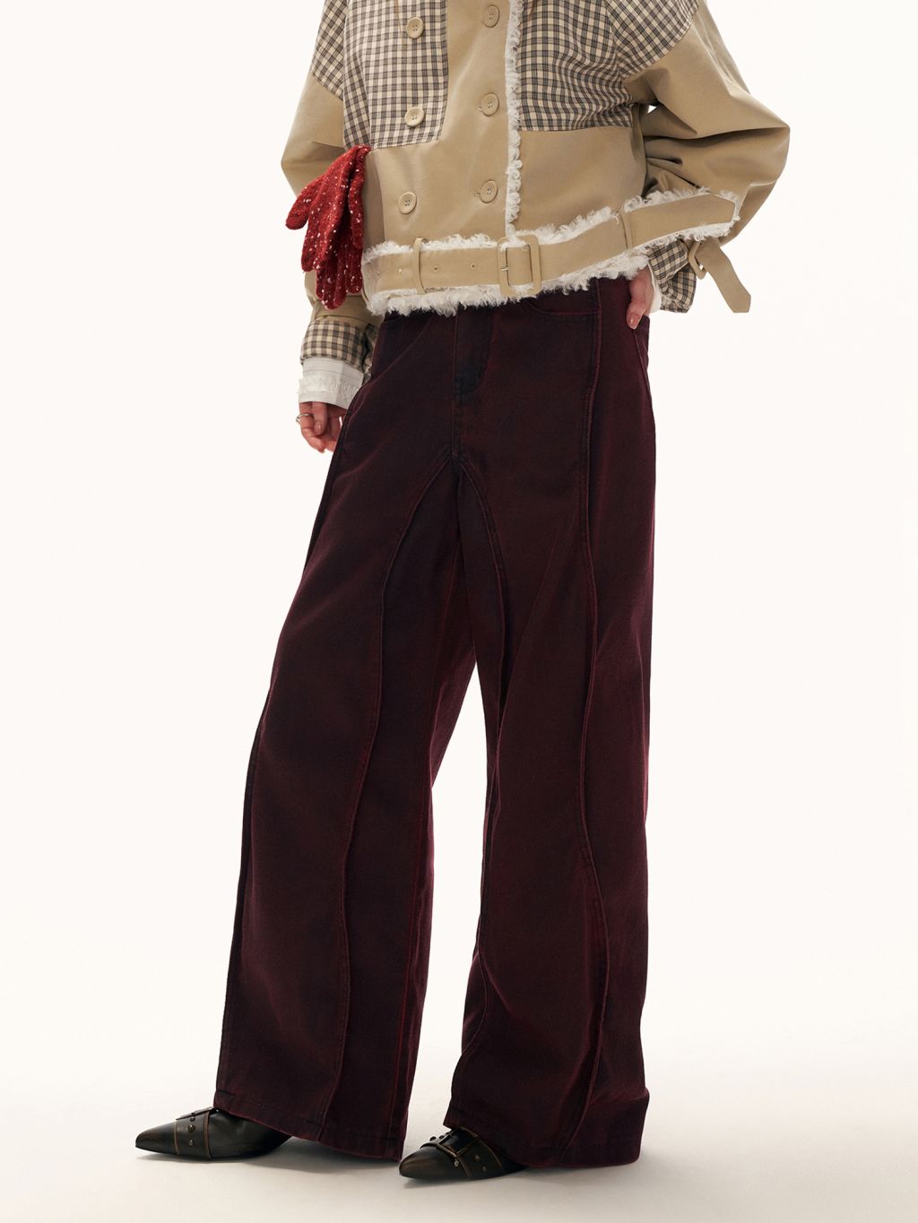아치형 절개 라인과 깊이 있는 버건디 컬러로 빈티지 무드의 실루엣을 완성한 와이드 팬츠입니다.