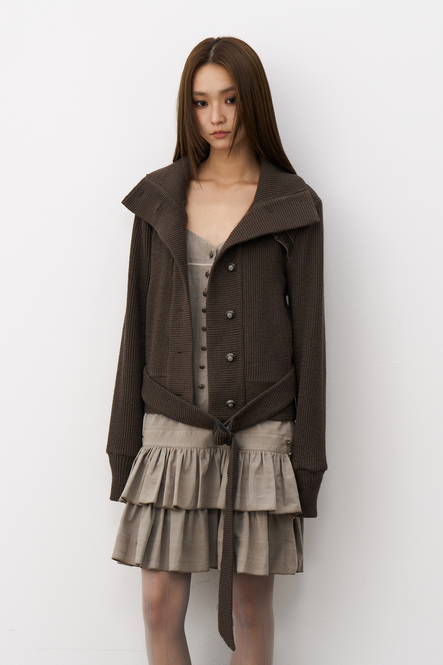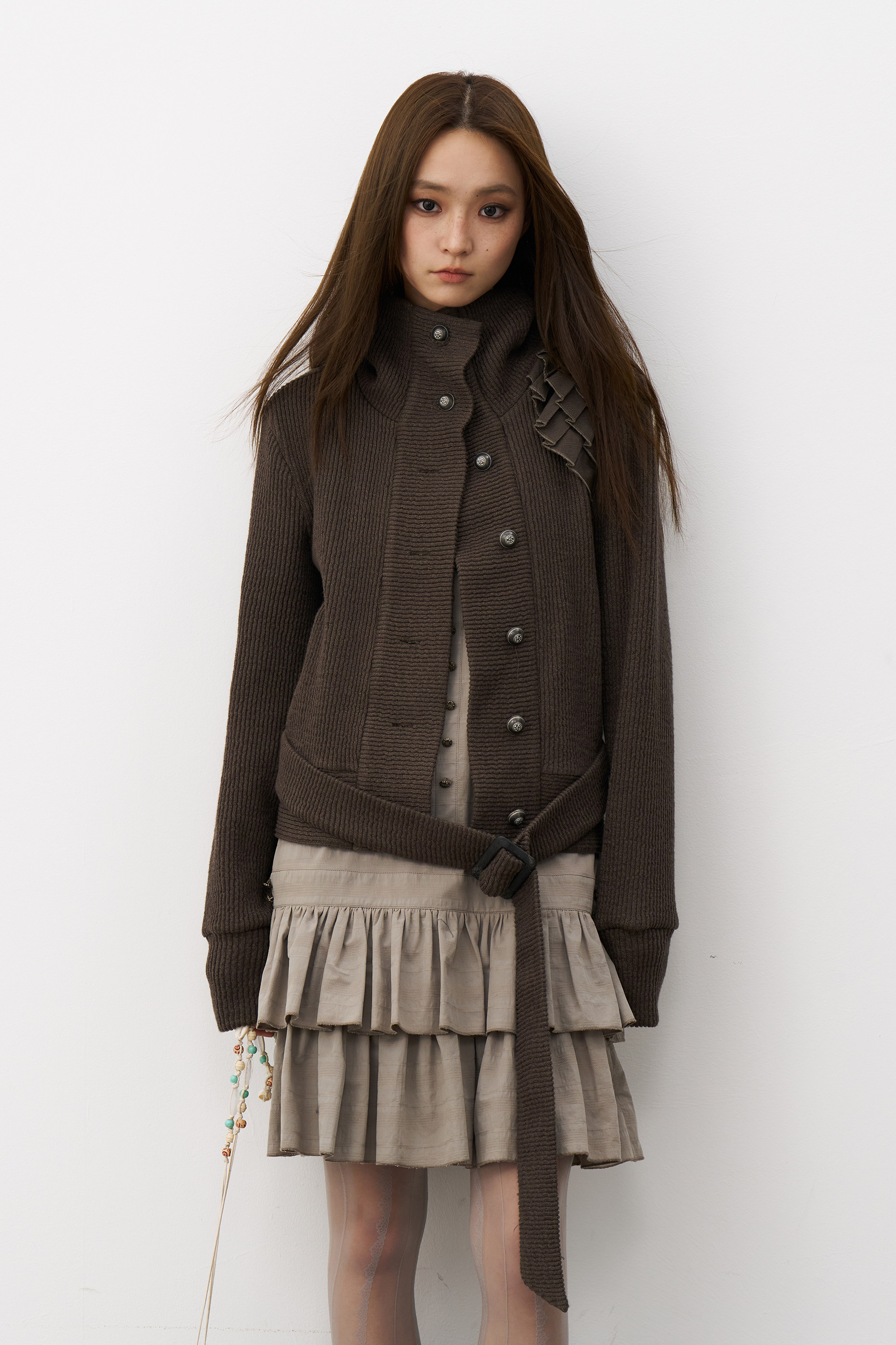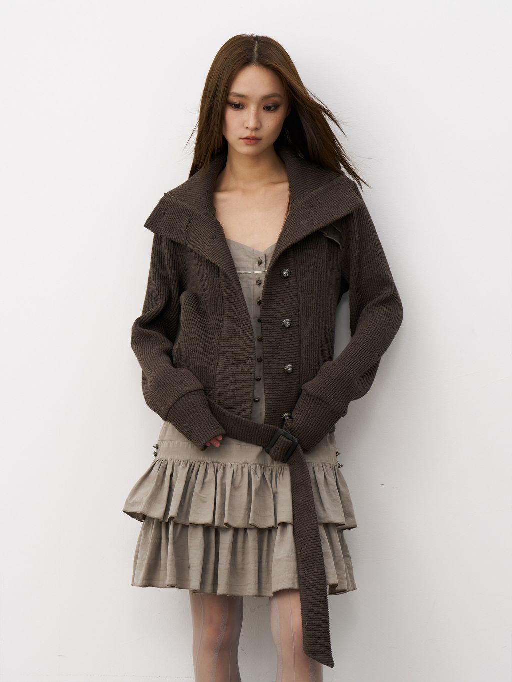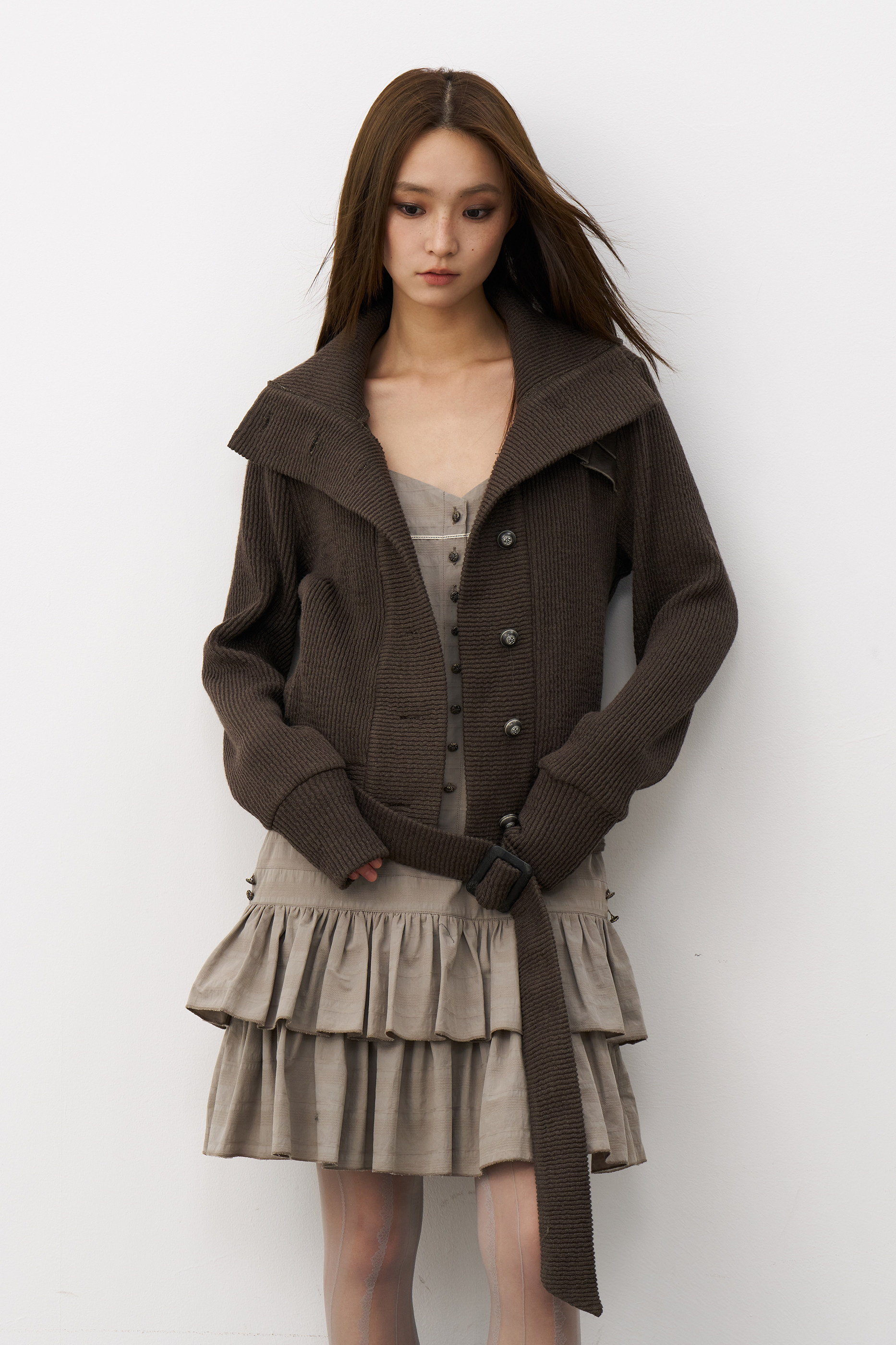 탄탄한 골지 니트 텍스처에 하이넥 버튼 클로징을 더해, 단정함과 빈티지 무드를 동시에 잡은 니트 자켓입니다. 어깨의 레이어드 플리츠 패널과 버클 벨트 디테일이 룩의 포인트를 확실하게 만들어줍니다.