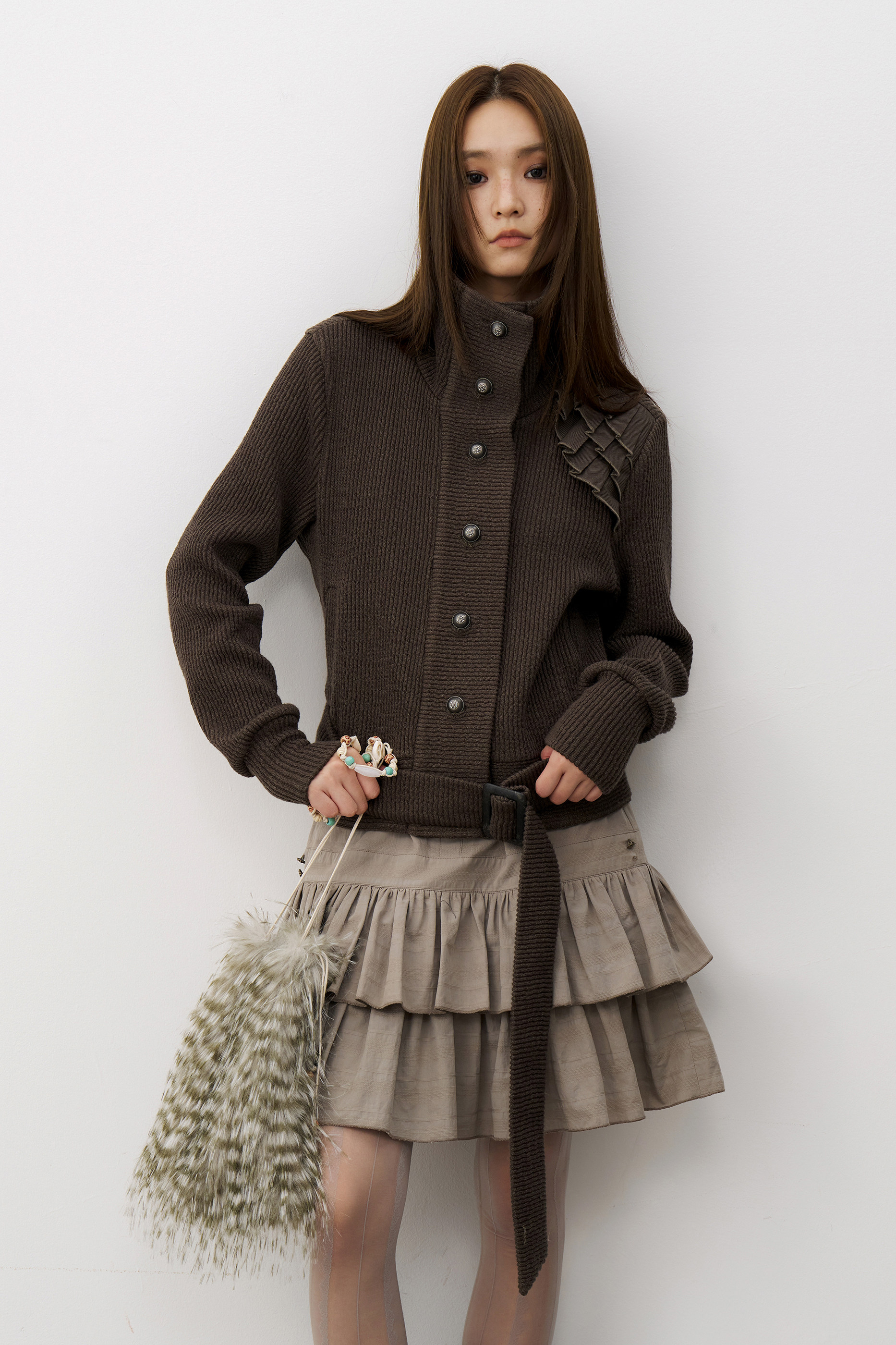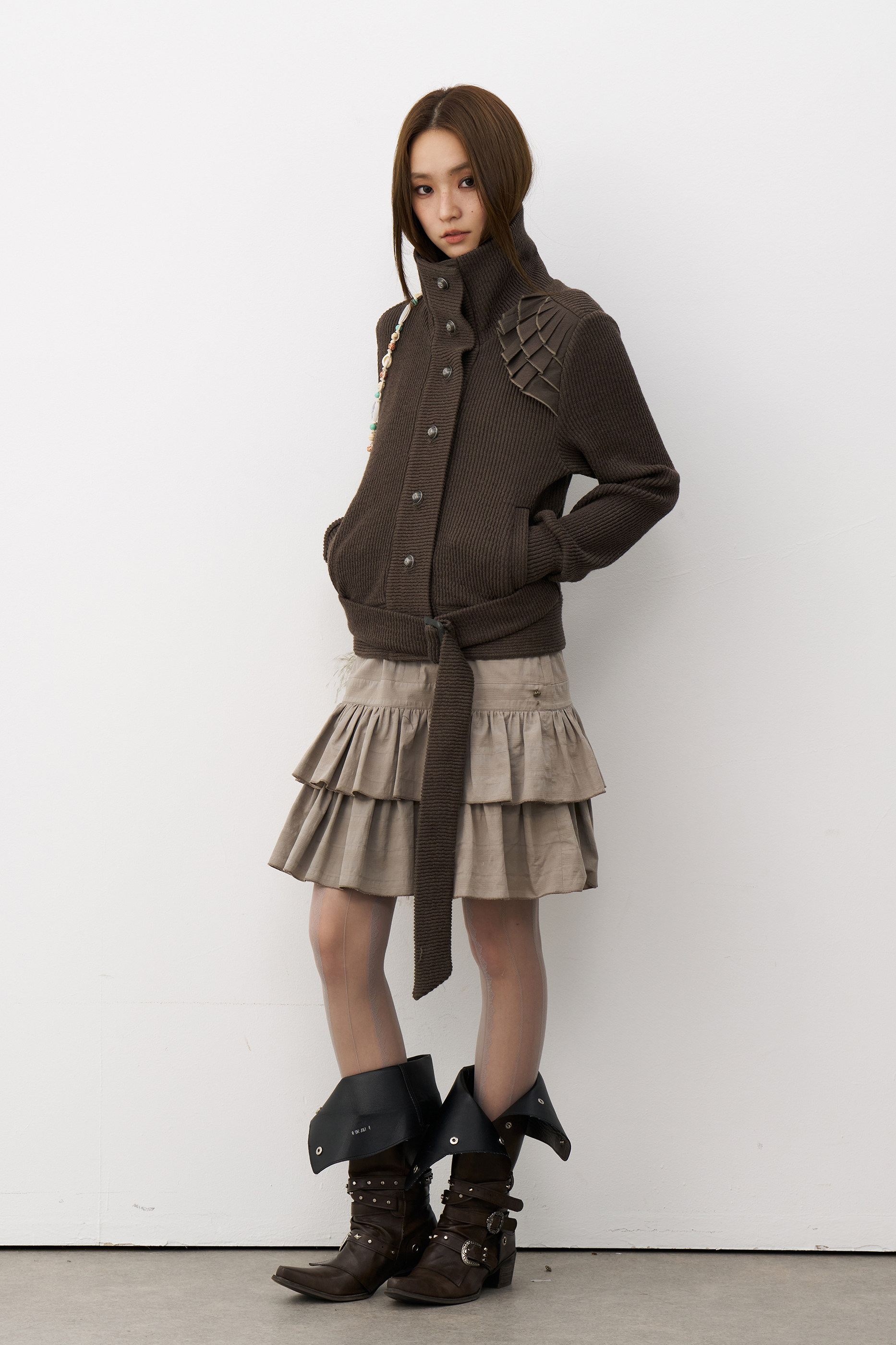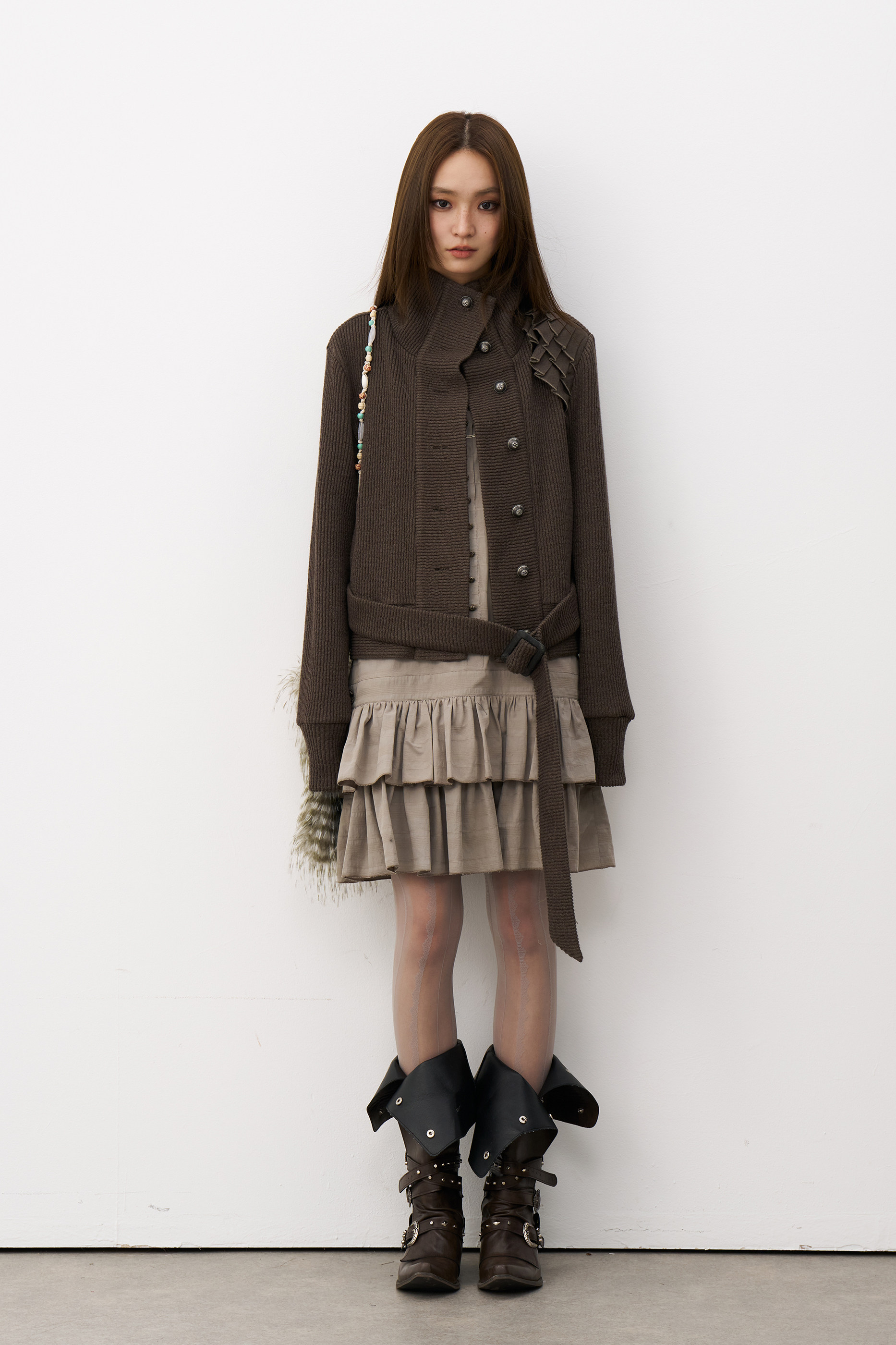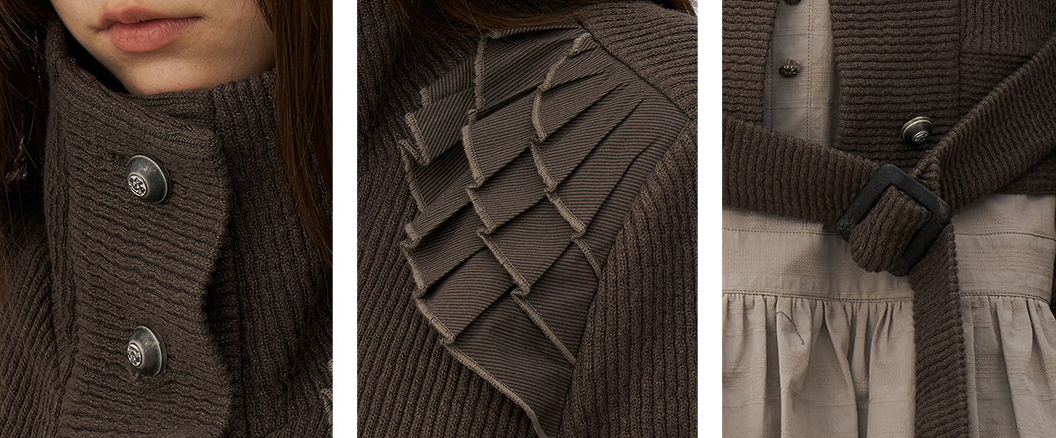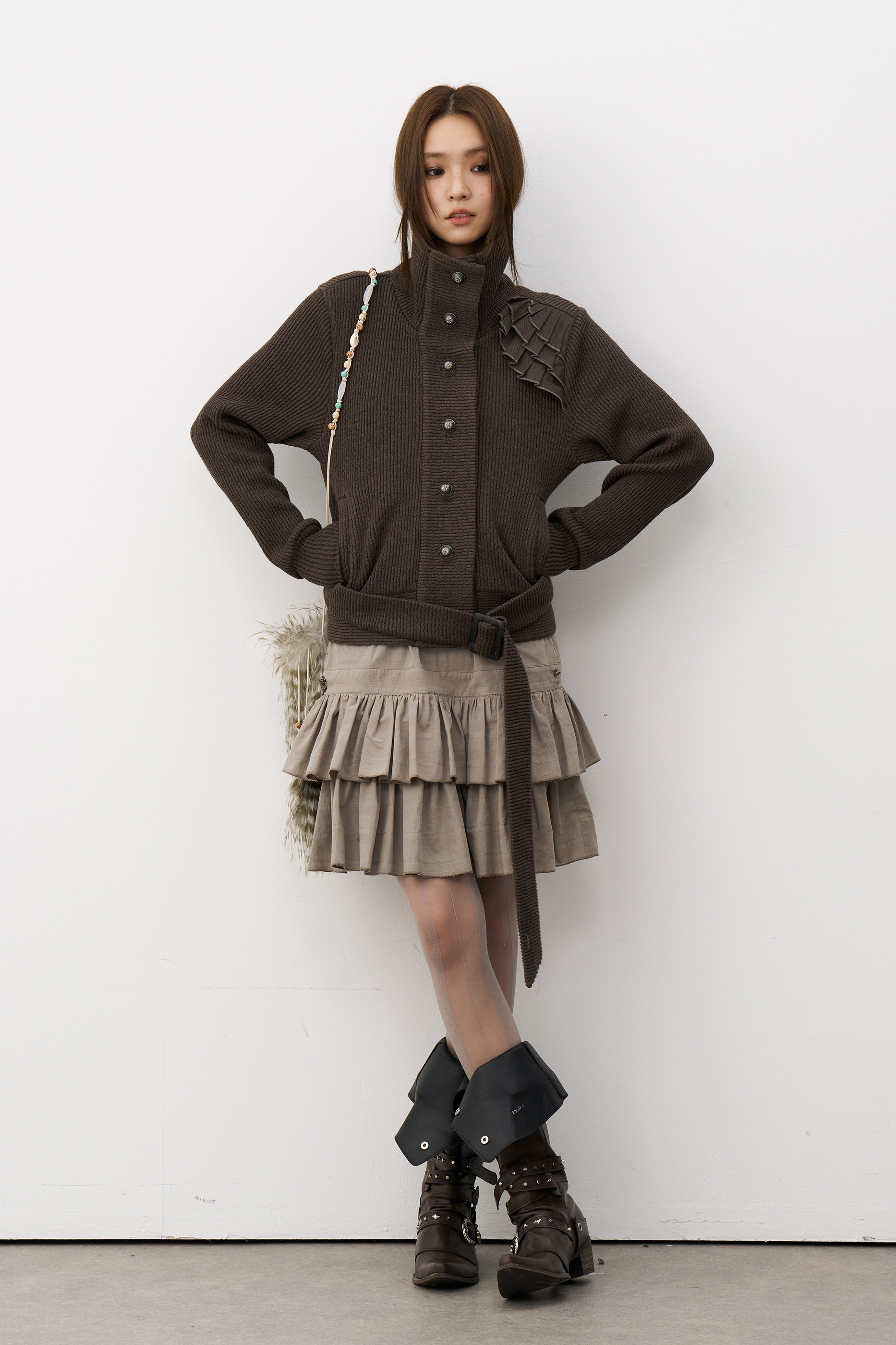 탄탄한 골지 니트 텍스처에 하이넥 버튼 클로징을 더해, 단정함과 빈티지 무드를 동시에 잡은 니트 자켓입니다. 어깨의 레이어드 플리츠 패널과 버클 벨트 디테일이 룩의 포인트를 확실하게 만들어줍니다.