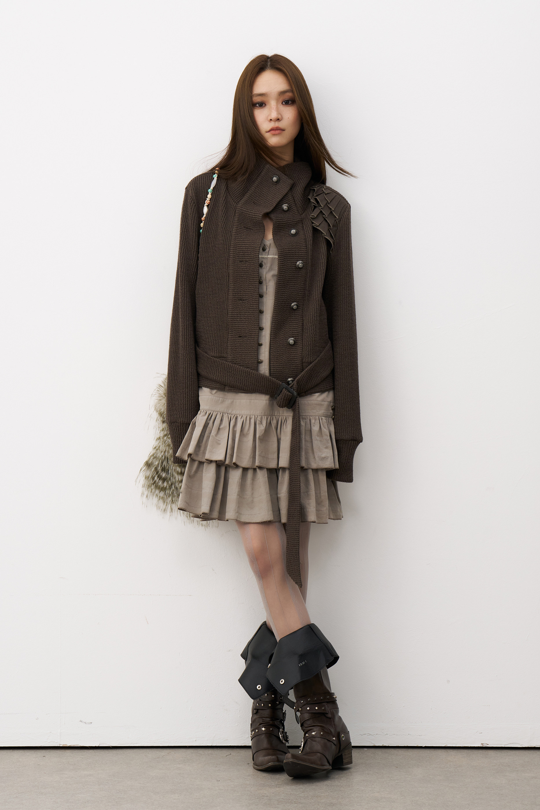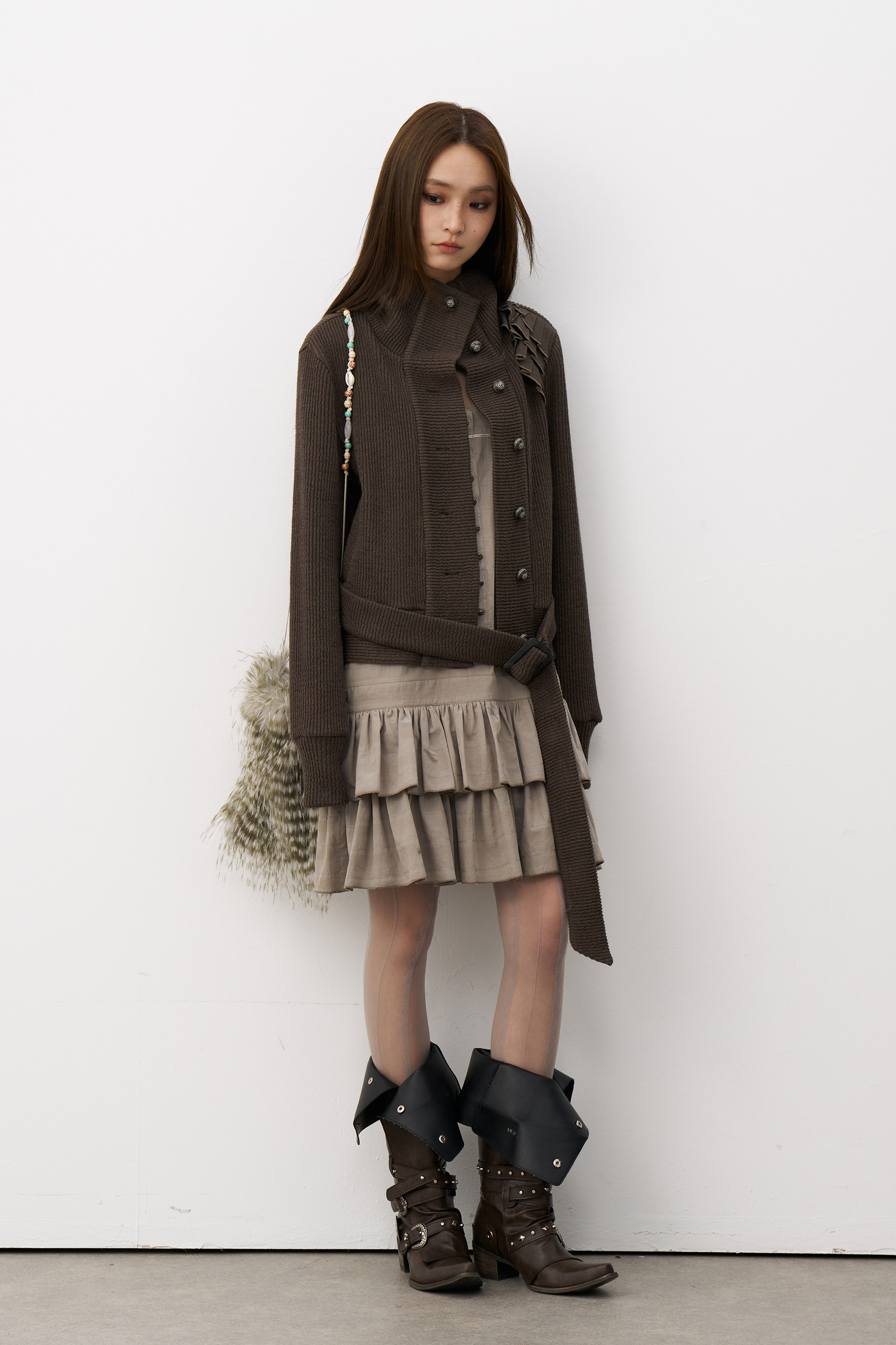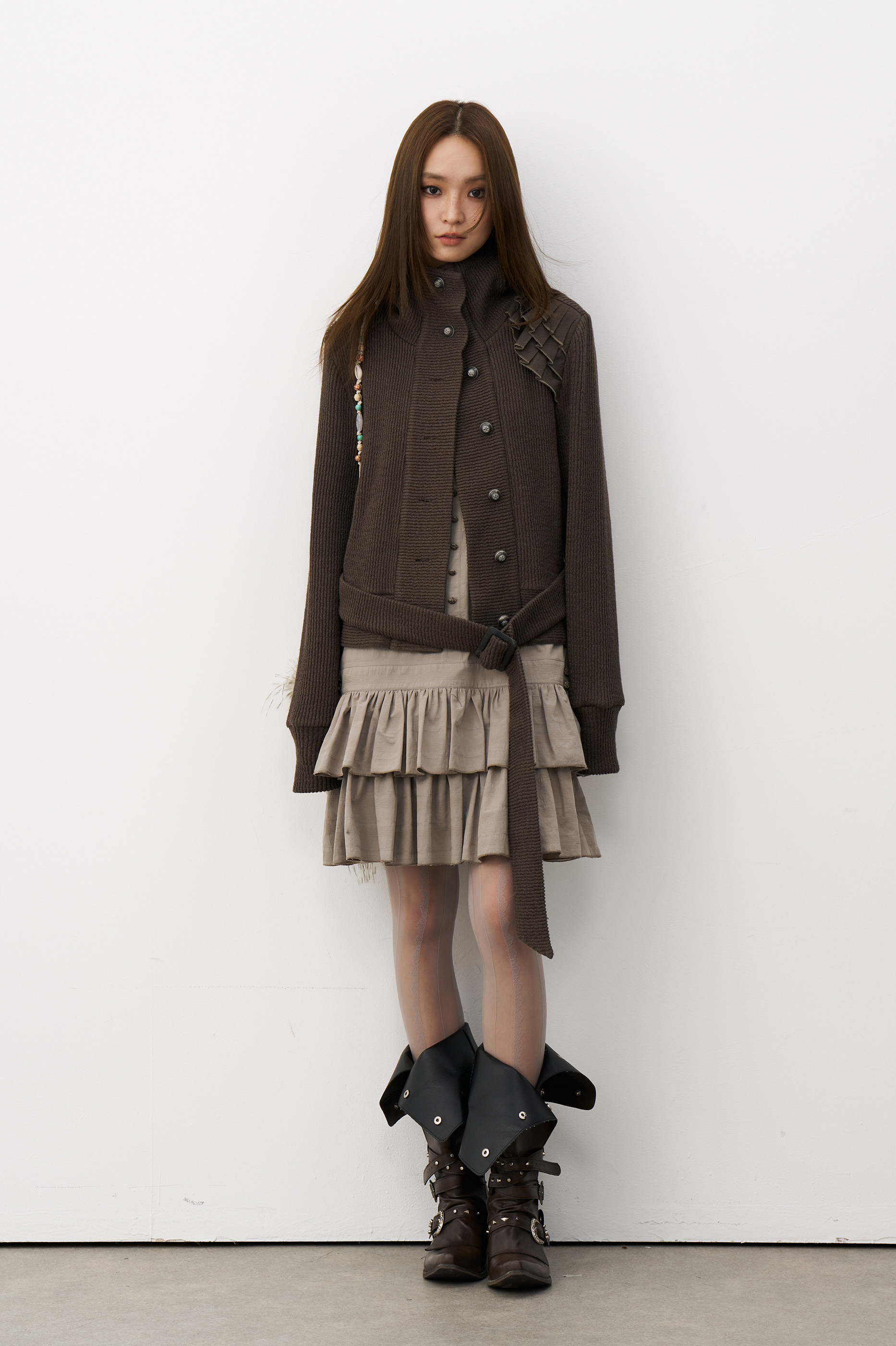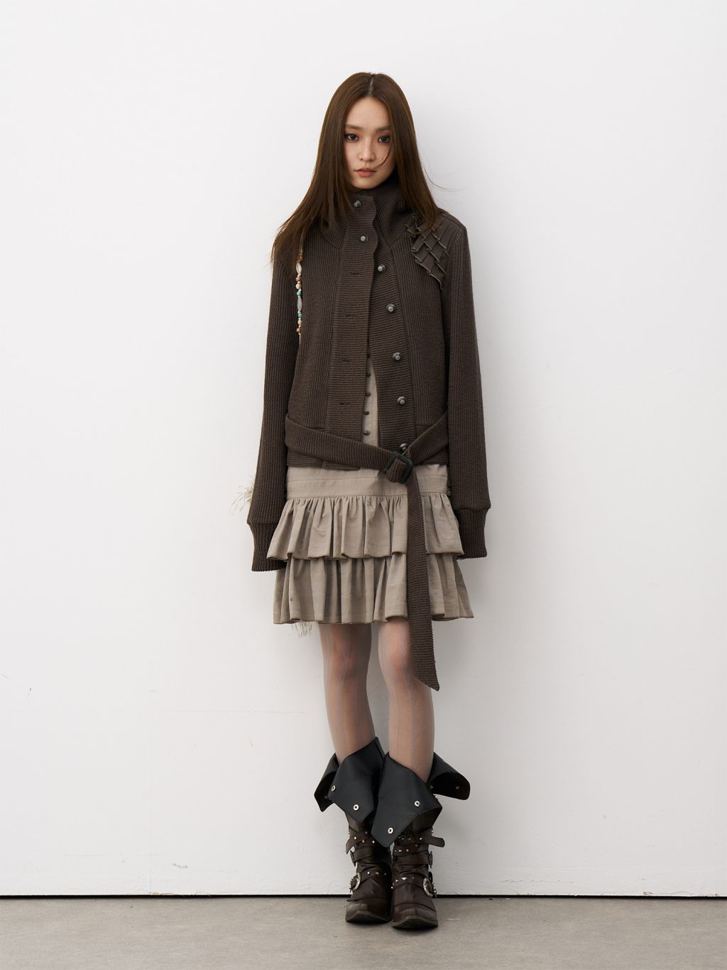 탄탄한 골지 니트 텍스처에 하이넥 버튼 클로징을 더해, 단정함과 빈티지 무드를 동시에 잡은 니트 자켓입니다. 어깨의 레이어드 플리츠 패널과 버클 벨트 디테일이 룩의 포인트를 확실하게 만들어줍니다.