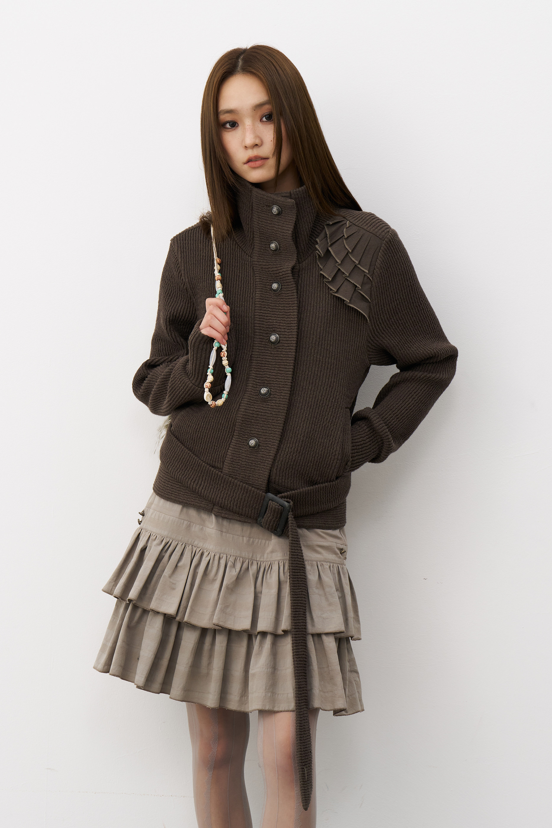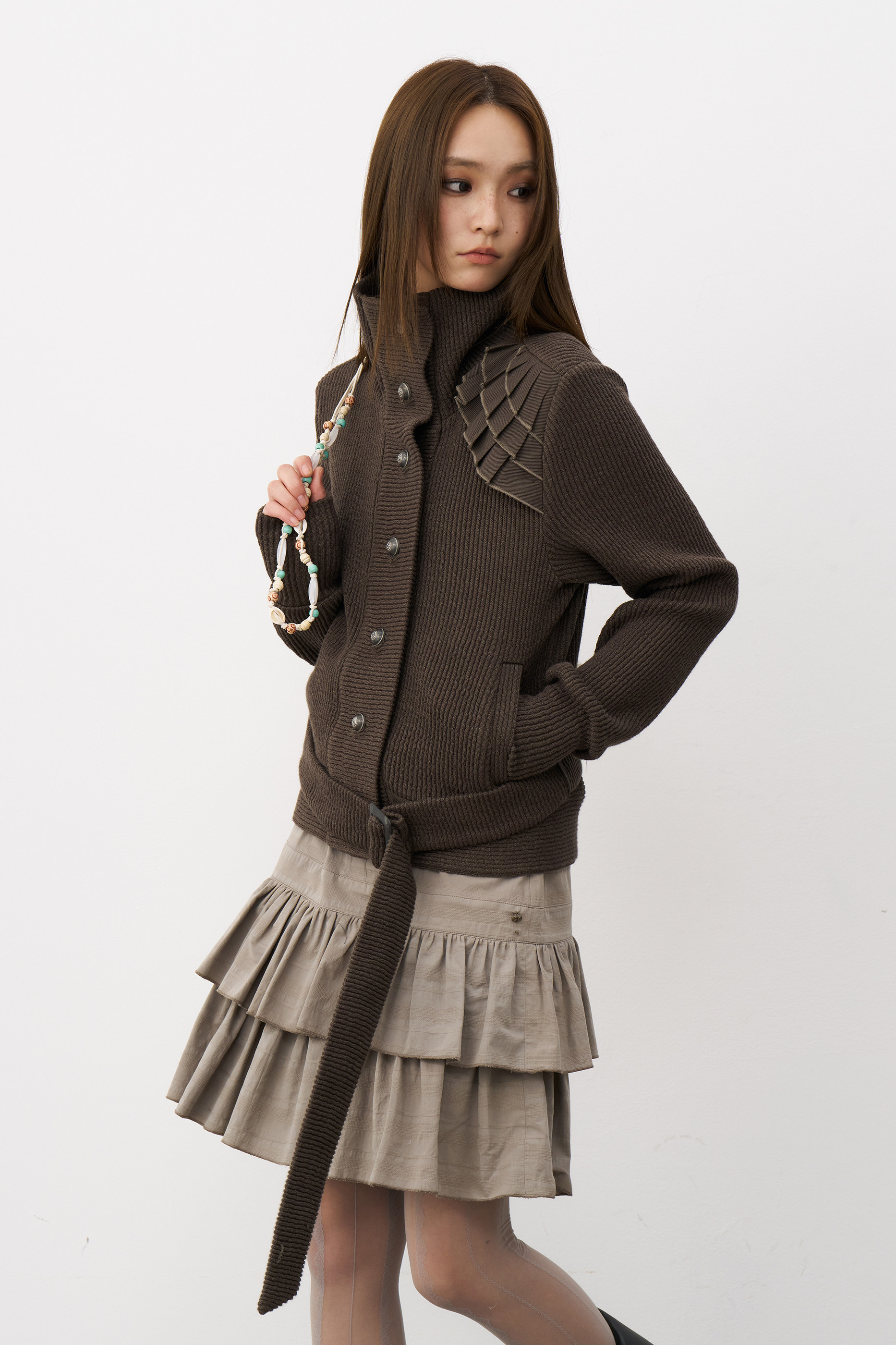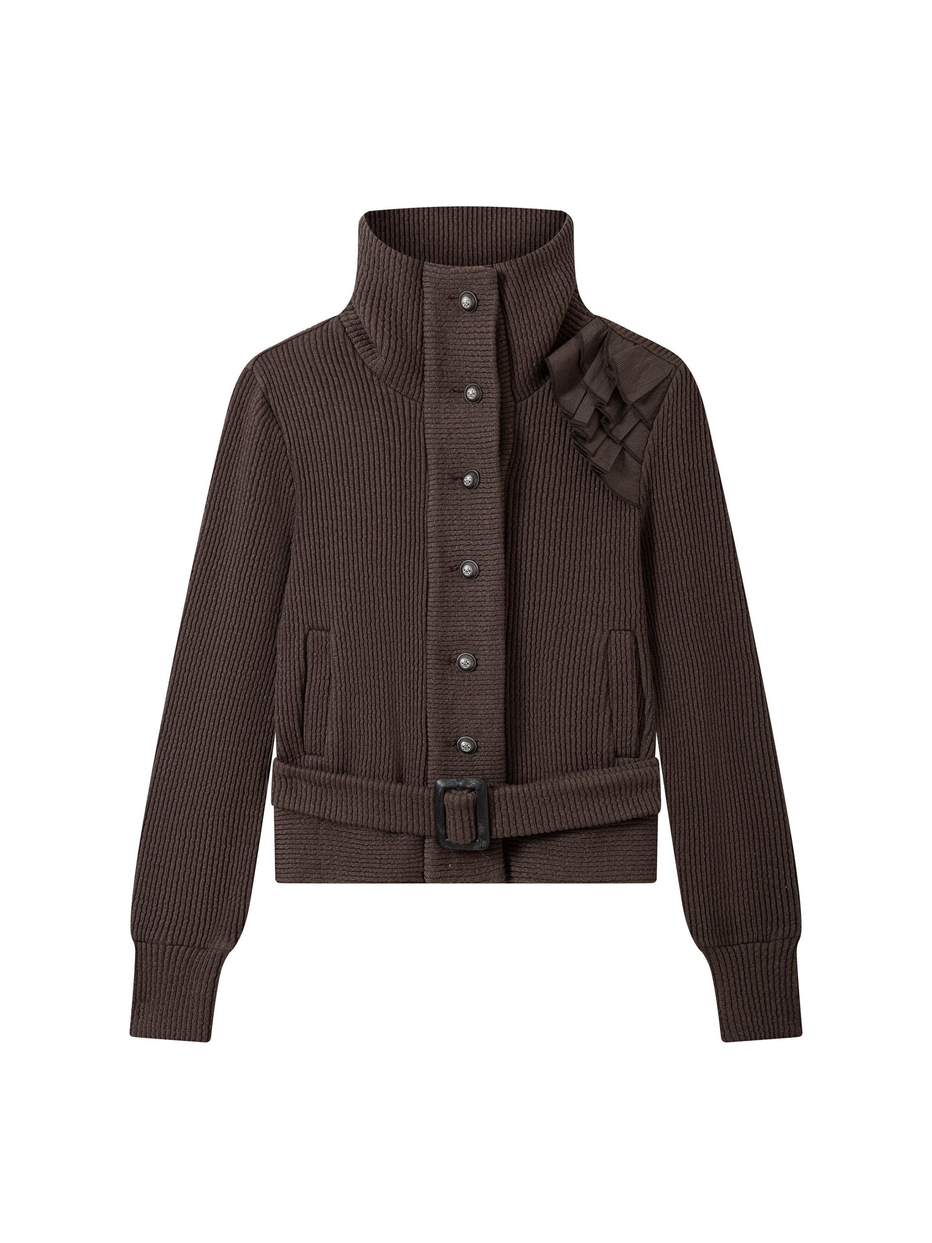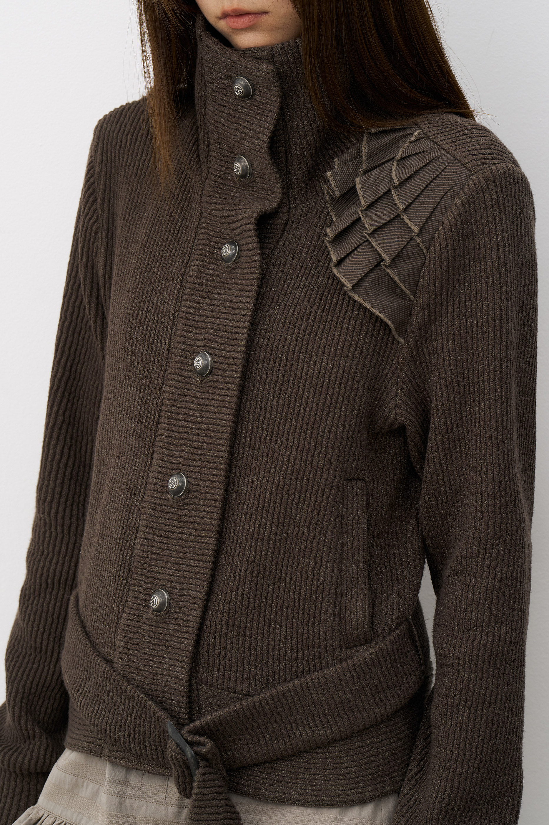 Cocoa Pleat-Shoulder Belted Knit Jacket