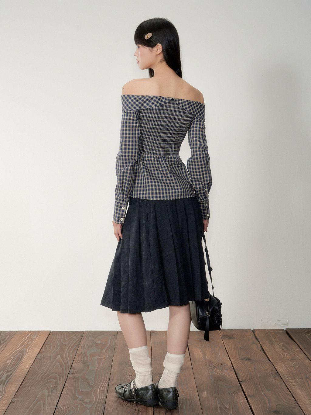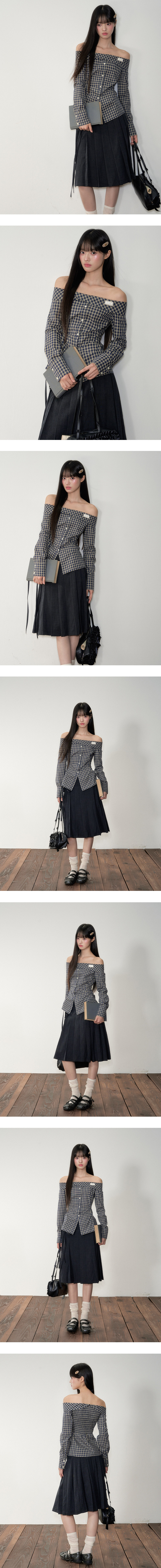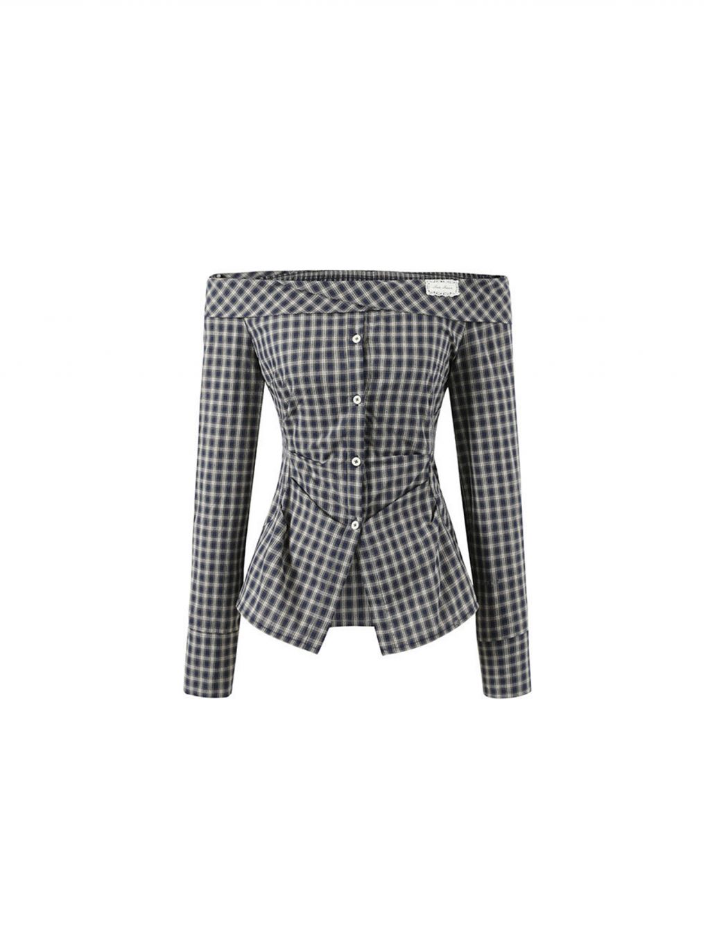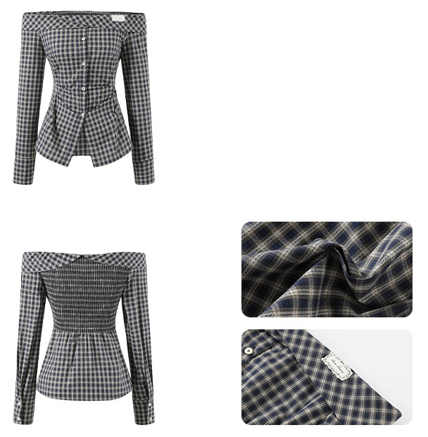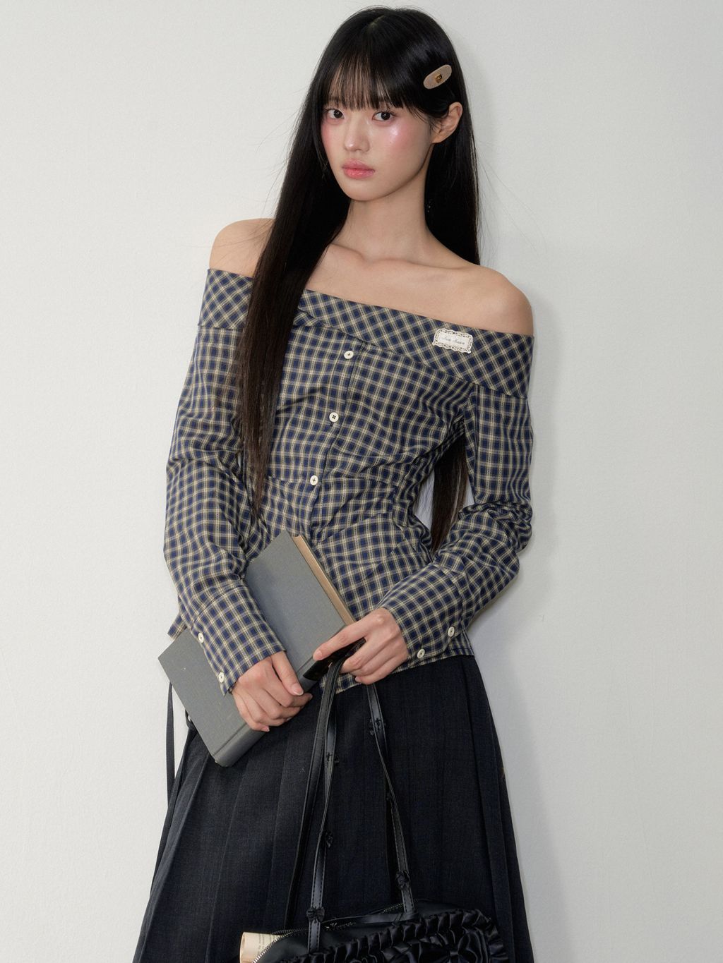 단정한 체크 셔츠를 일부러 비틀어, 어깨를 드러낸 리디큘러스식 오프숄더 탑입니다.