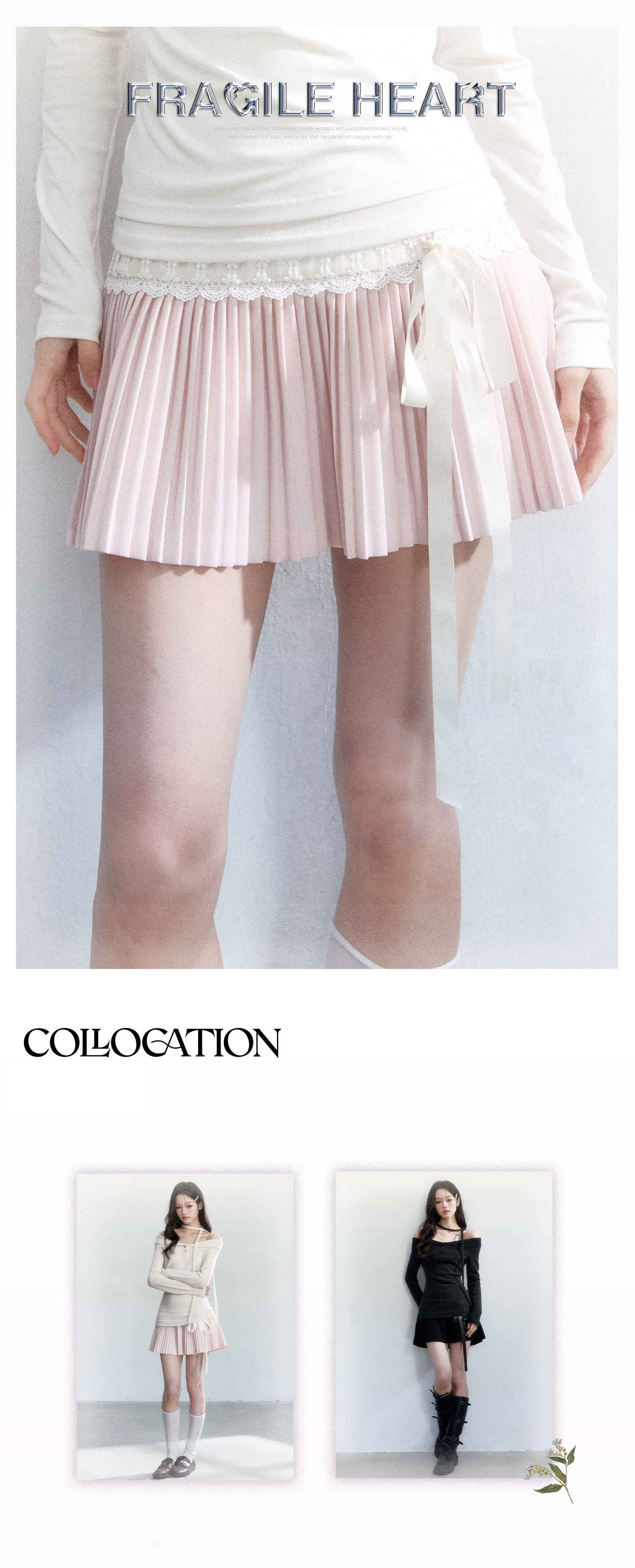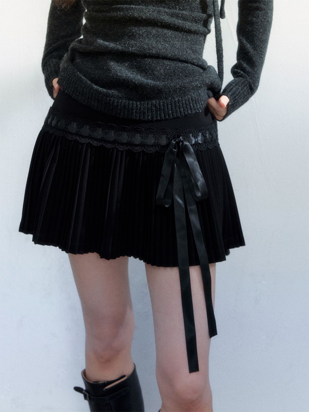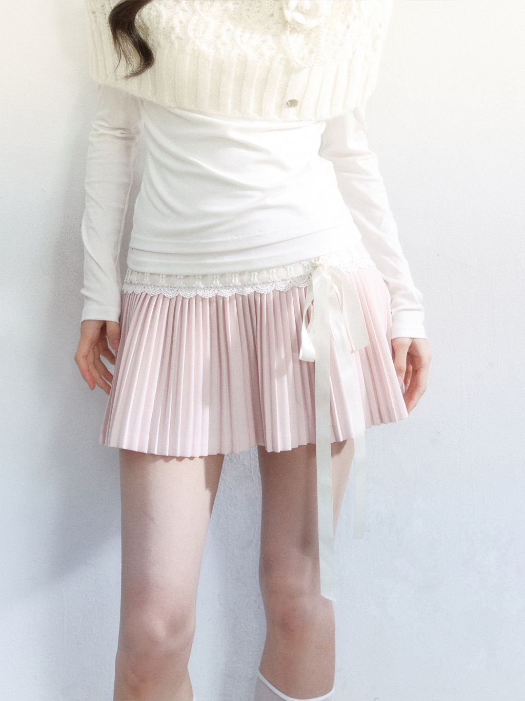 레이스 트리밍 허리선과 길게 떨어지는 리본 디테일이 룩의 무드를 한 번에 완성하는 플리츠 미니 스커트입니다. 가볍게 퍼지는 A라인 실루엣으로 다리 라인이 더 길어 보이게 연출됩니다.