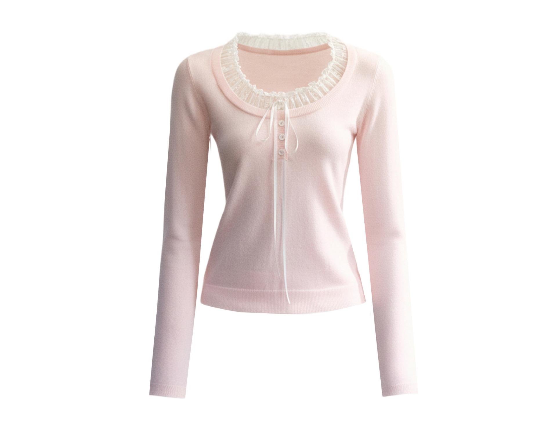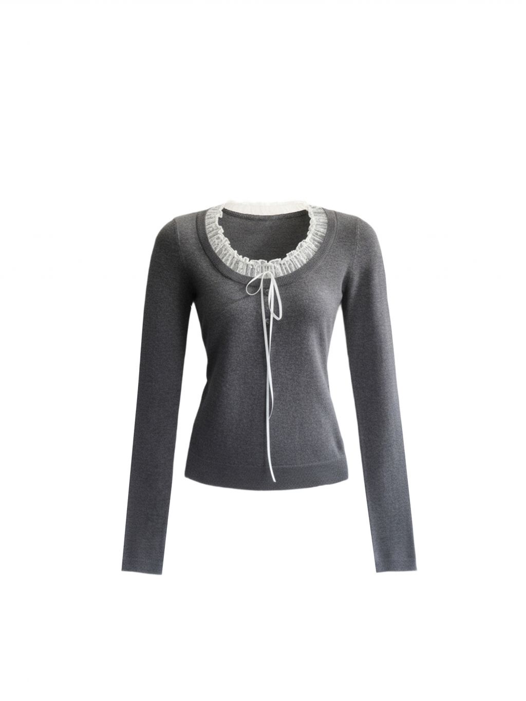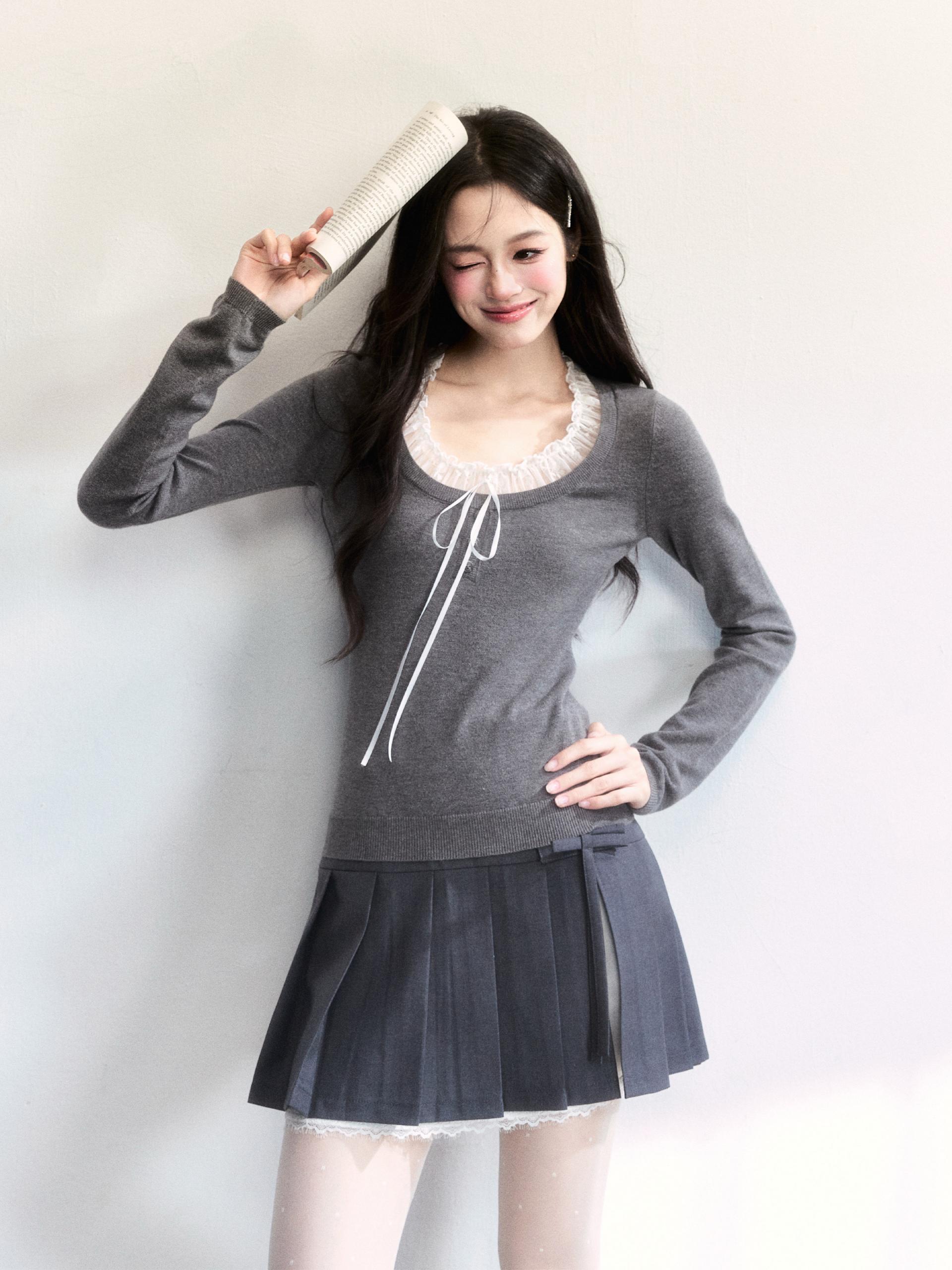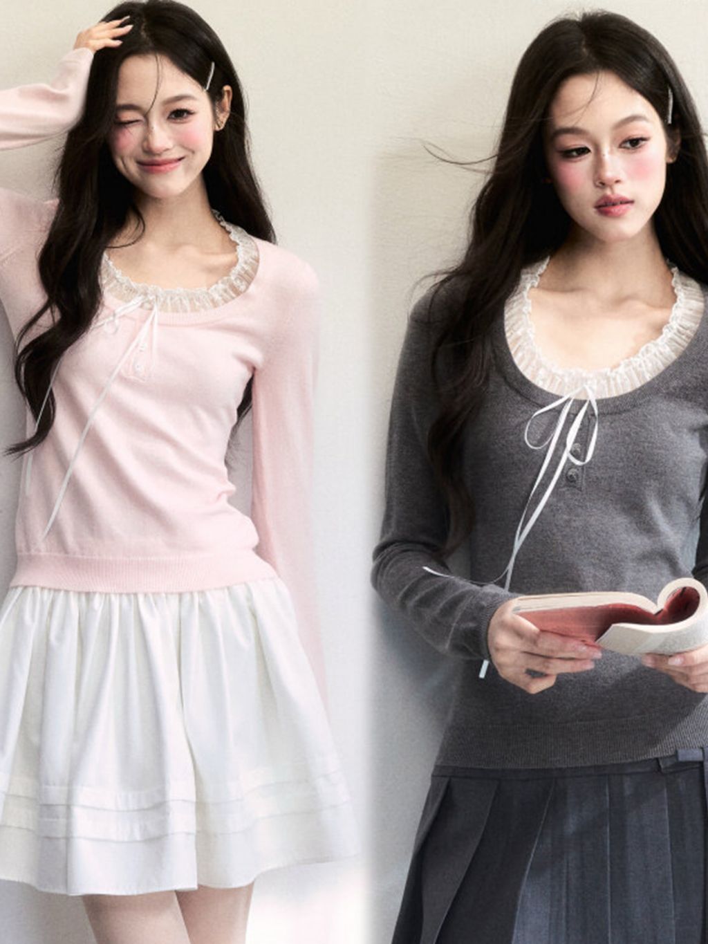 - 레이스 러플 스쿱 넥 + 리본 포인트로 얼굴선을 더 여리하게 연출