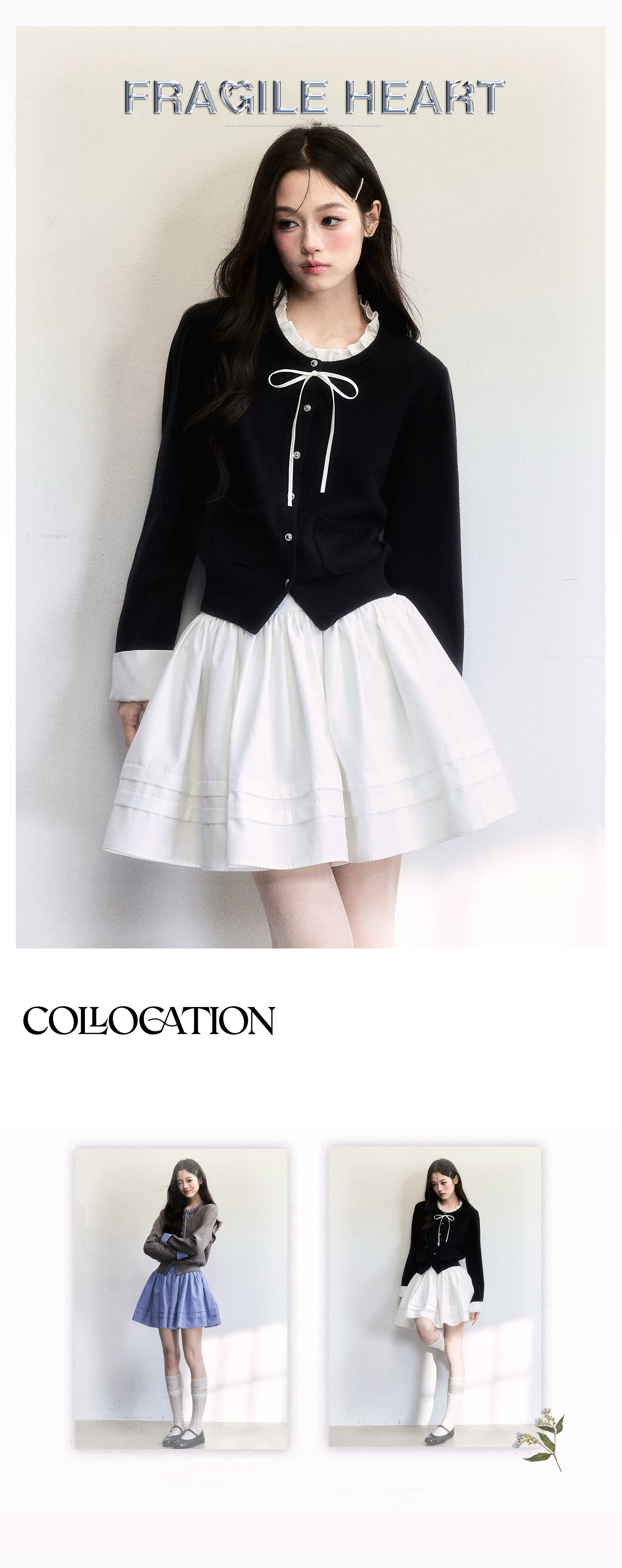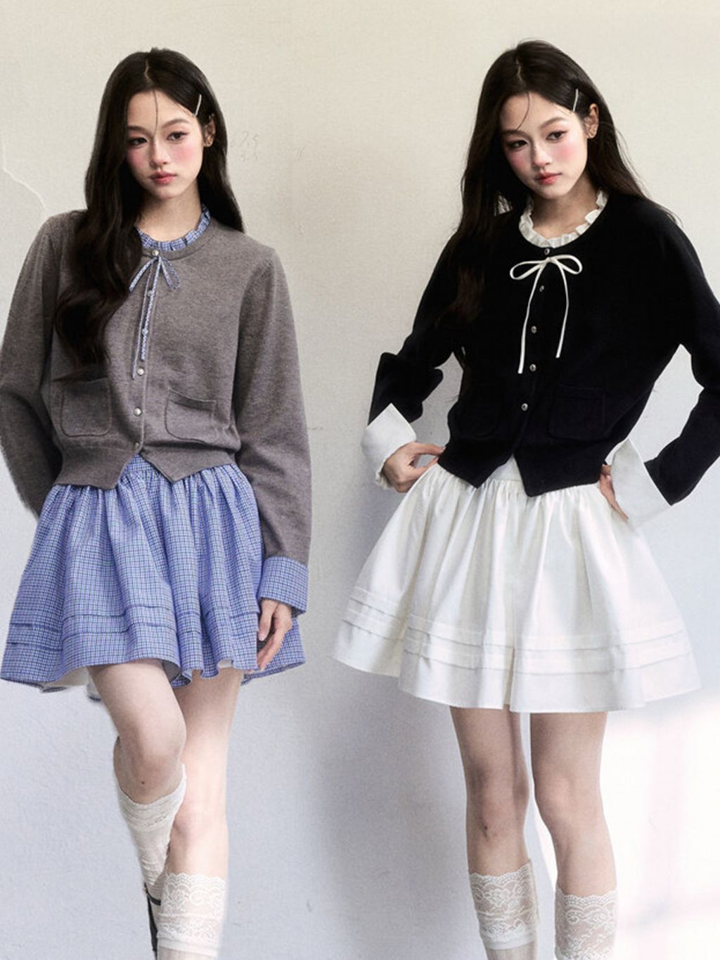 리본 타이 디테일과 레이어드 무드가 만나, 한 번에 ‘스쿨 걸’ 분위기를 완성하는 니트 셋업입니다. 가디건 단독/스커트 단독으로도 코디 폭이 넓어 활용도가 좋습니다.
