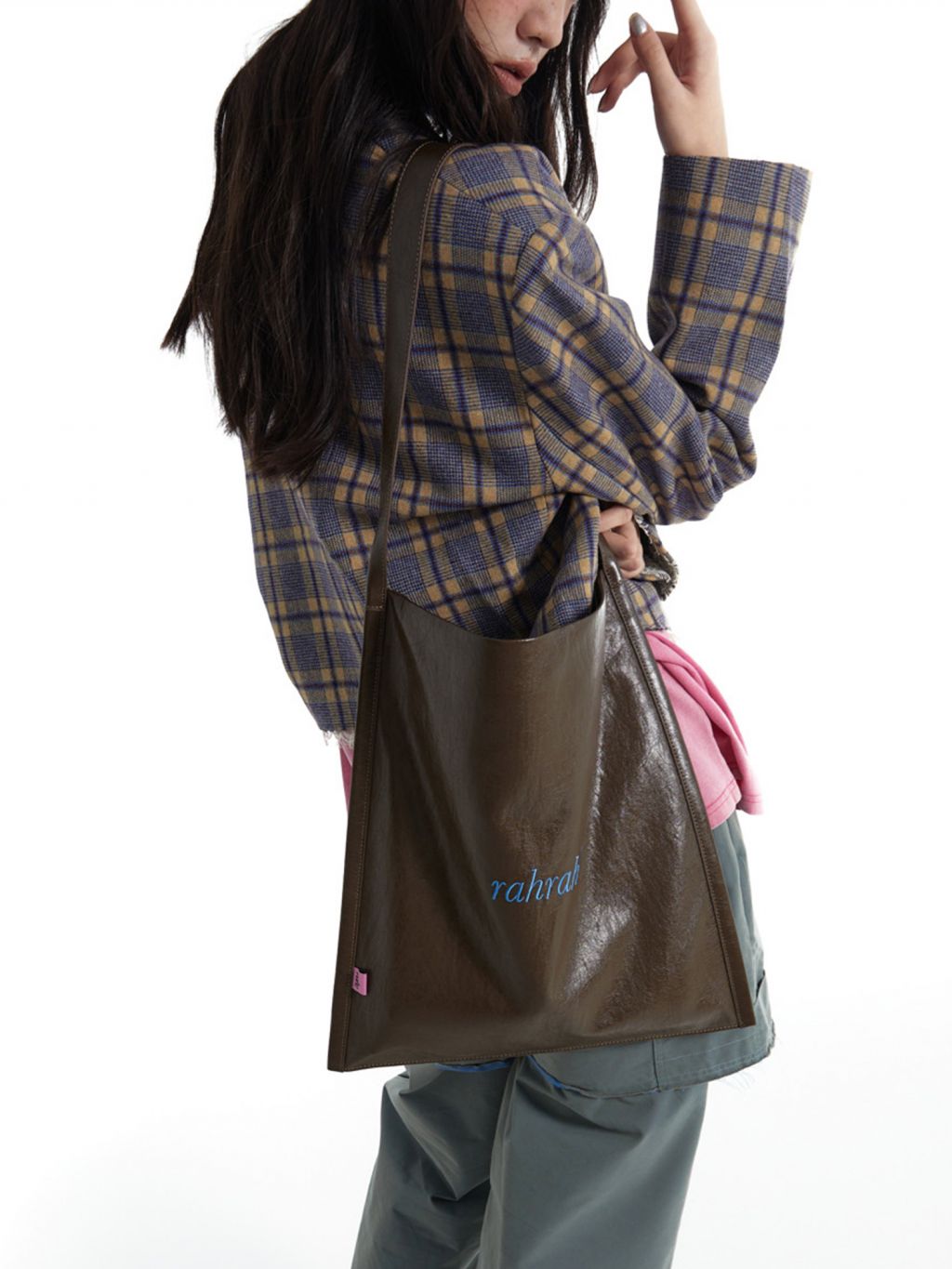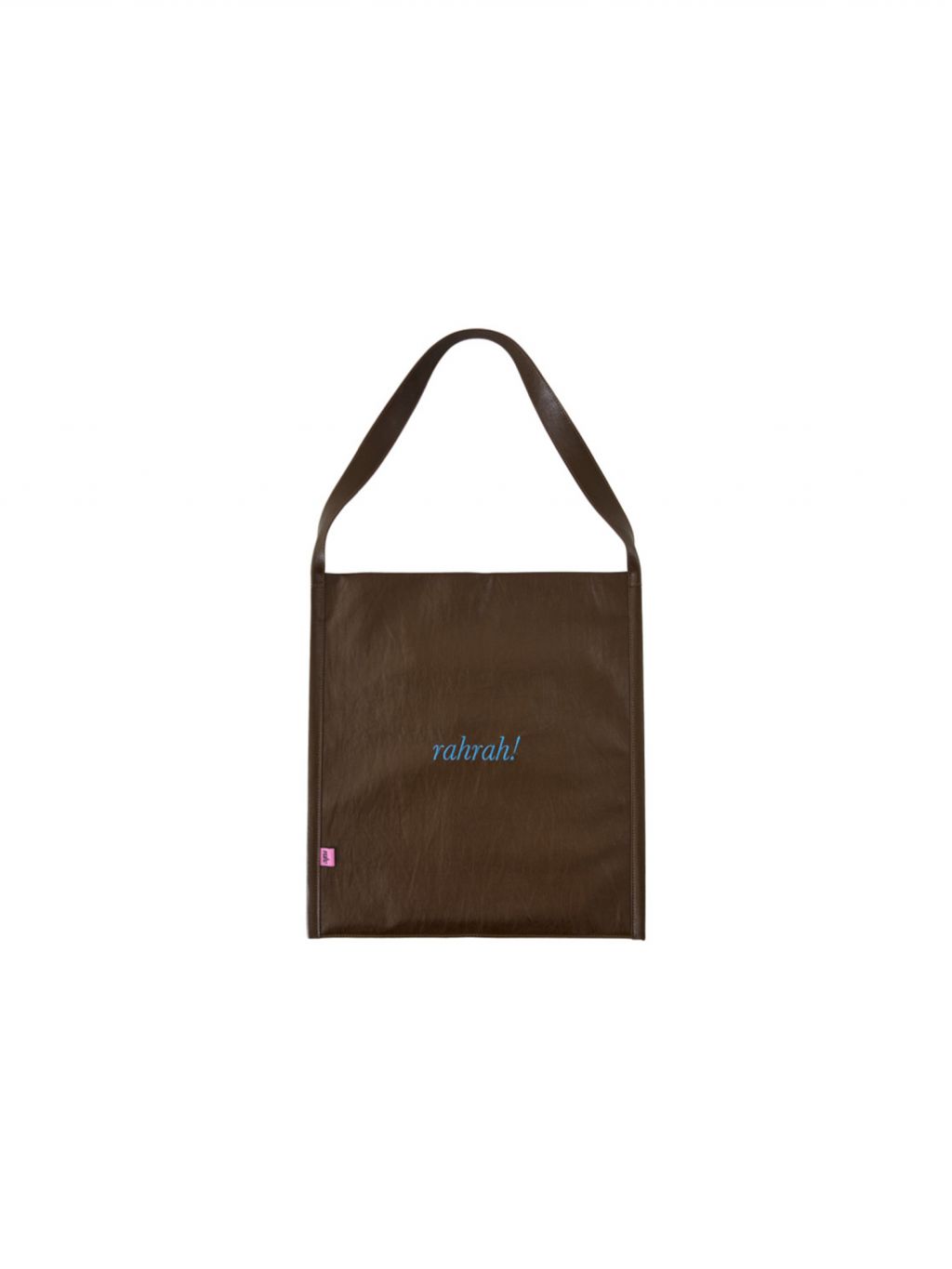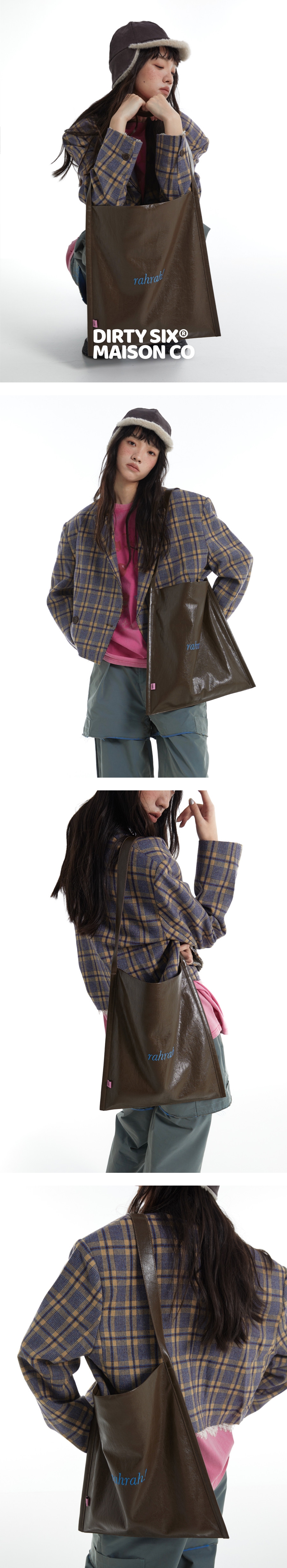 광택감 있는 페이크 레더에 “rahrah!” 컬러 자수가 딱 한 방으로 들어간, 룩을 쿨하게 정리해주는 대용량 토트백입니다. 가볍게 툭 들어도 스타일이 살아나는 ‘데일리 쇼퍼’ 무드가 강점입니다.