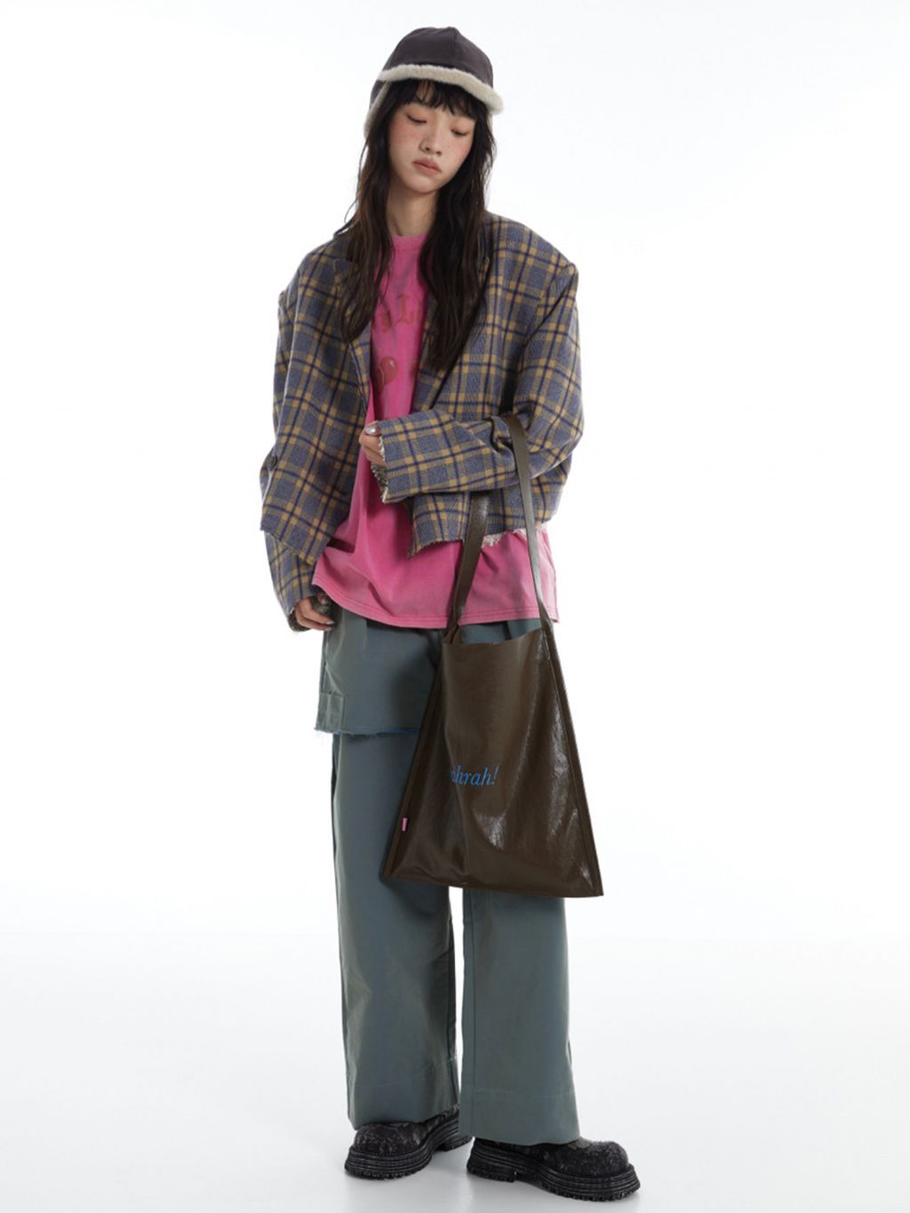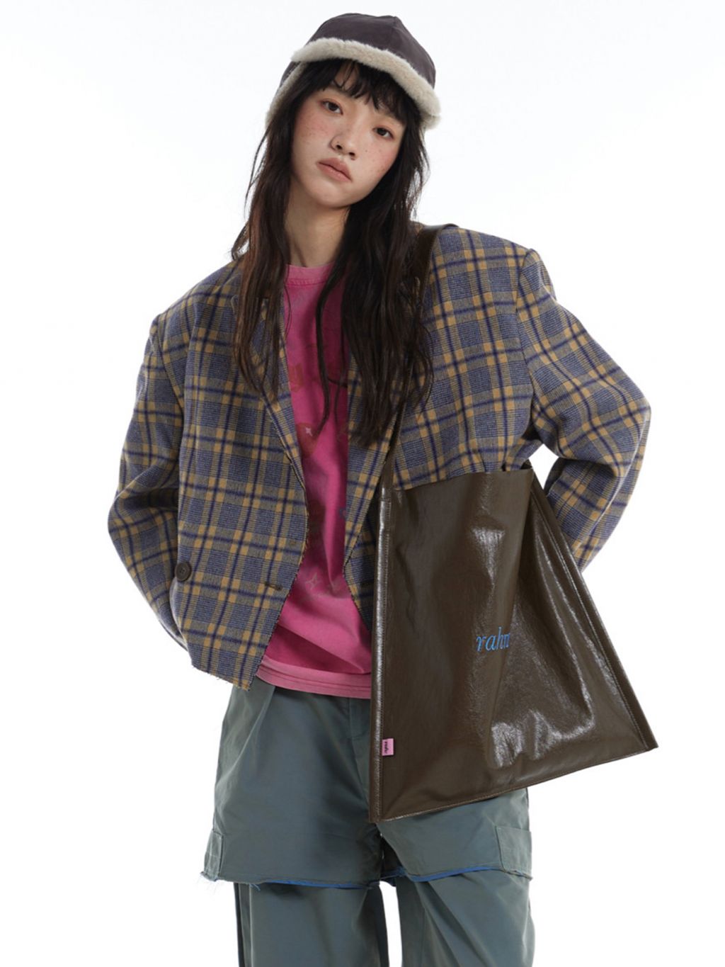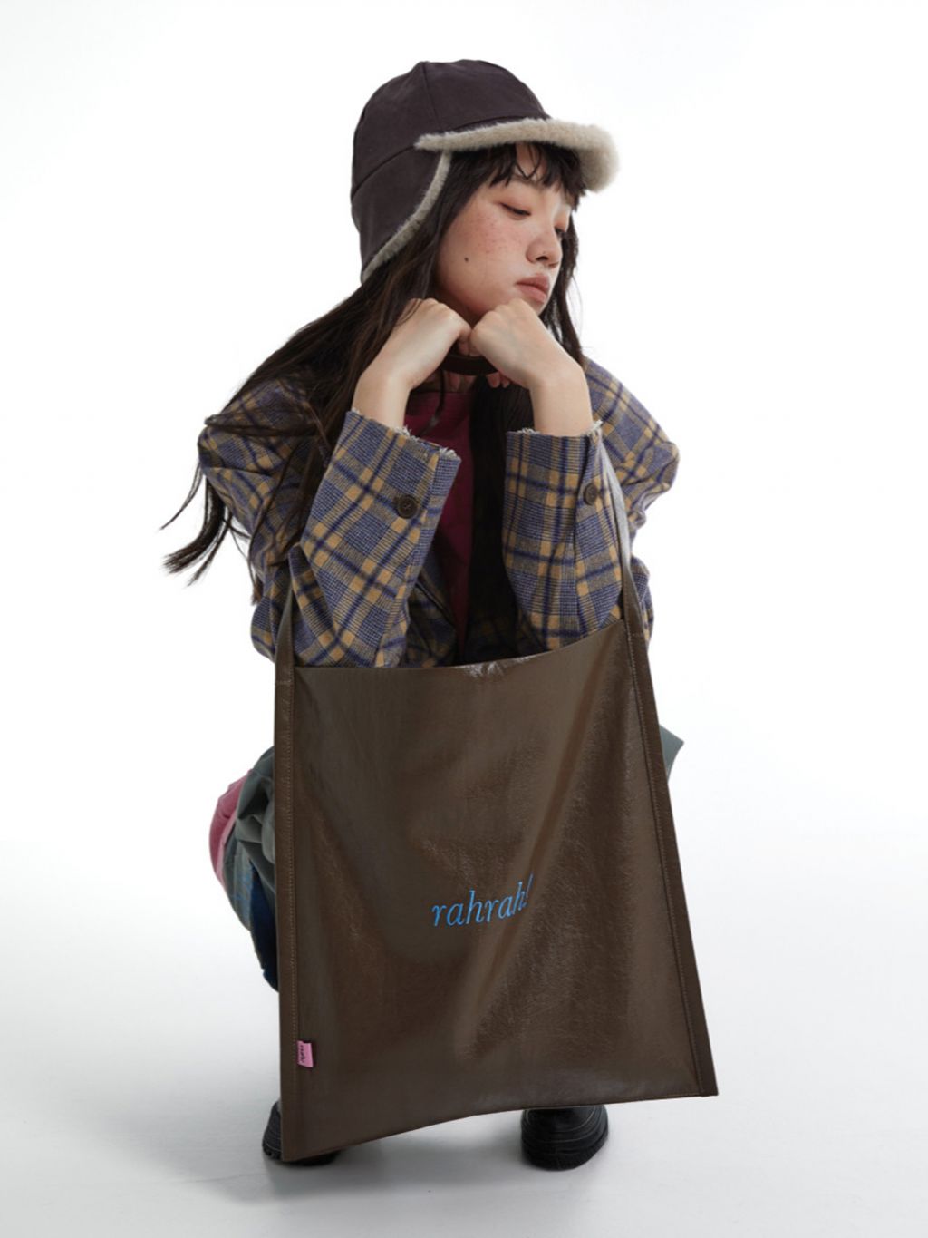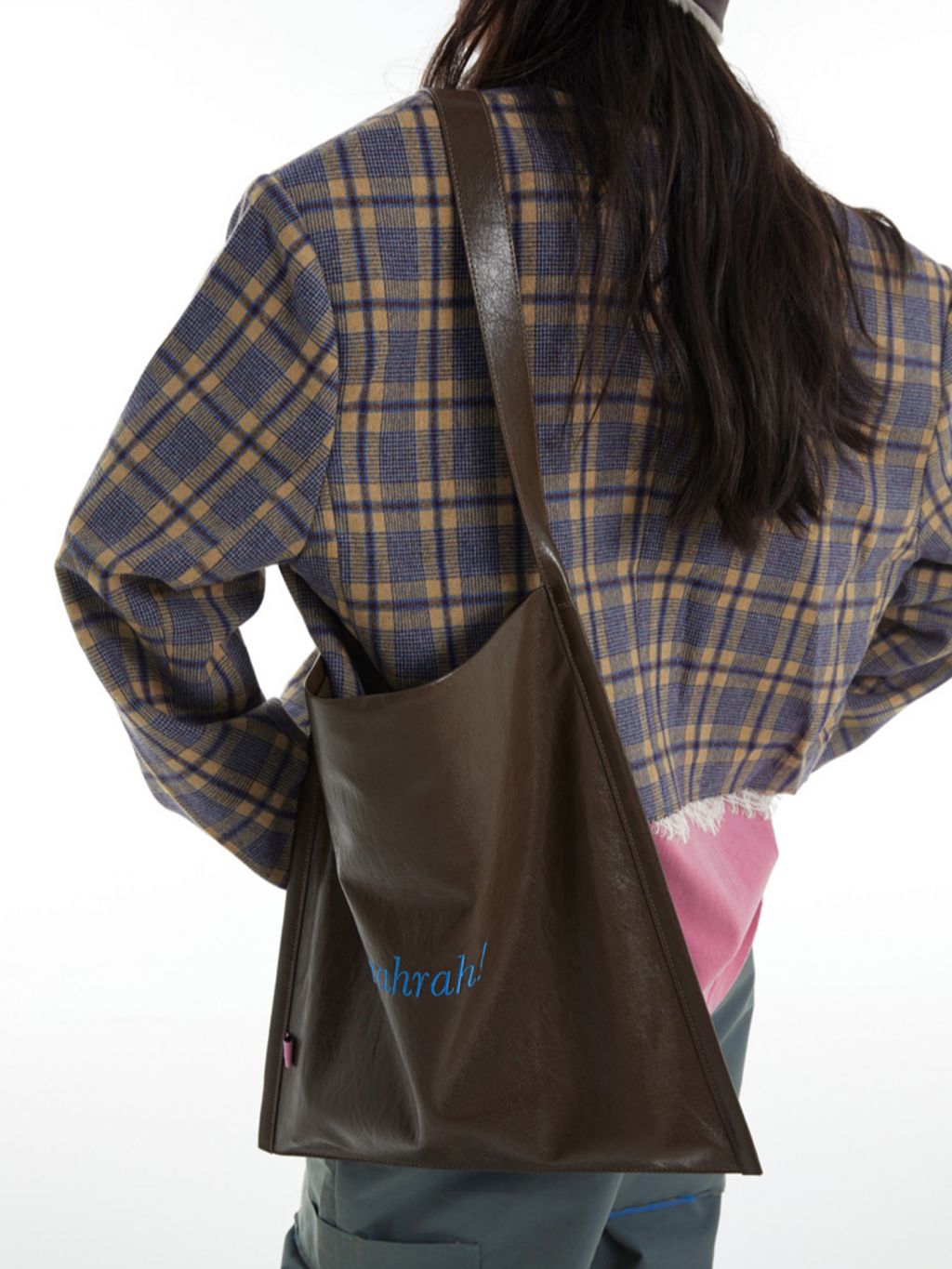 광택감 있는 페이크 레더에 “rahrah!” 컬러 자수가 딱 한 방으로 들어간, 룩을 쿨하게 정리해주는 대용량 토트백입니다. 가볍게 툭 들어도 스타일이 살아나는 ‘데일리 쇼퍼’ 무드가 강점입니다.