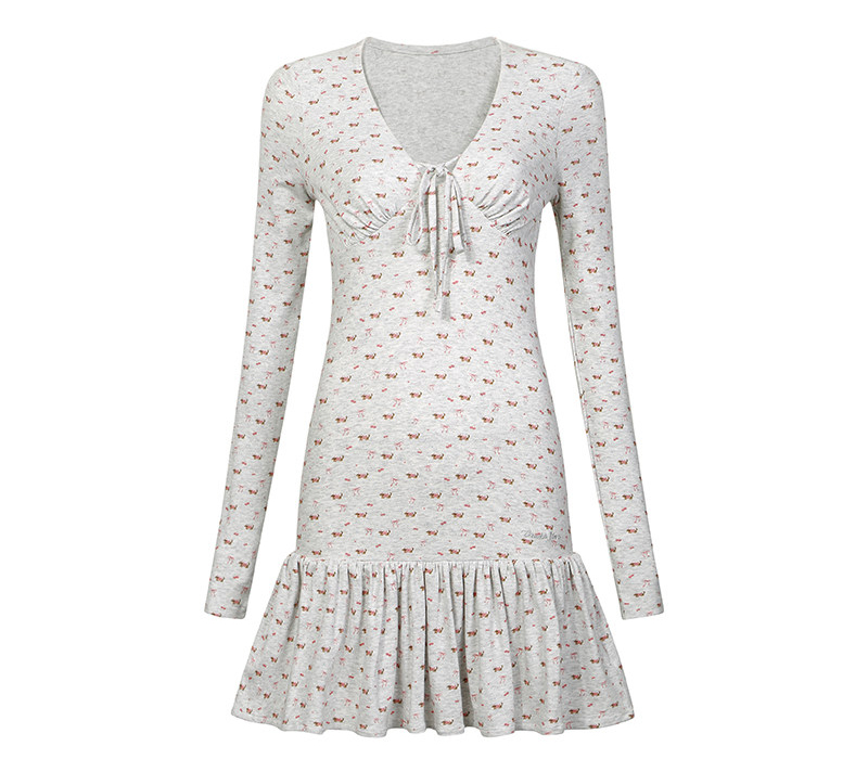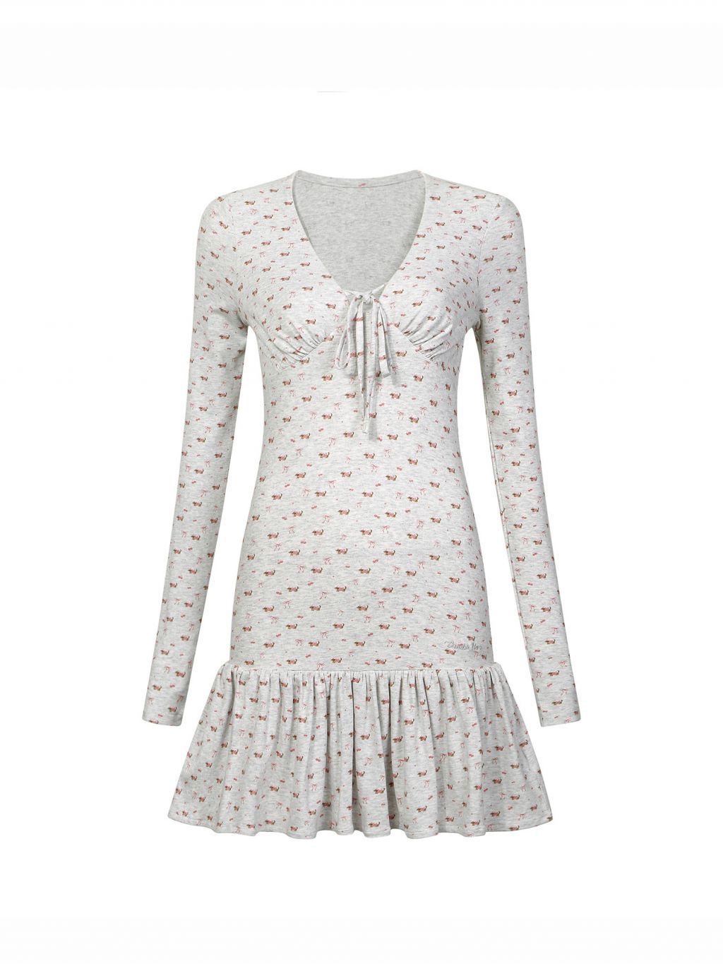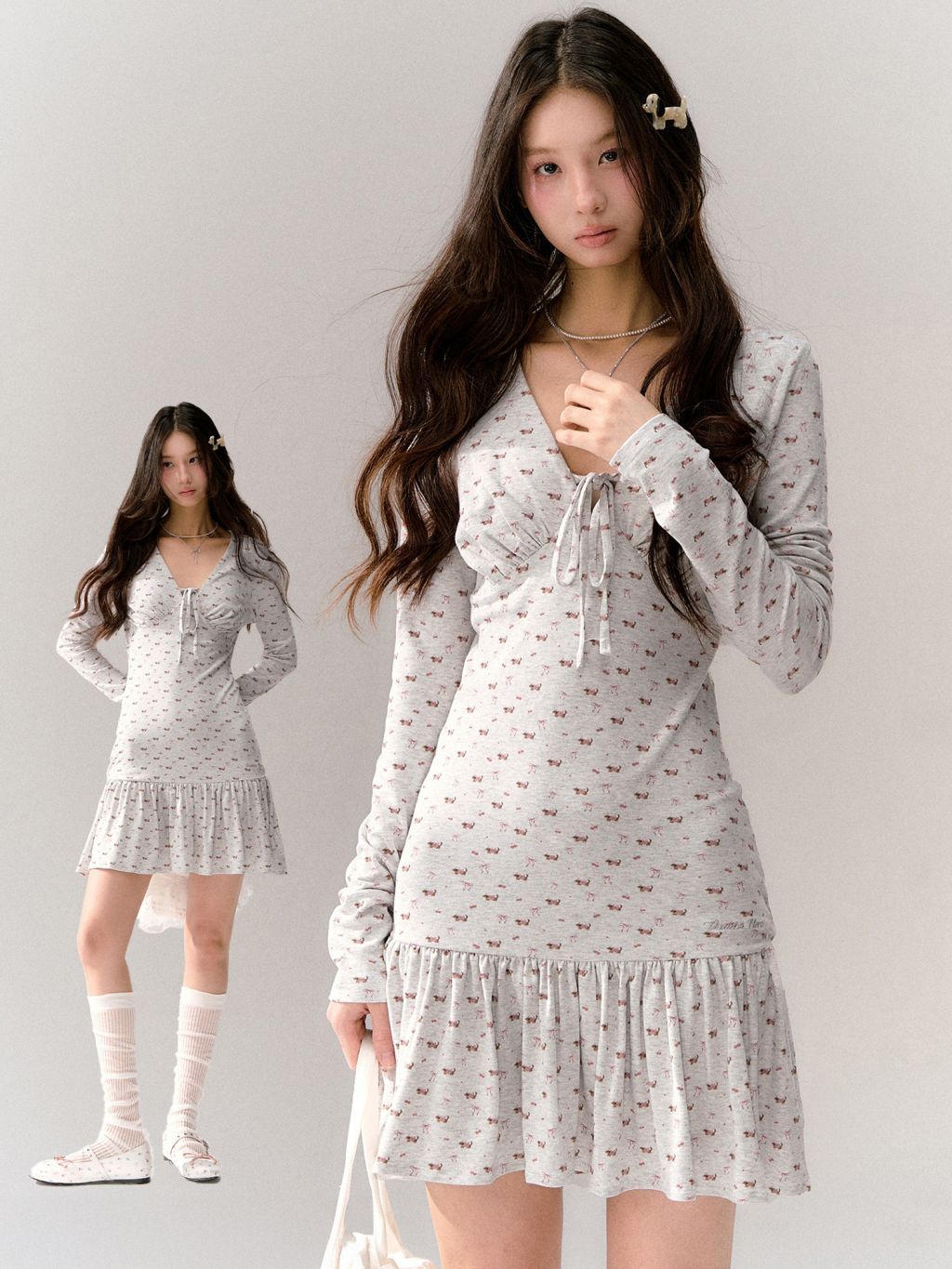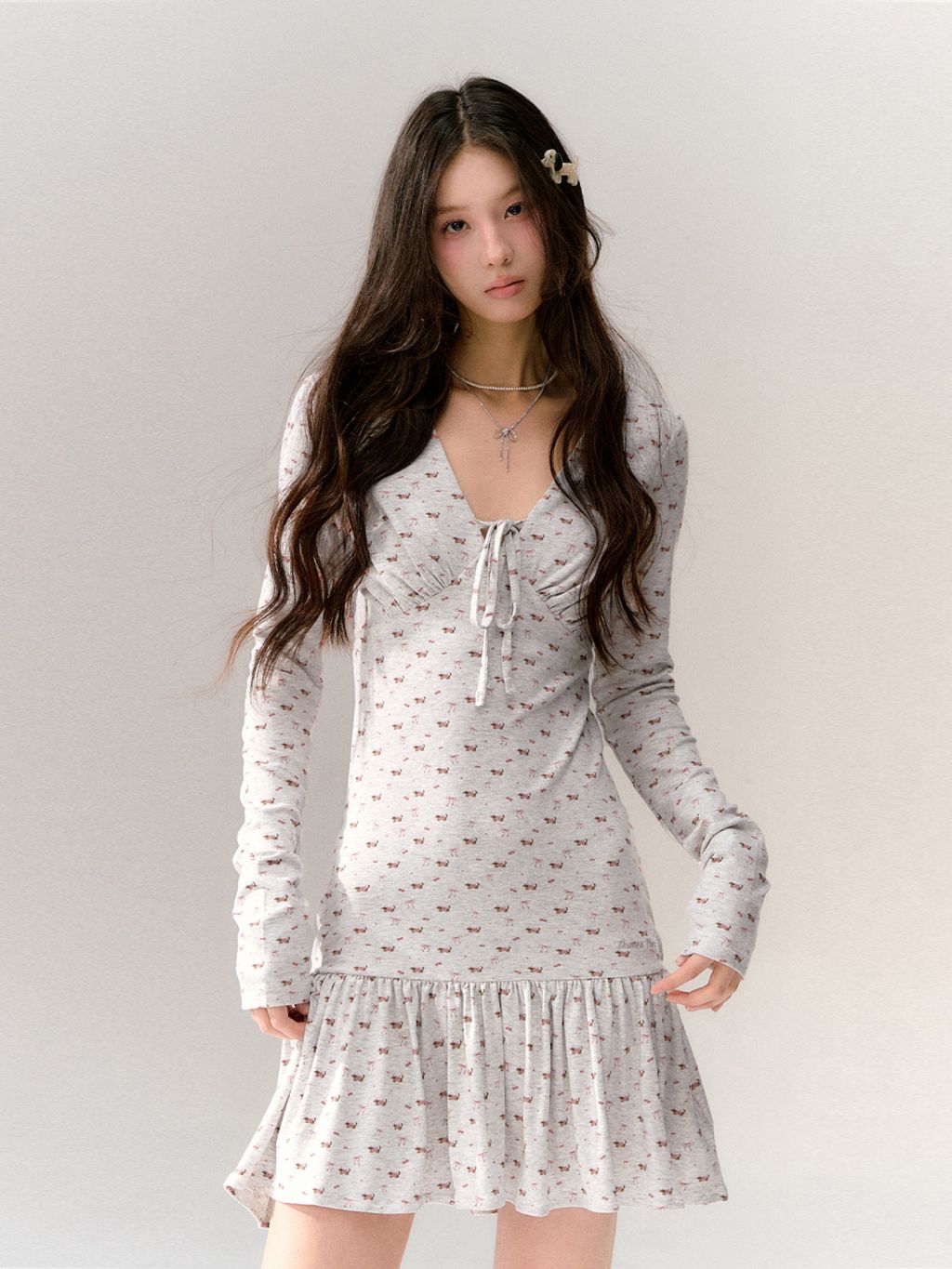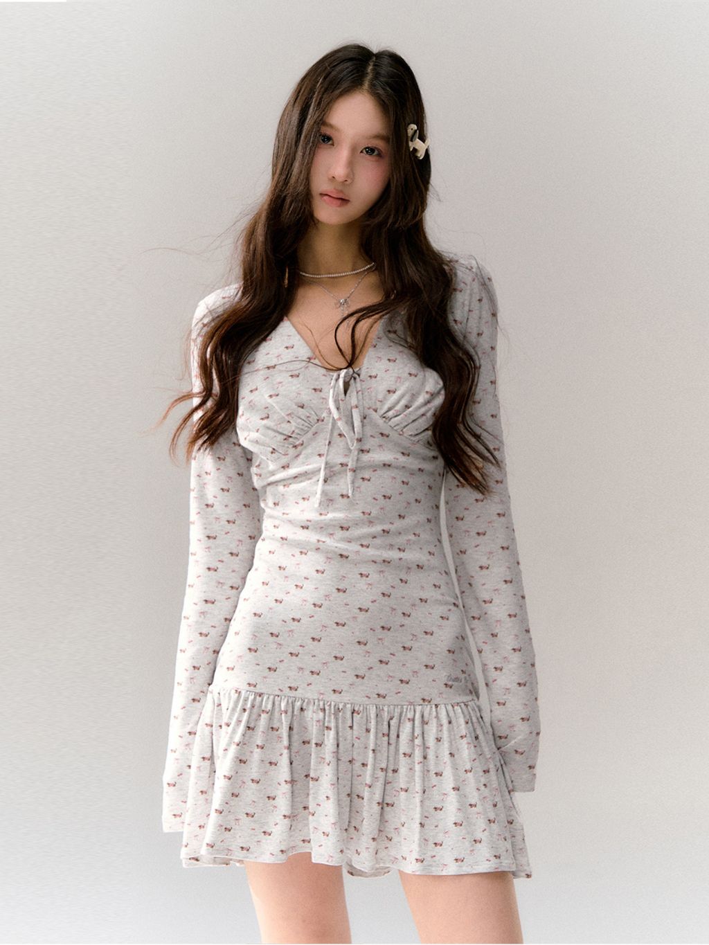 잔잔한 체리&리본 올오버 패턴에, 바스트 셔링과 타이 디테일을 더해 상체 라인이 예쁘게 살아나는 니트 드레스입니다. 밑단 프릴 스커트로 걸을 때마다 가볍게 흔들려, 데일리에도 ‘꾸안꾸’ 무드가 완성됩니다.