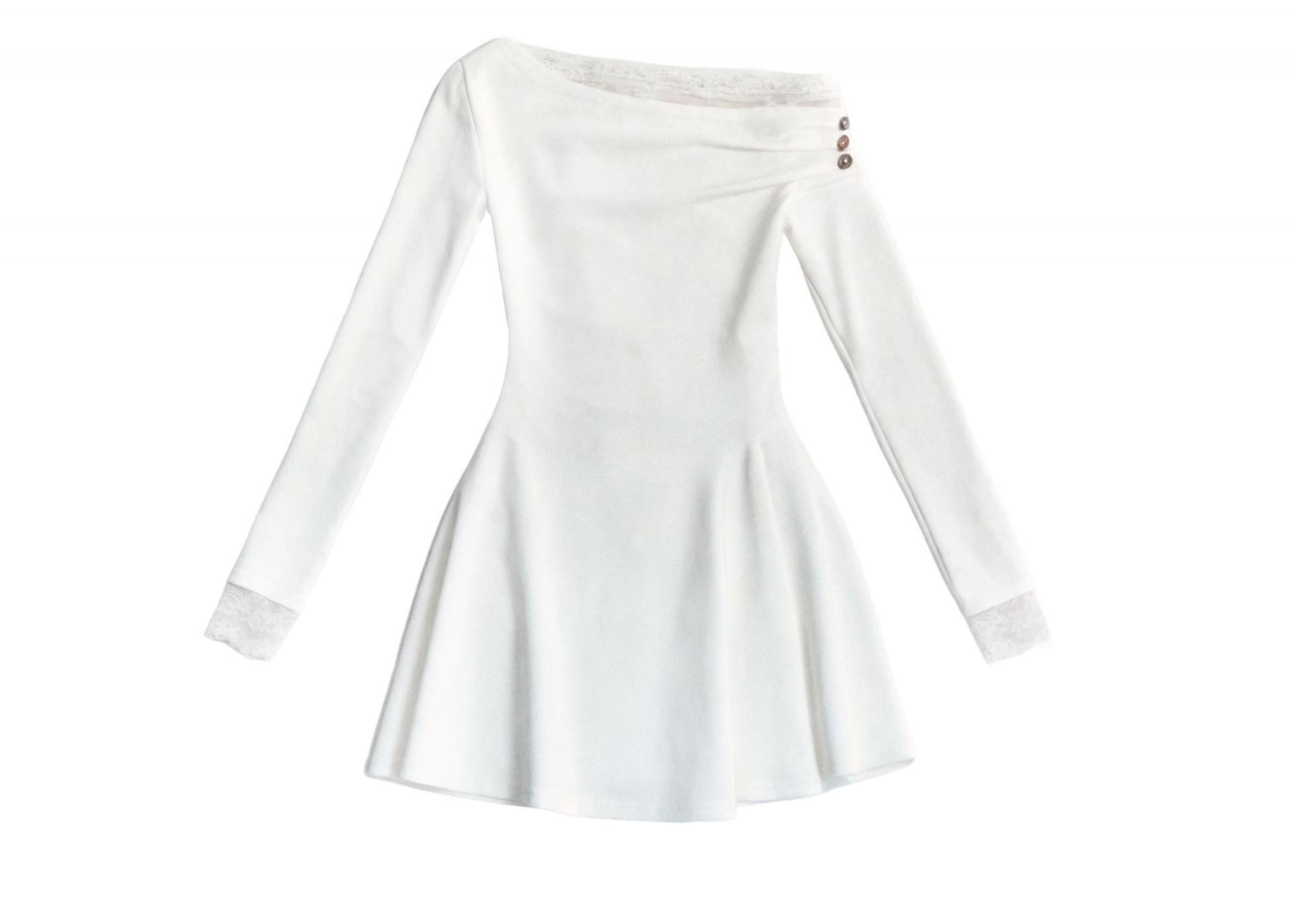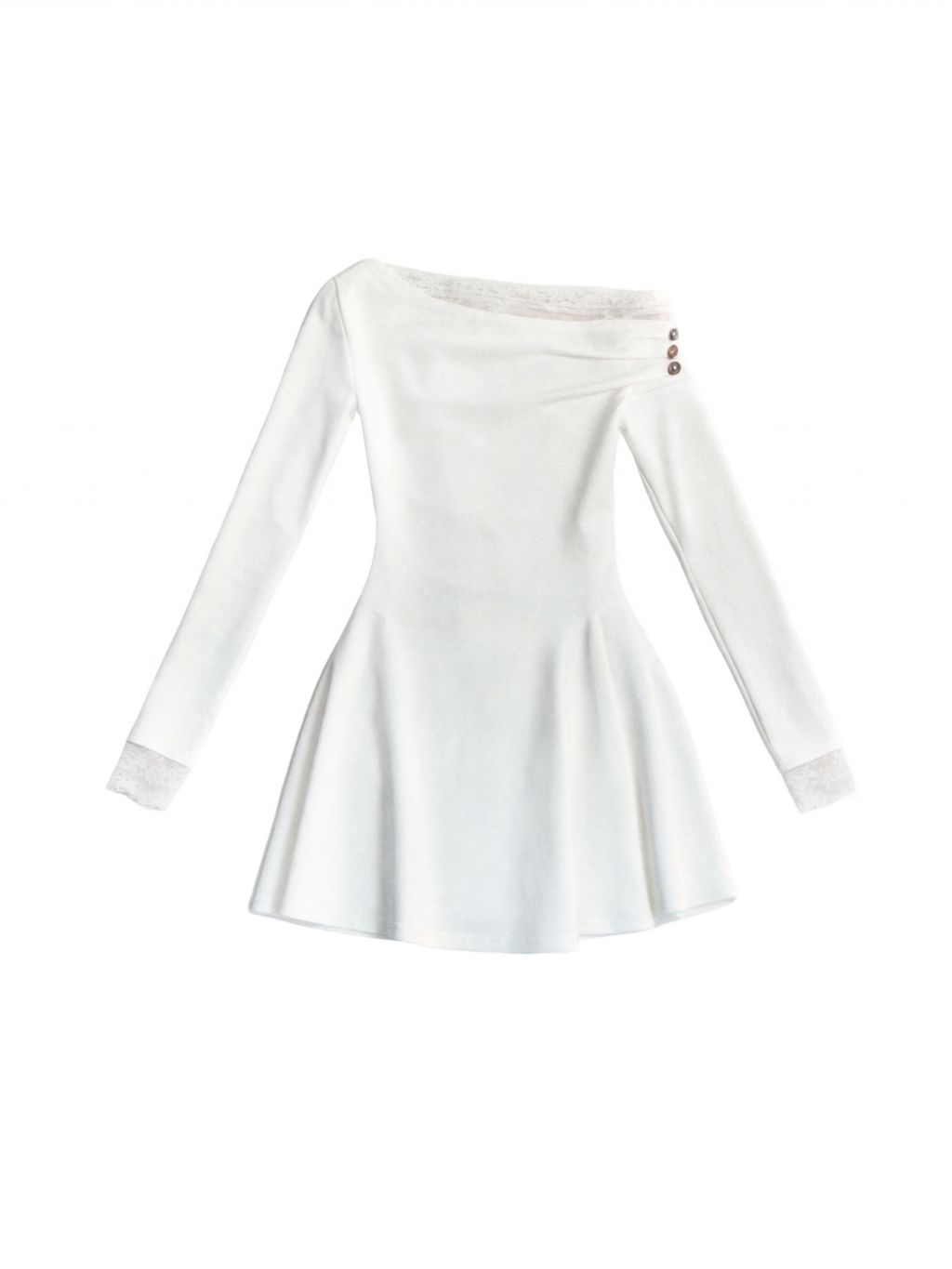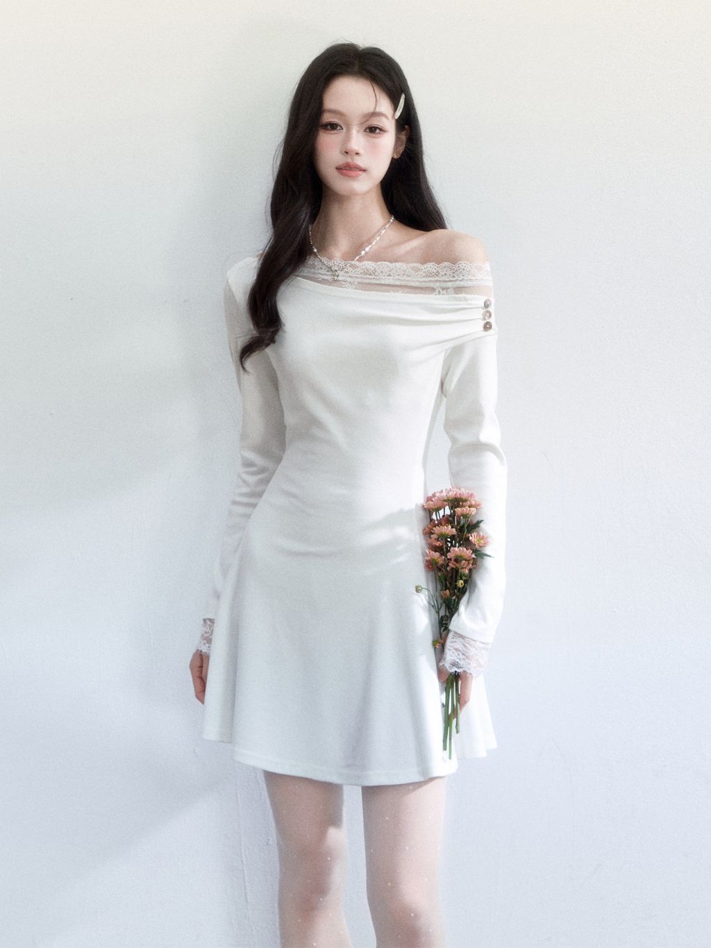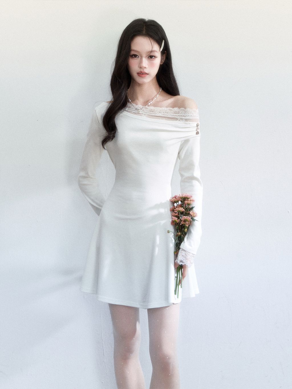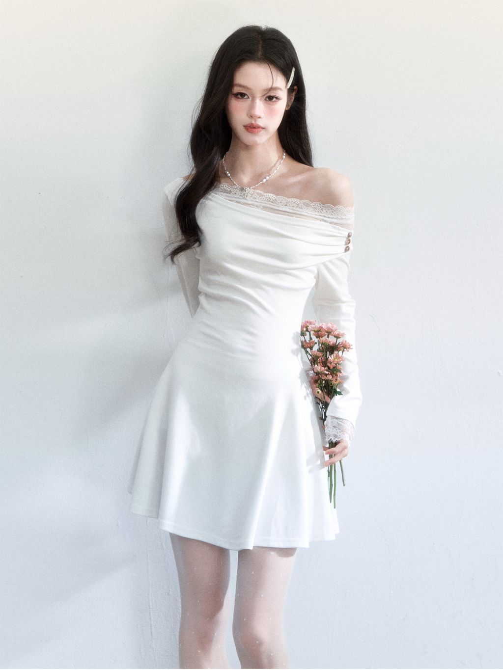 사선 원숄더 넥라인에 레이스 트리밍을 더해, 쇄골과 어깨 라인이 가장 예쁘게 드러나는 로맨틱 미니 드레스입니다. 허리는 슬림하게 잡고 스커트는 자연스럽게 플레어로 퍼져 비율이 길어 보입니다.