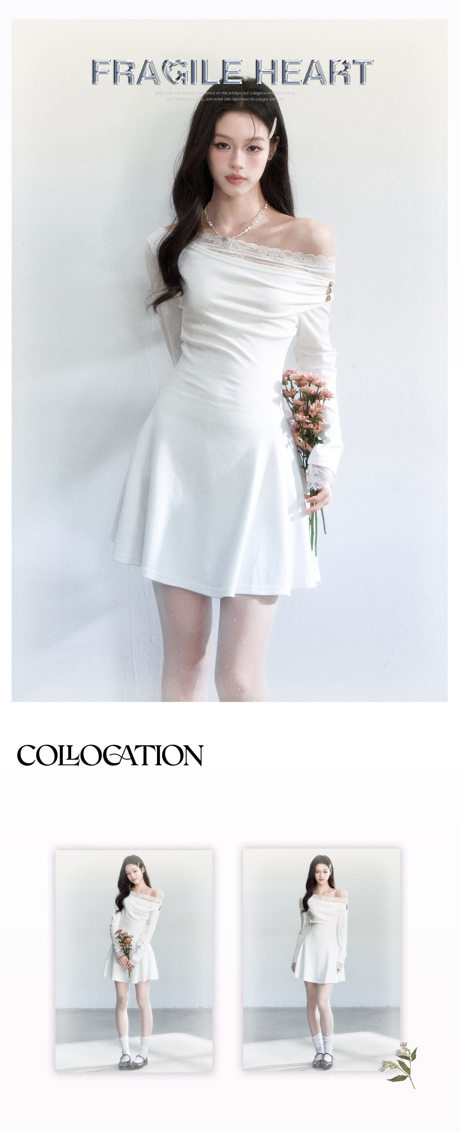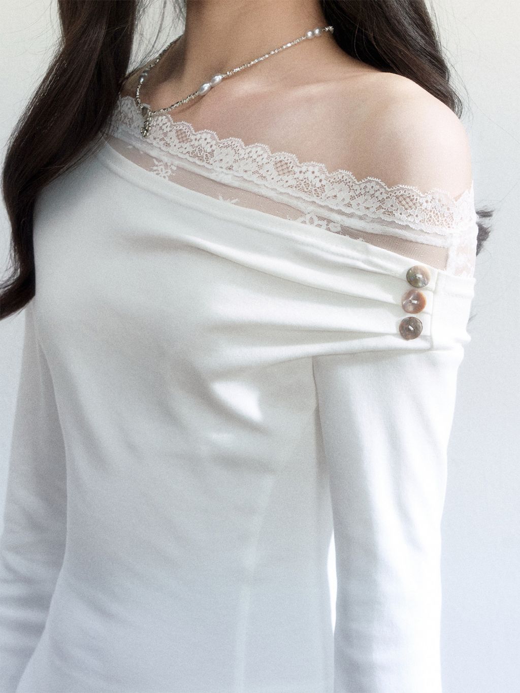 - 사선 원숄더 컷과 레이스 넥 디테일로 얼굴선을 여리하게 보이게 합니다.