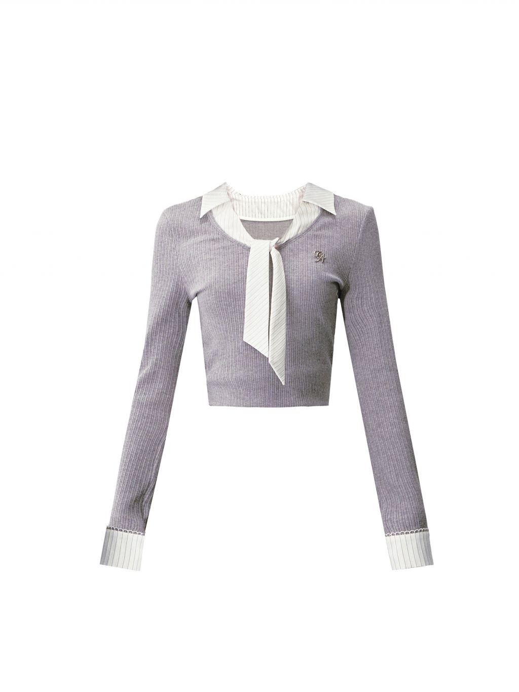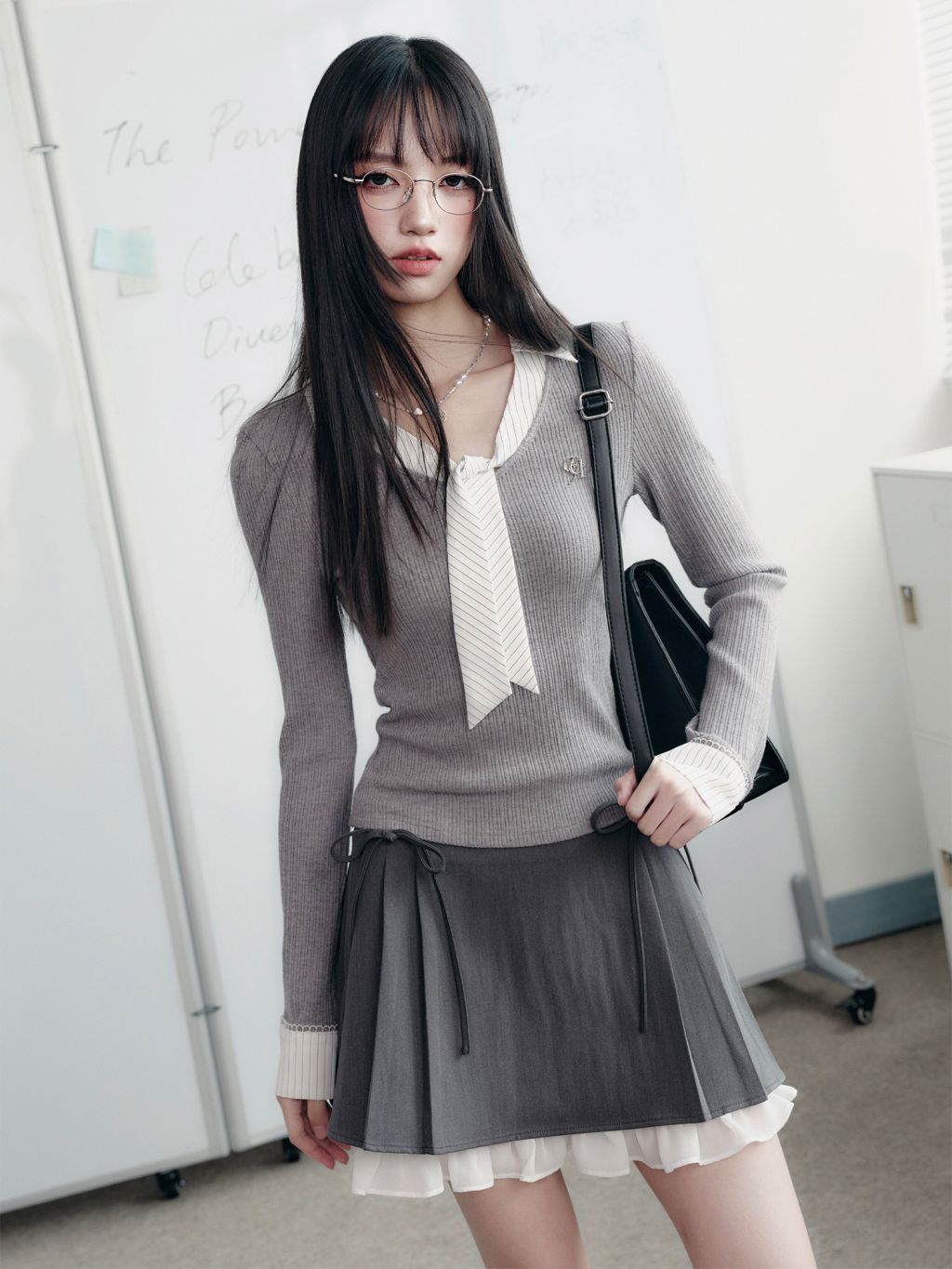 셔츠 타이 디테일을 레이어드한 듯한 “페이크 투피스” 디자인으로, 한 벌만 입어도 단정한 학원물 무드가 완성되는 니트 탑입니다. 골지 니트가 바디 라인을 슬림하게 잡아주고, 타이 디테일이 시선을 위로 모아 비율이 좋아 보입니다.