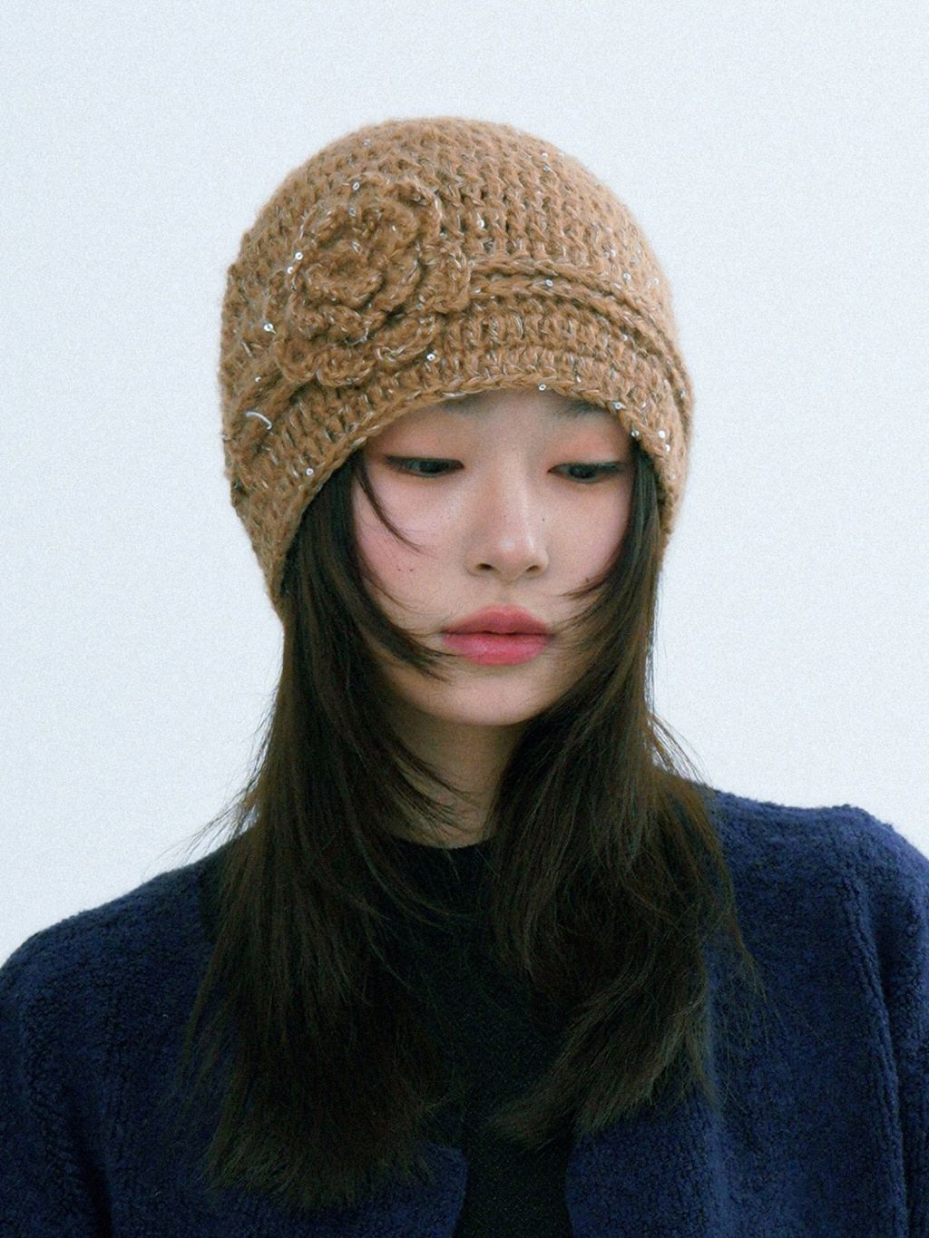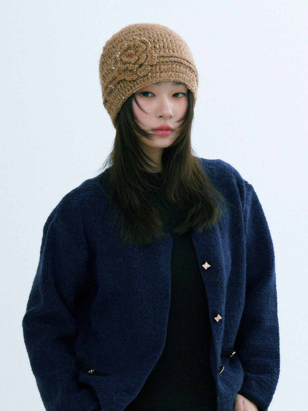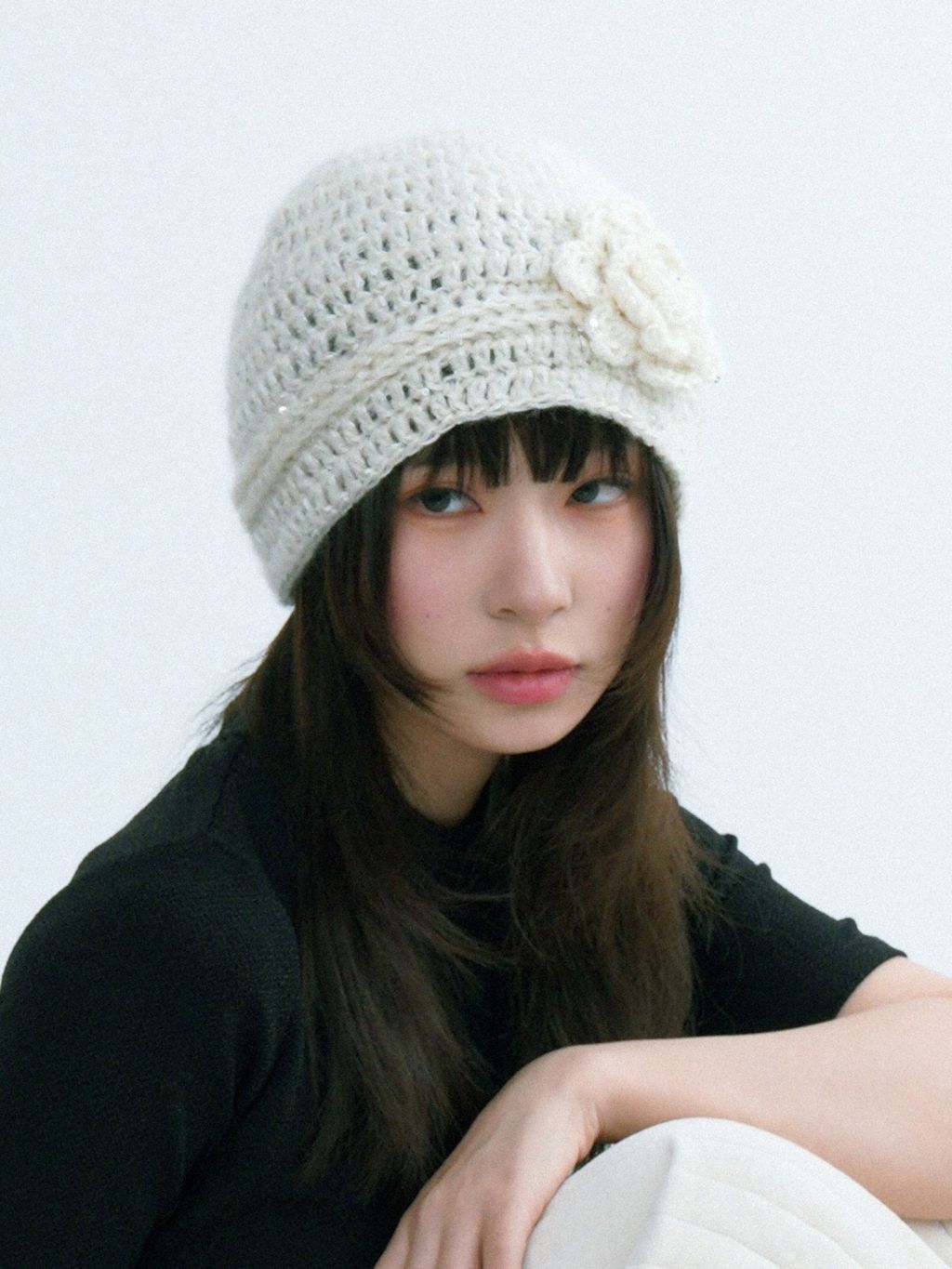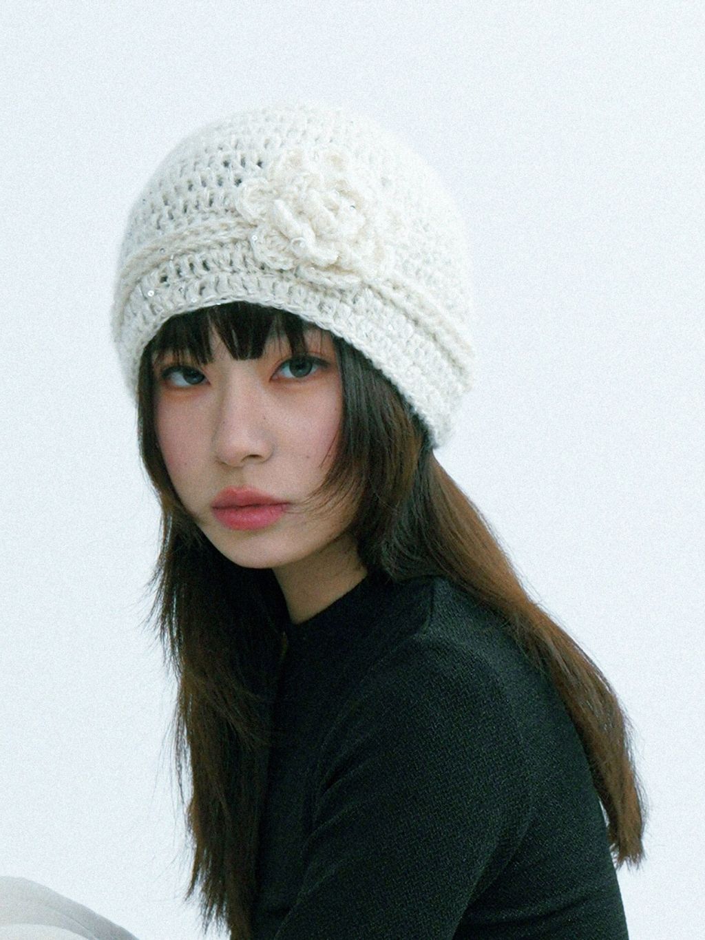 로제트 플라워 아플리케와 은은한 스파클 텍스처가 한 번에 ‘코케트 무드’를 완성하는 크로셰 비니입니다. 얼굴선을 부드럽게 감싸주는 핏이라 코트·퍼·가디건 어디든 포인트로 잘 어울립니다.