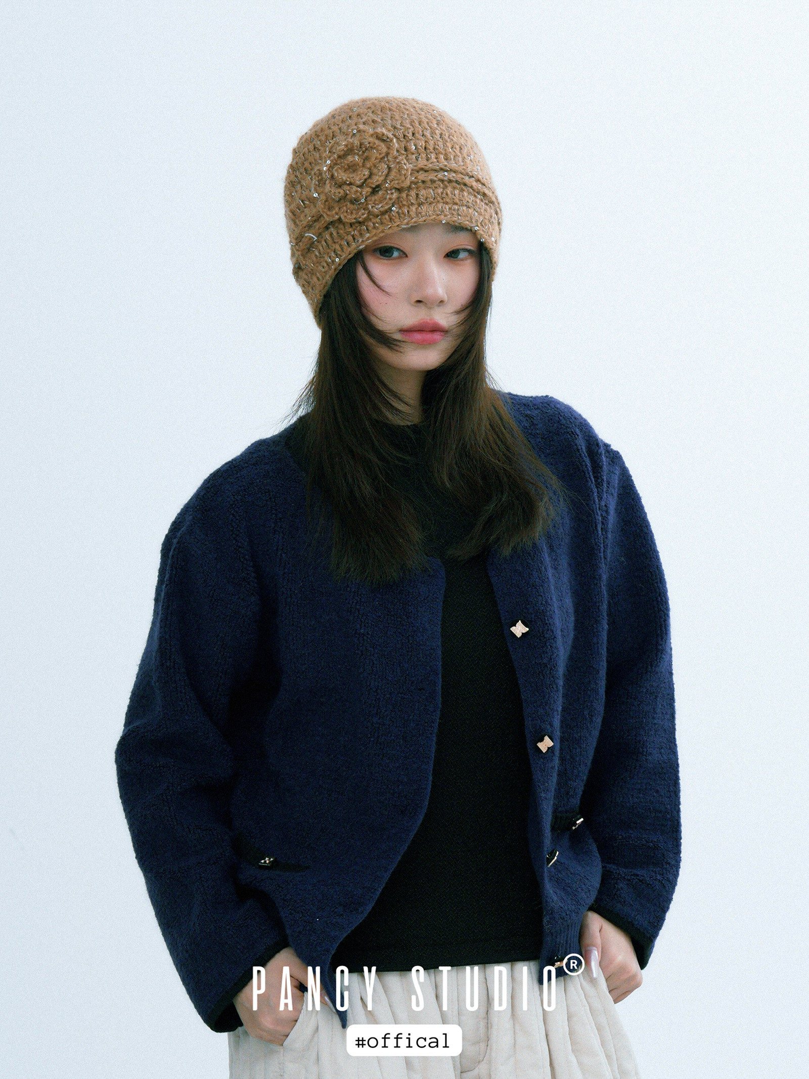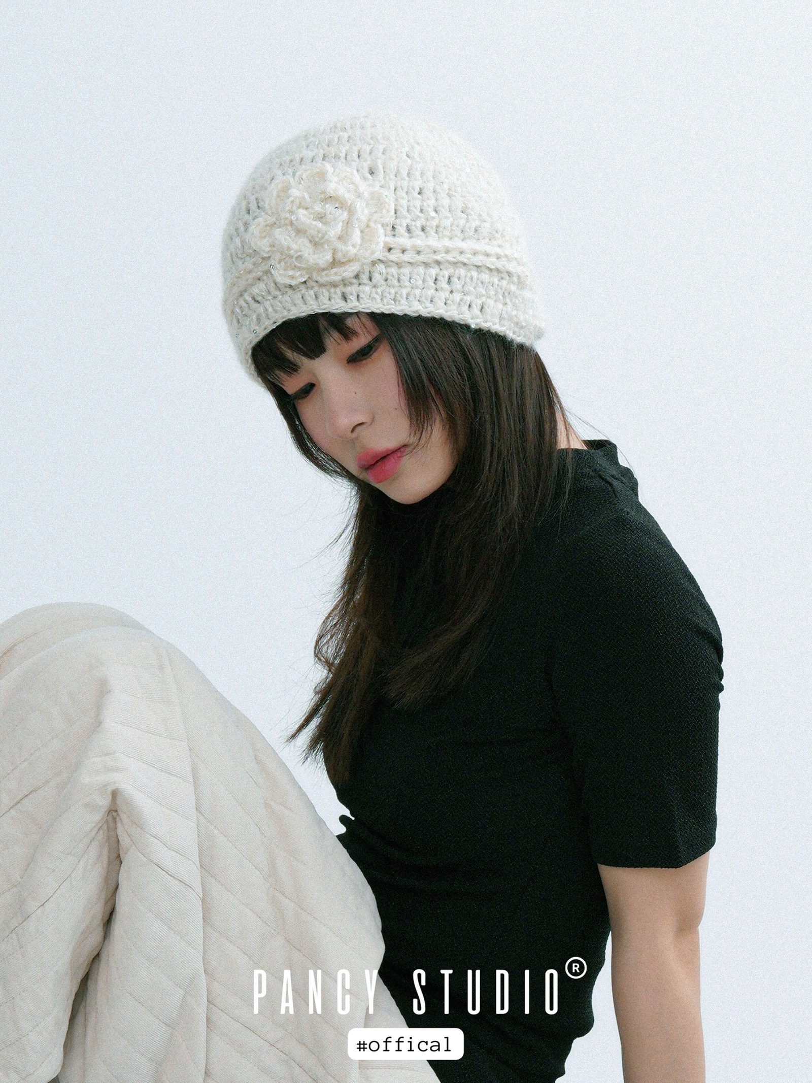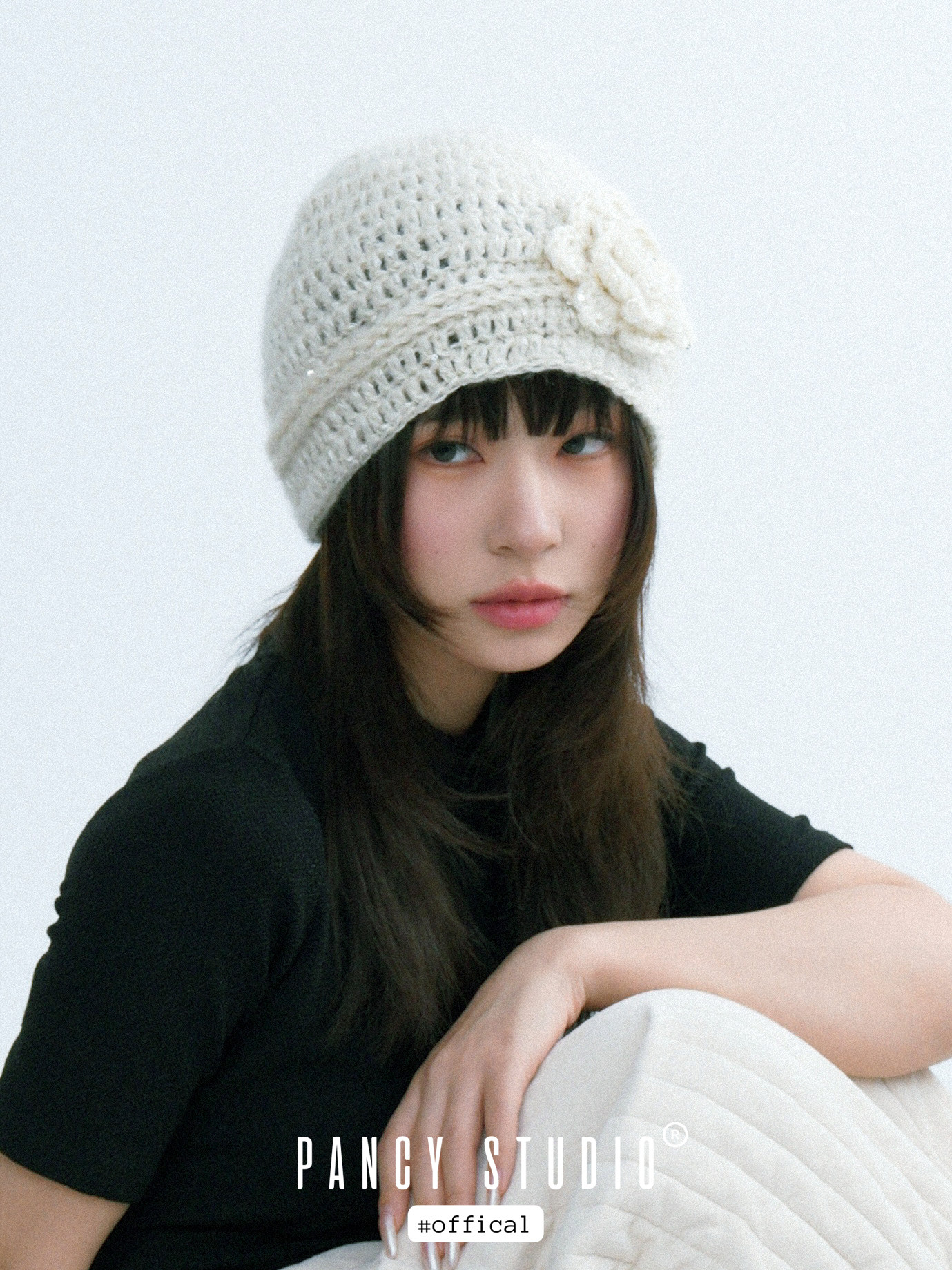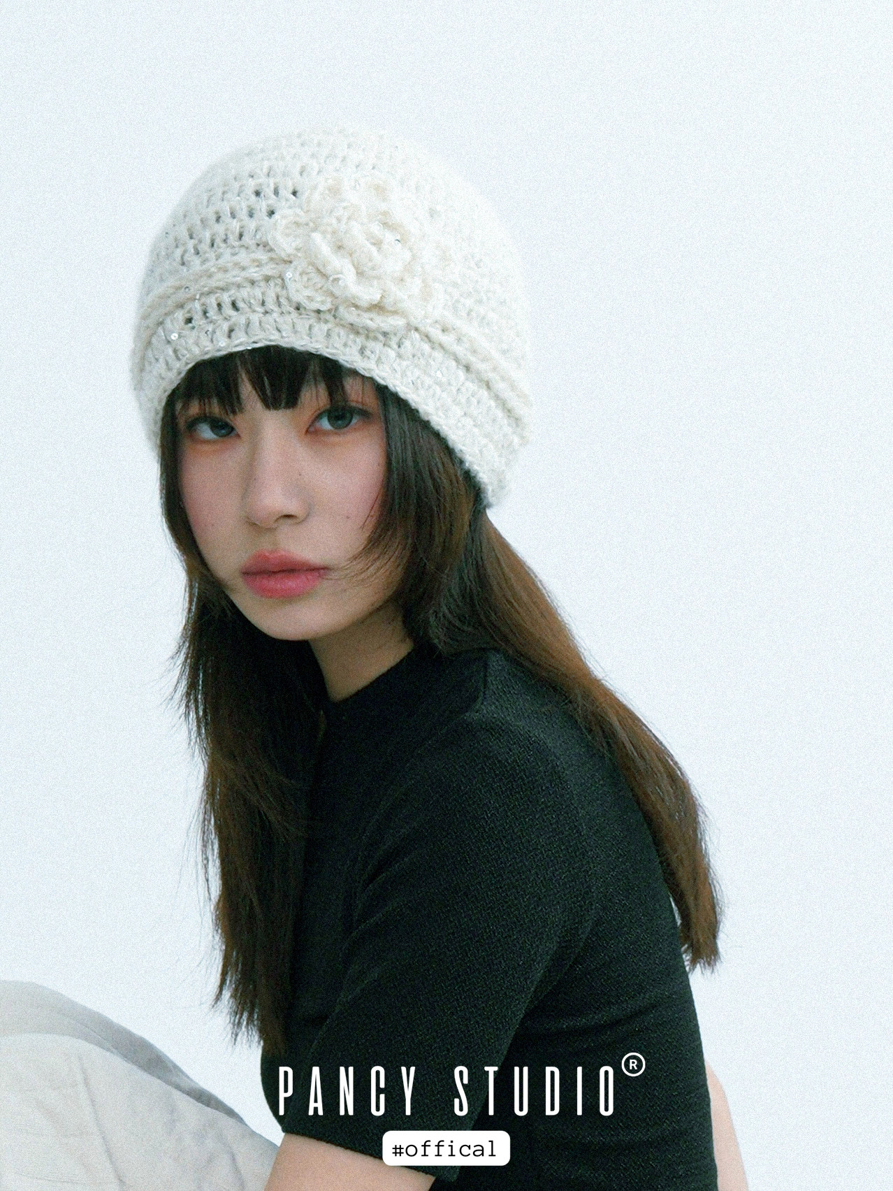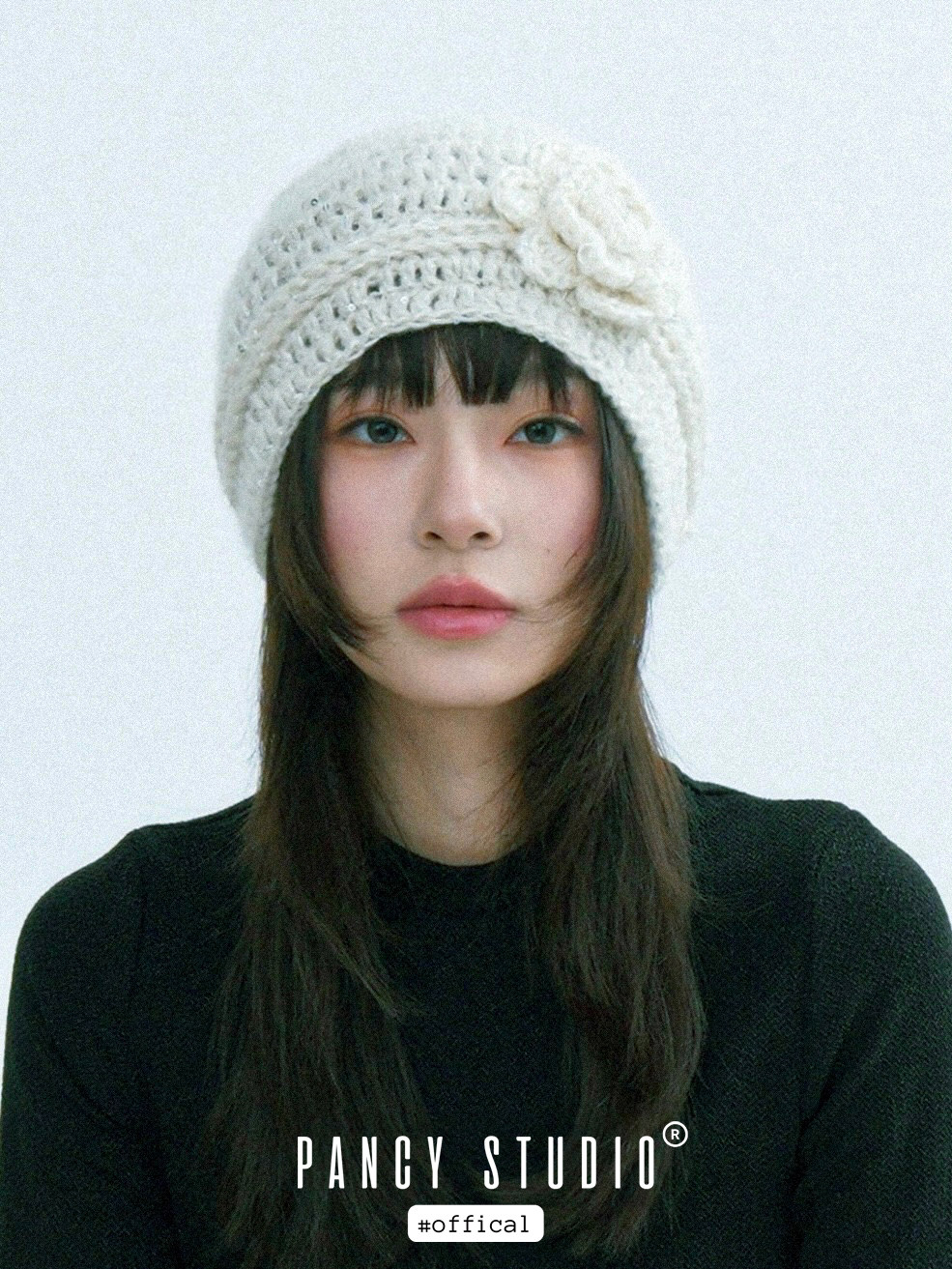 로제트 플라워 아플리케와 은은한 스파클 텍스처가 한 번에 ‘코케트 무드’를 완성하는 크로셰 비니입니다. 얼굴선을 부드럽게 감싸주는 핏이라 코트·퍼·가디건 어디든 포인트로 잘 어울립니다.
