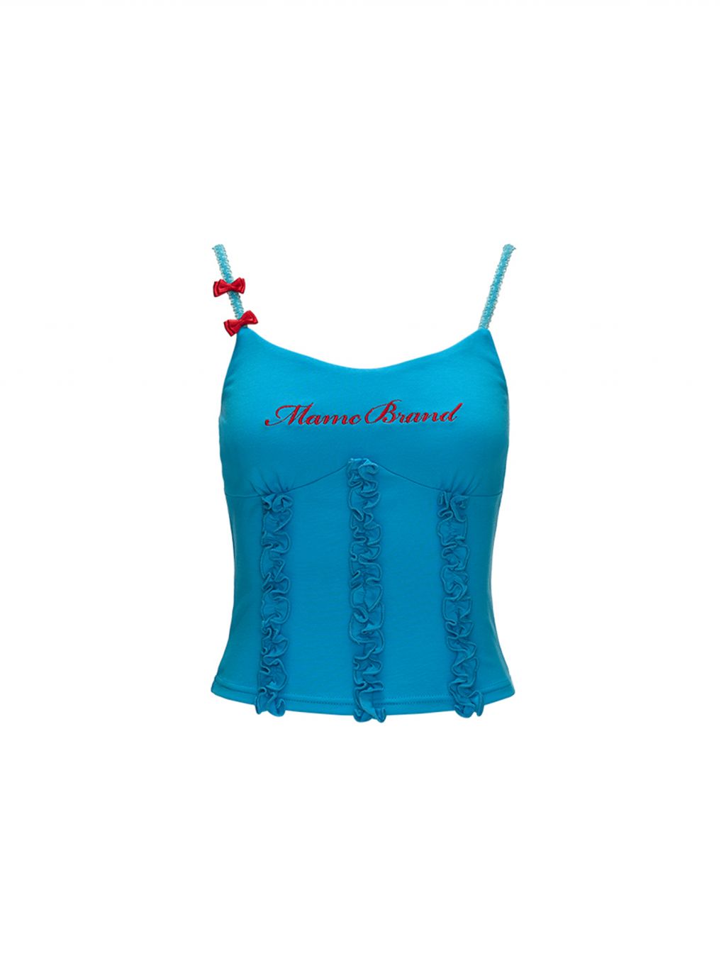 캔디처럼 컬러풀하고 발랄한 무드를 담아낸 슬림핏 탱크탑으로 슬리브리스 스트랩 위에 작은 리본 장식이 달려 포인트를 더하며, 앞면에는 러플 디테일이 세로로 들어가 바디 라인을 보다 슬림하게 연출해줍니다.