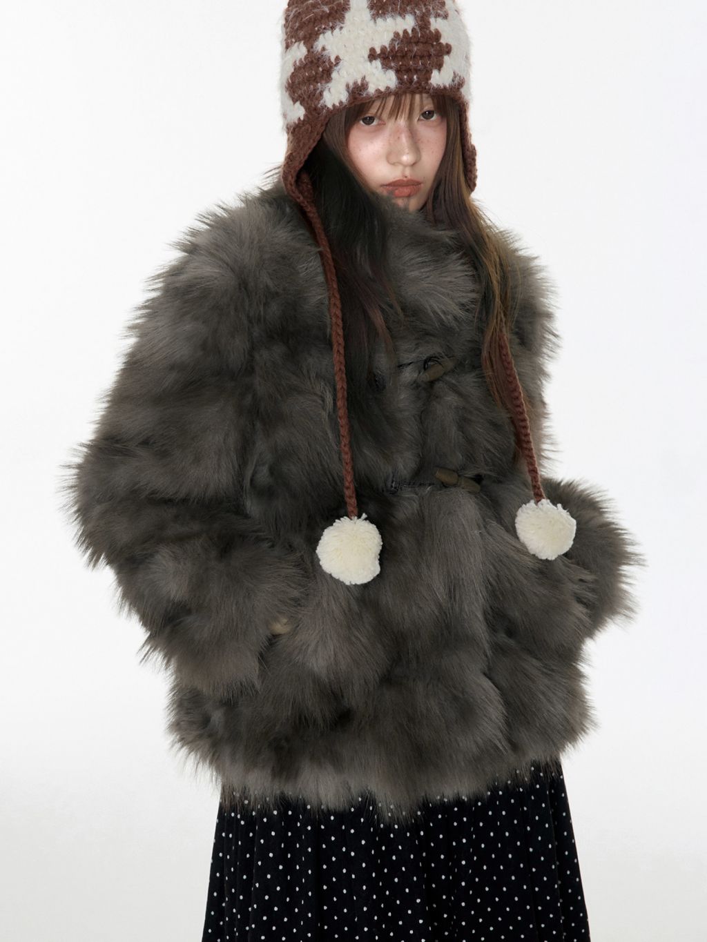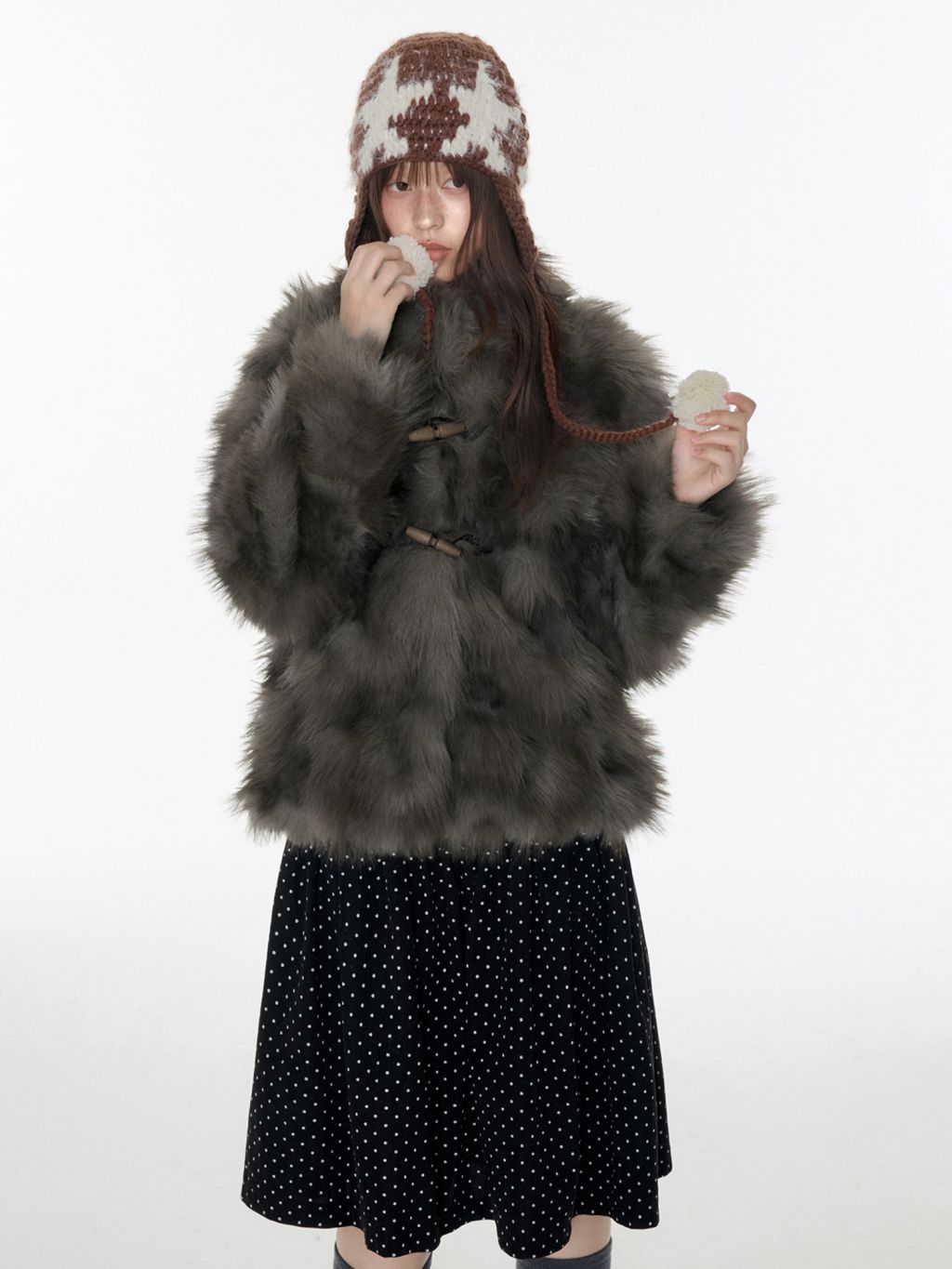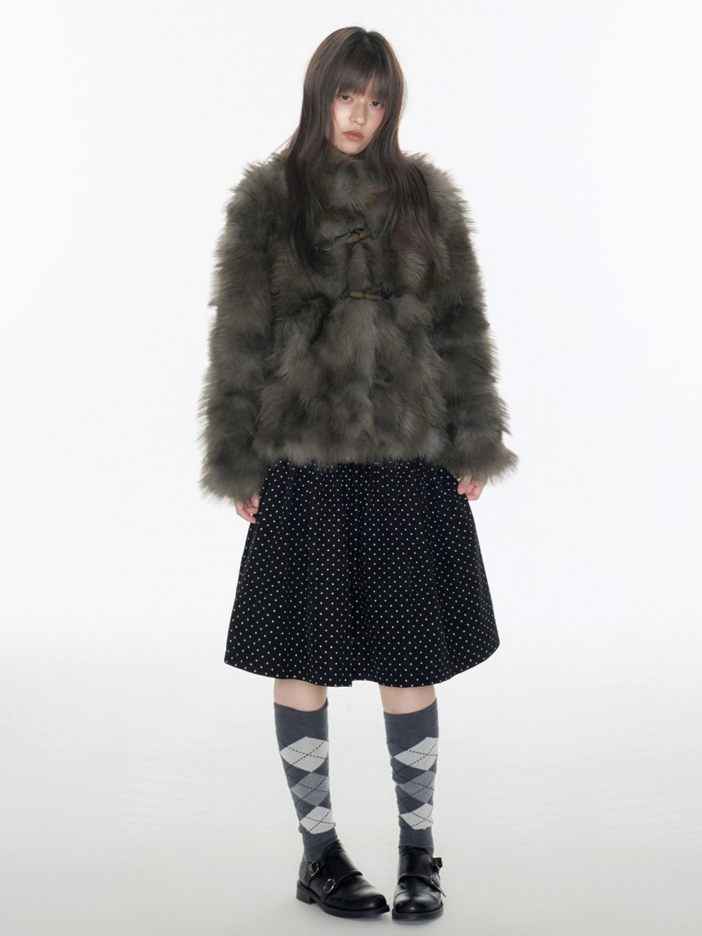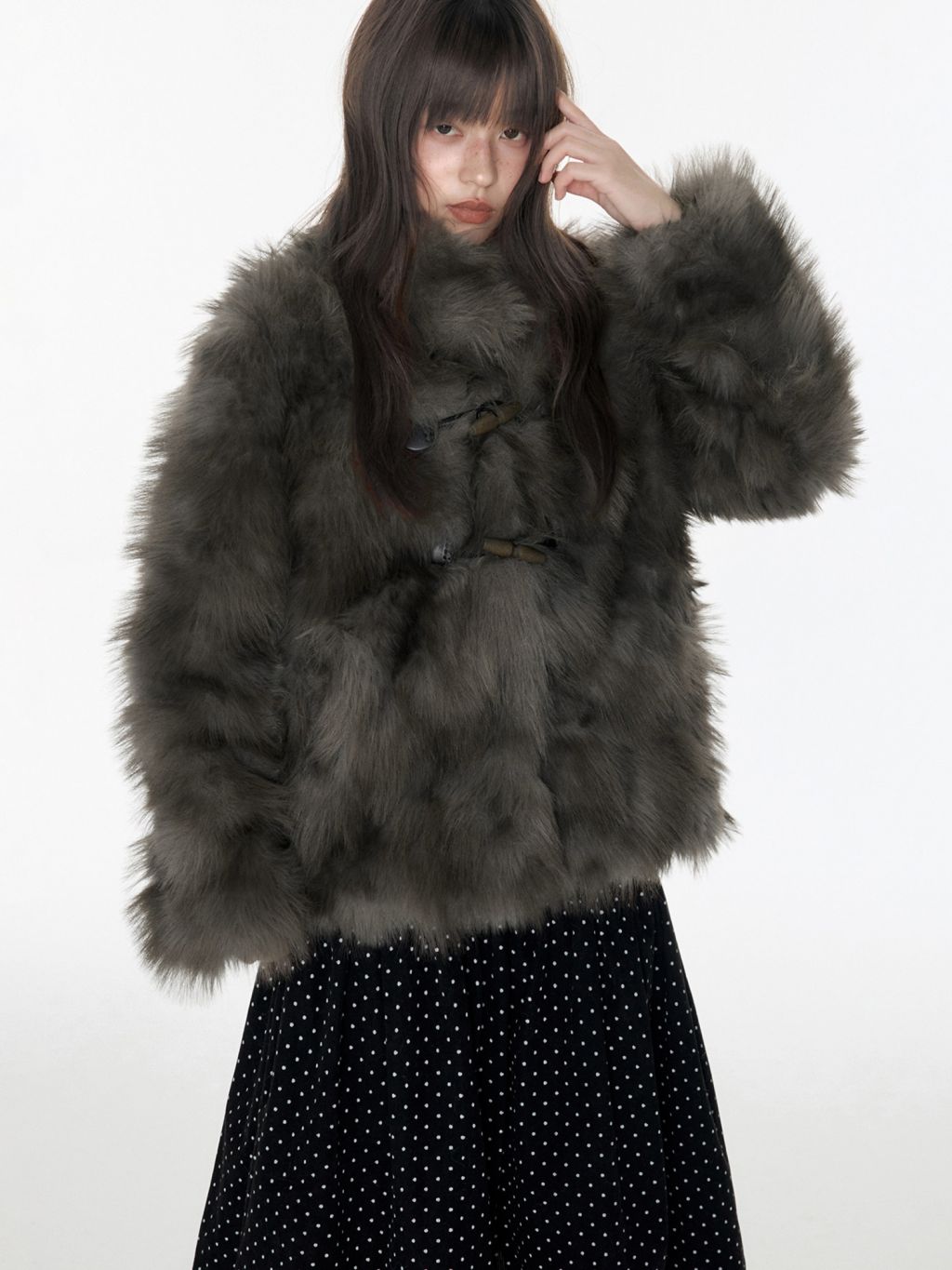 풍성한 퍼 텍스처와 더플 디테일이 어우러진 스모키 톤의 퍼 더플 코트입니다.