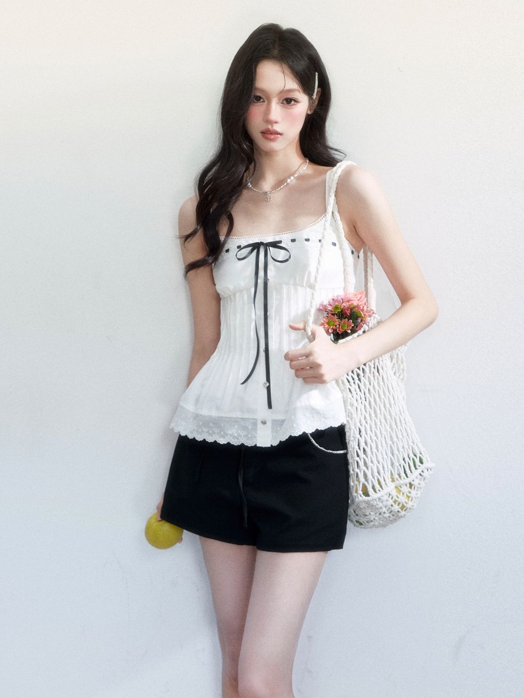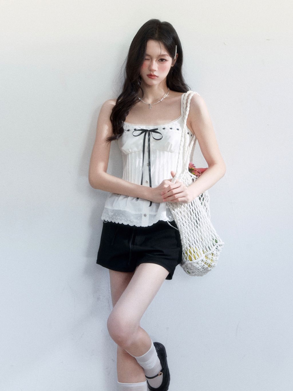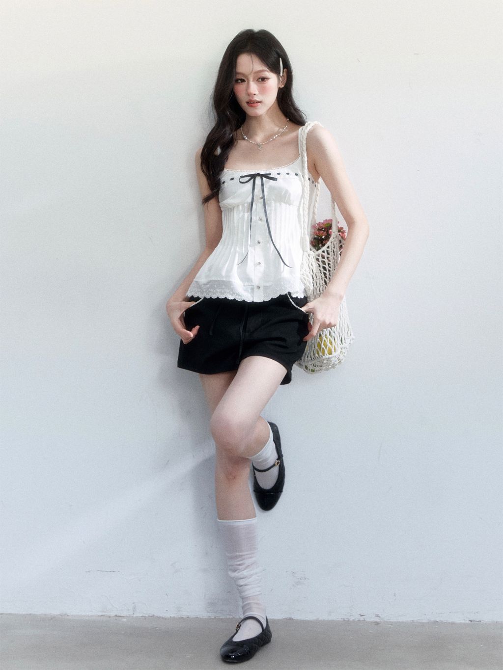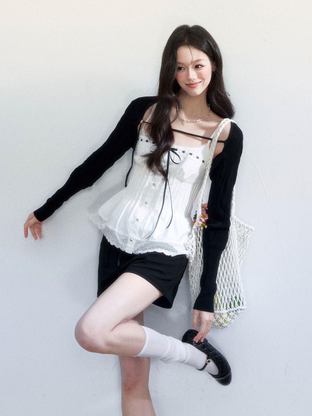 화이트 캐미탑에 블랙 리본/파이핑을 얹어 스윗한 셋업이에요. 슬림한 볼레로 가디건이 함께라 단독보다 더 여리한 실루엣으로 정리됩니다.