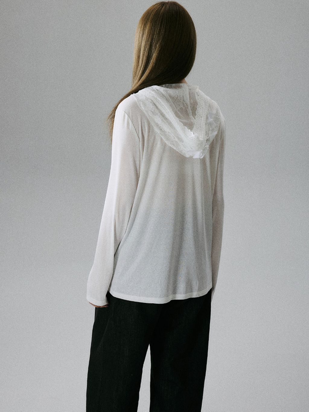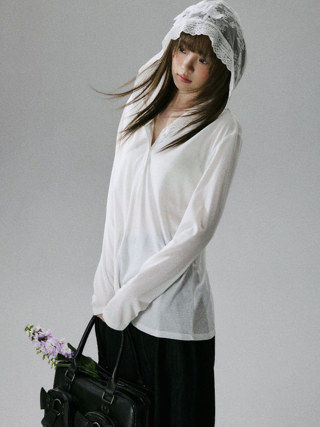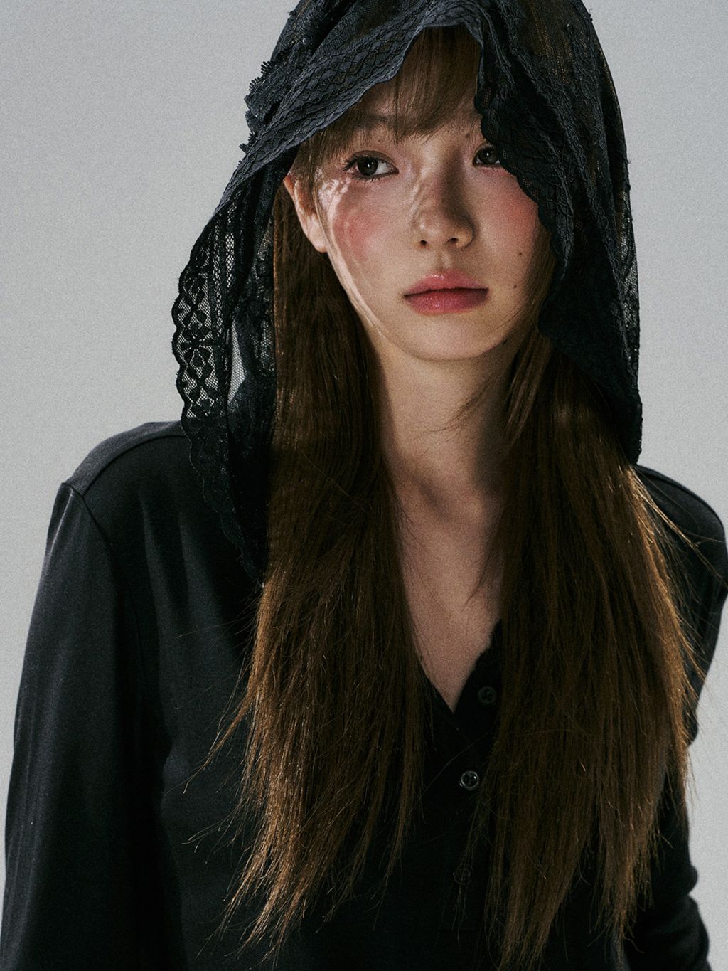 레이스 후드가 얼굴선을 감싸주며 무드를 완성하는 시스루 롱슬리브 탑입니다. 헨리넥 버튼 디테일로 여리하지만 심심하지 않게, 단독으로도 레이어드로도 활용이 좋아요.