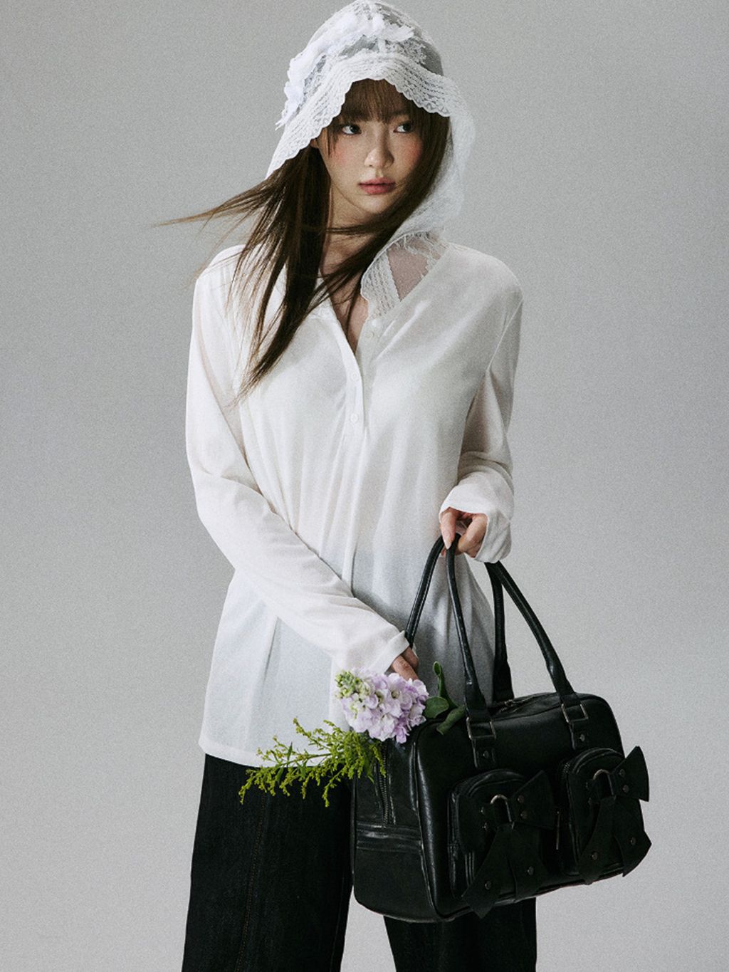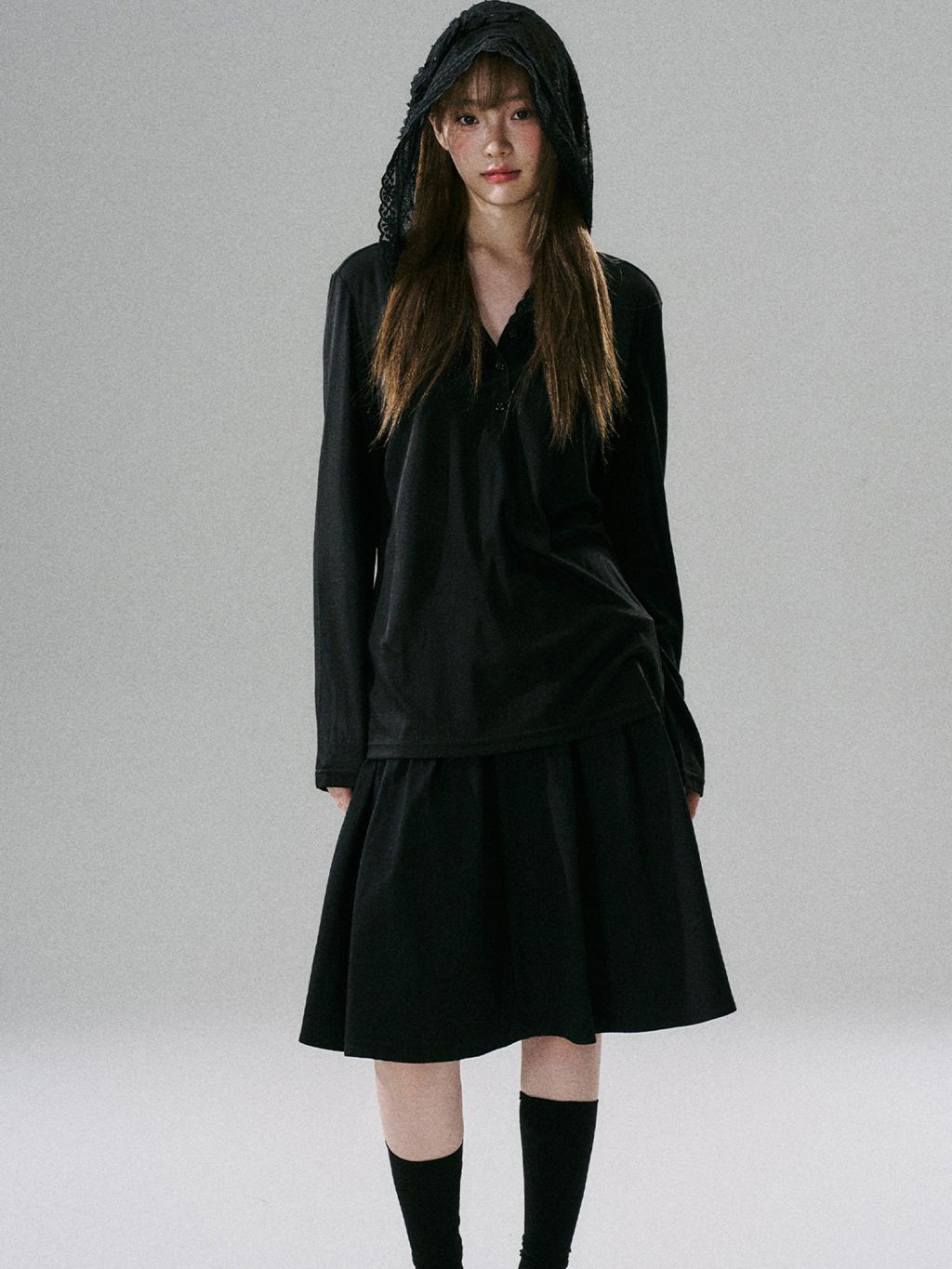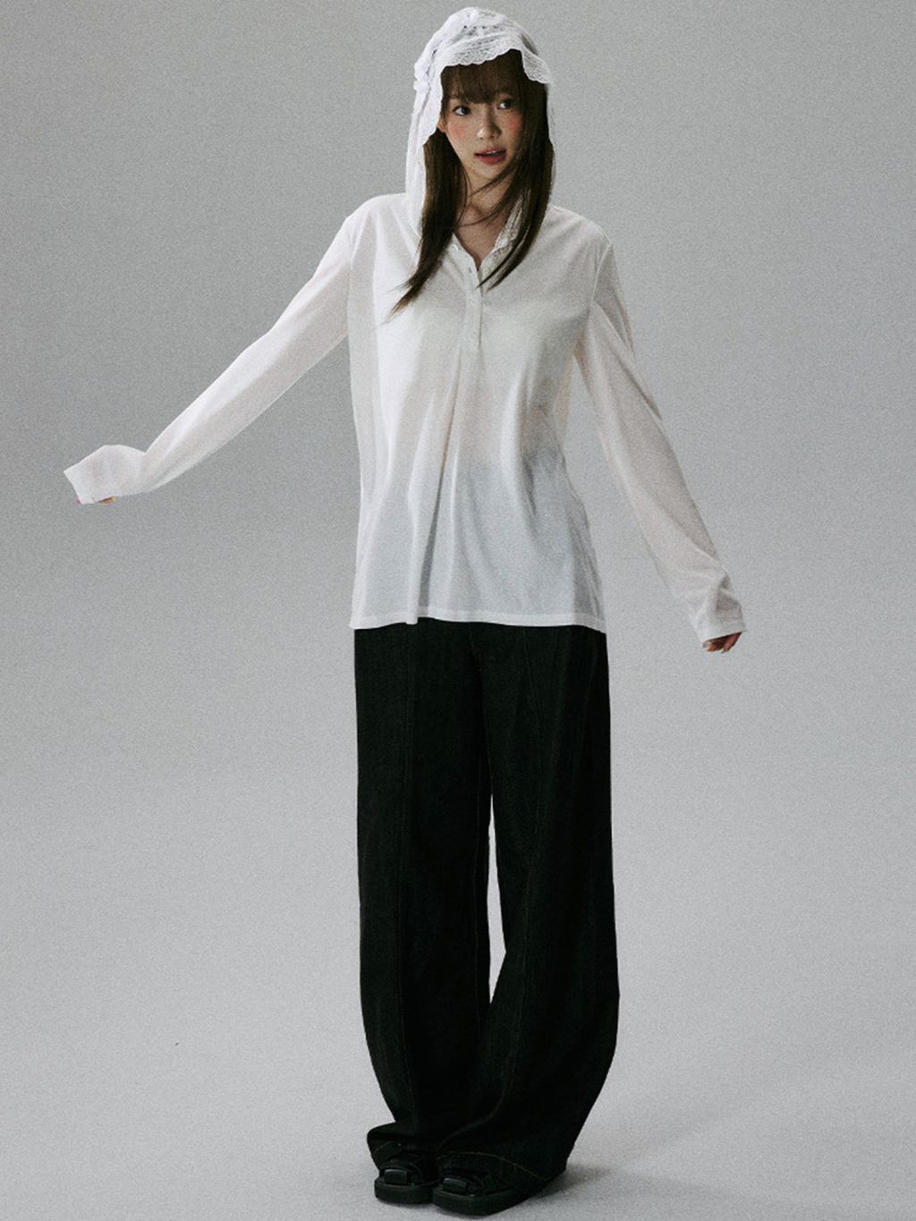 레이스 후드가 얼굴선을 감싸주며 무드를 완성하는 시스루 롱슬리브 탑입니다. 헨리넥 버튼 디테일로 여리하지만 심심하지 않게, 단독으로도 레이어드로도 활용이 좋아요.