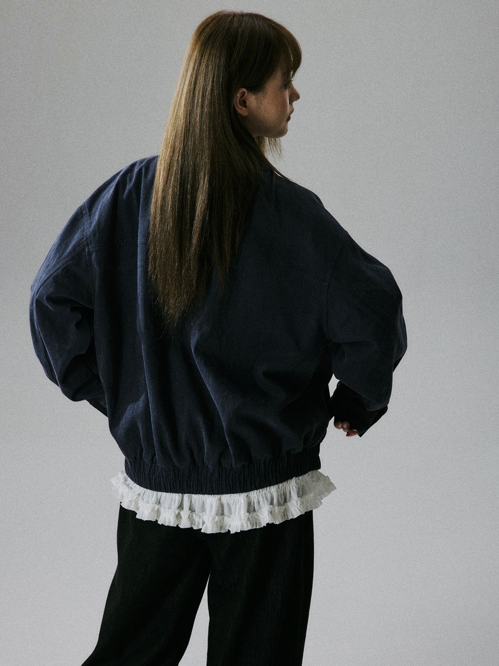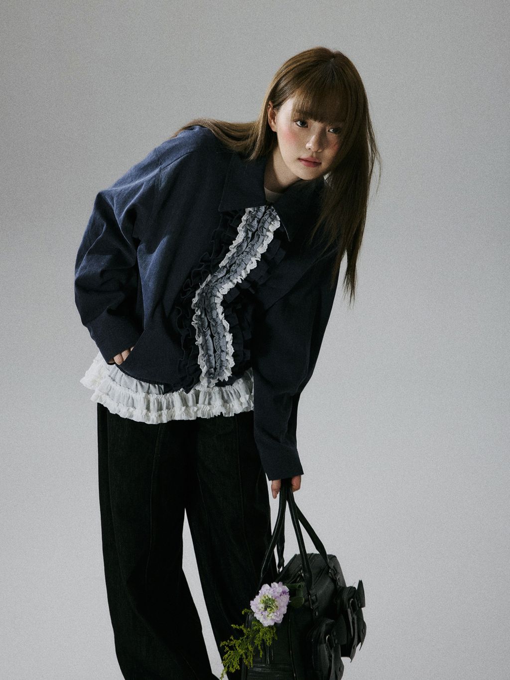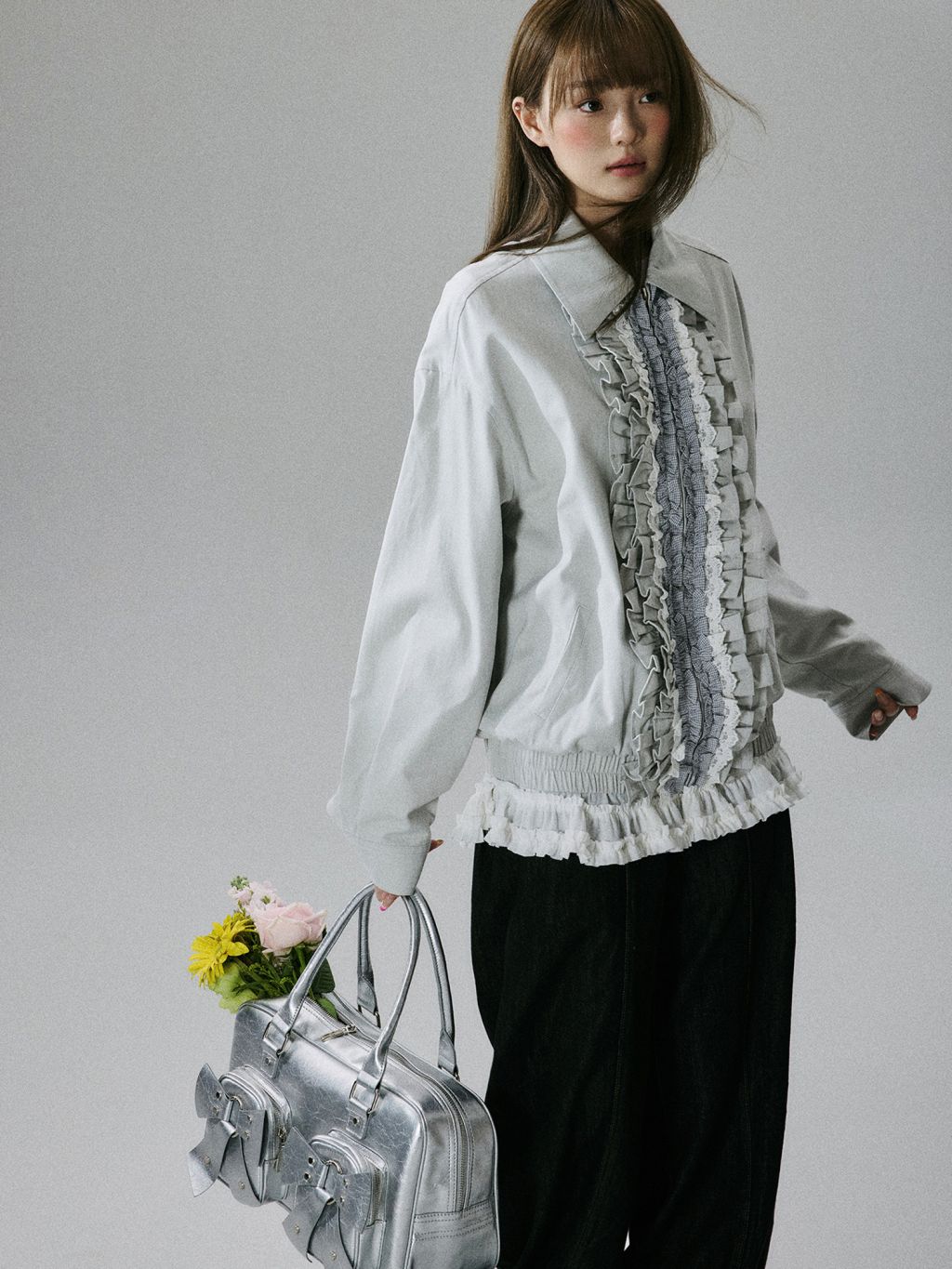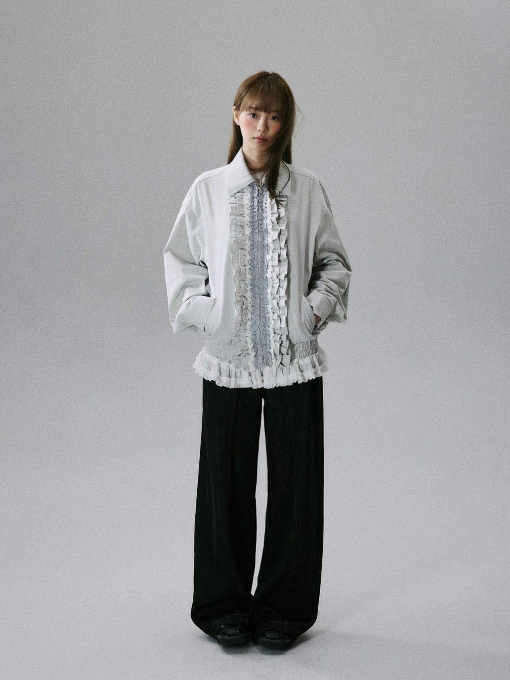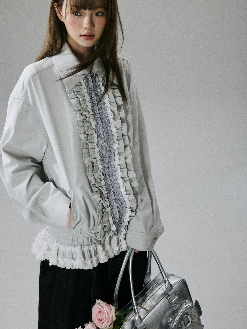 트랙 자켓 실루엣에 프릴·레이스 러플을 세로로 길게 얹어, 스포티함과 걸리 무드를 한 번에 잡은 아이템입니다.