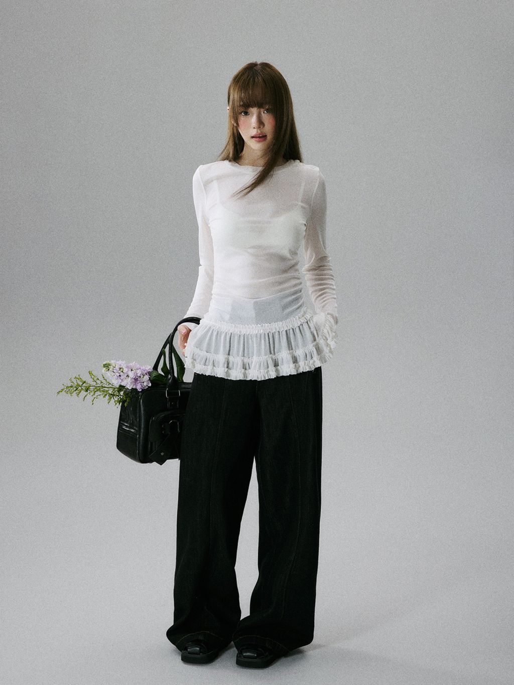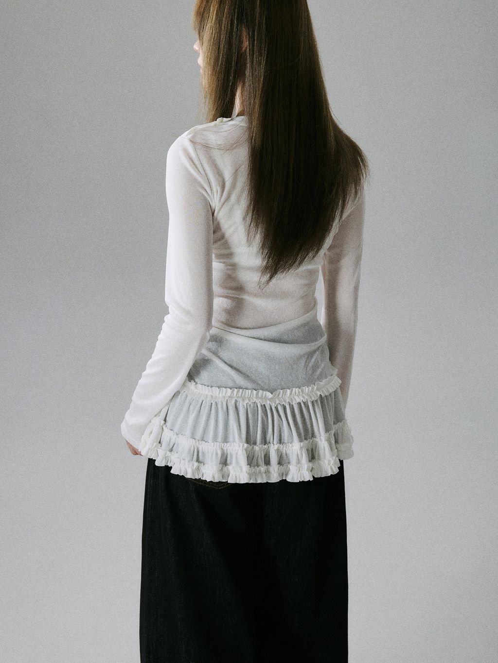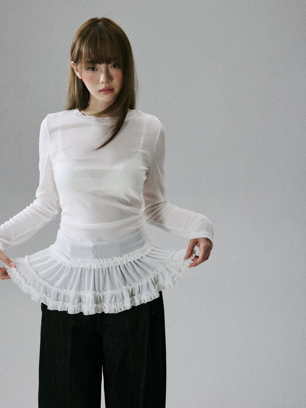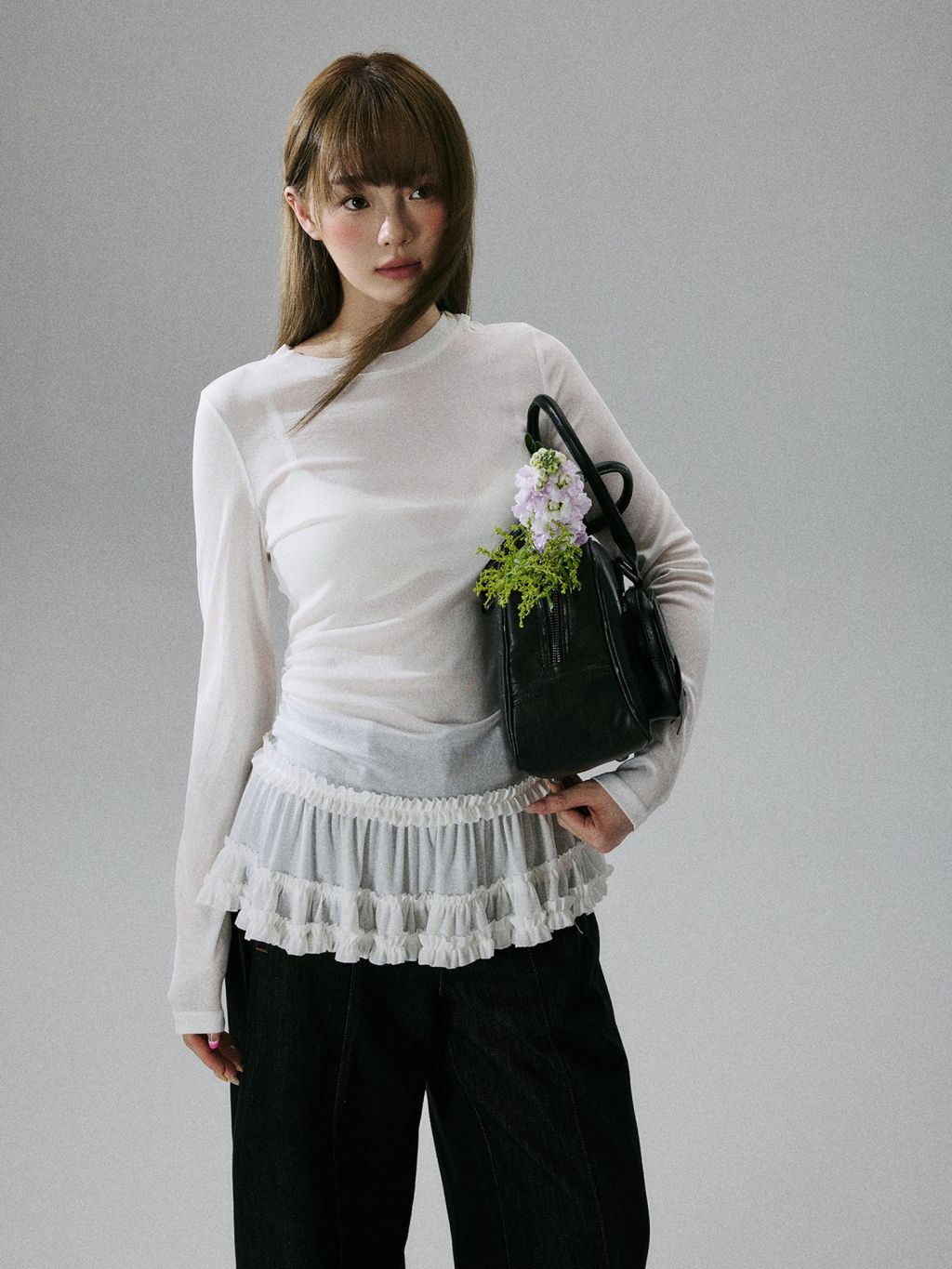 바람처럼 가볍게 비치는 시어 텍스처로, 레이어드 하나만 해도 무드가 확 달라지는 이너 탑입니다. 단독은 물론 셋업/원피스/셔츠 안에 넣어도 ‘여리+쿨’ 밸런스가 깔끔하게 살아납니다.