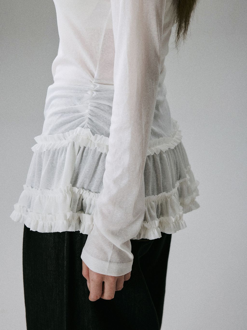 - 롱슬리브 라인으로 손등까지 자연스럽게 덮여 여리한 실루엣을 만들어줍니다.