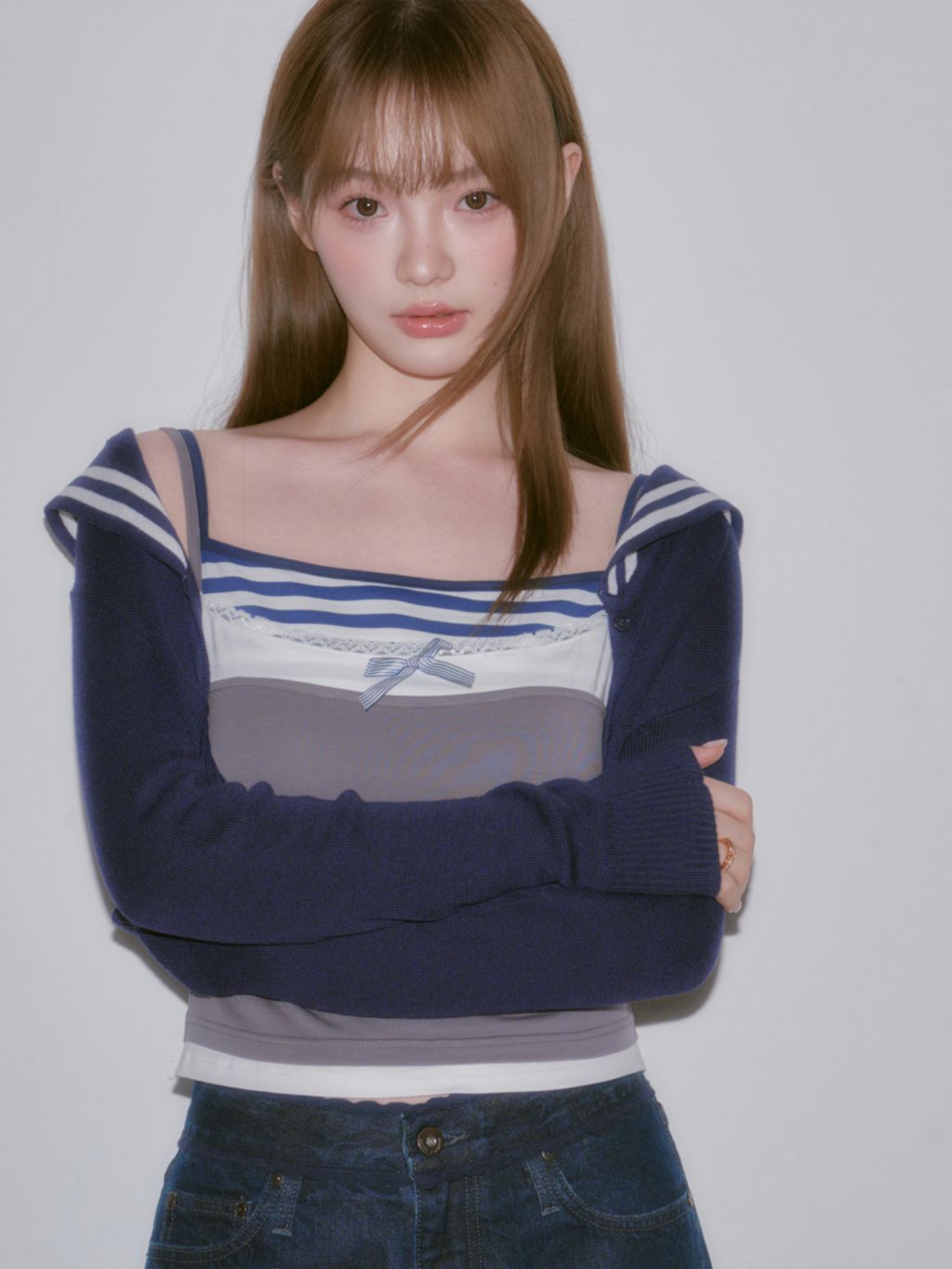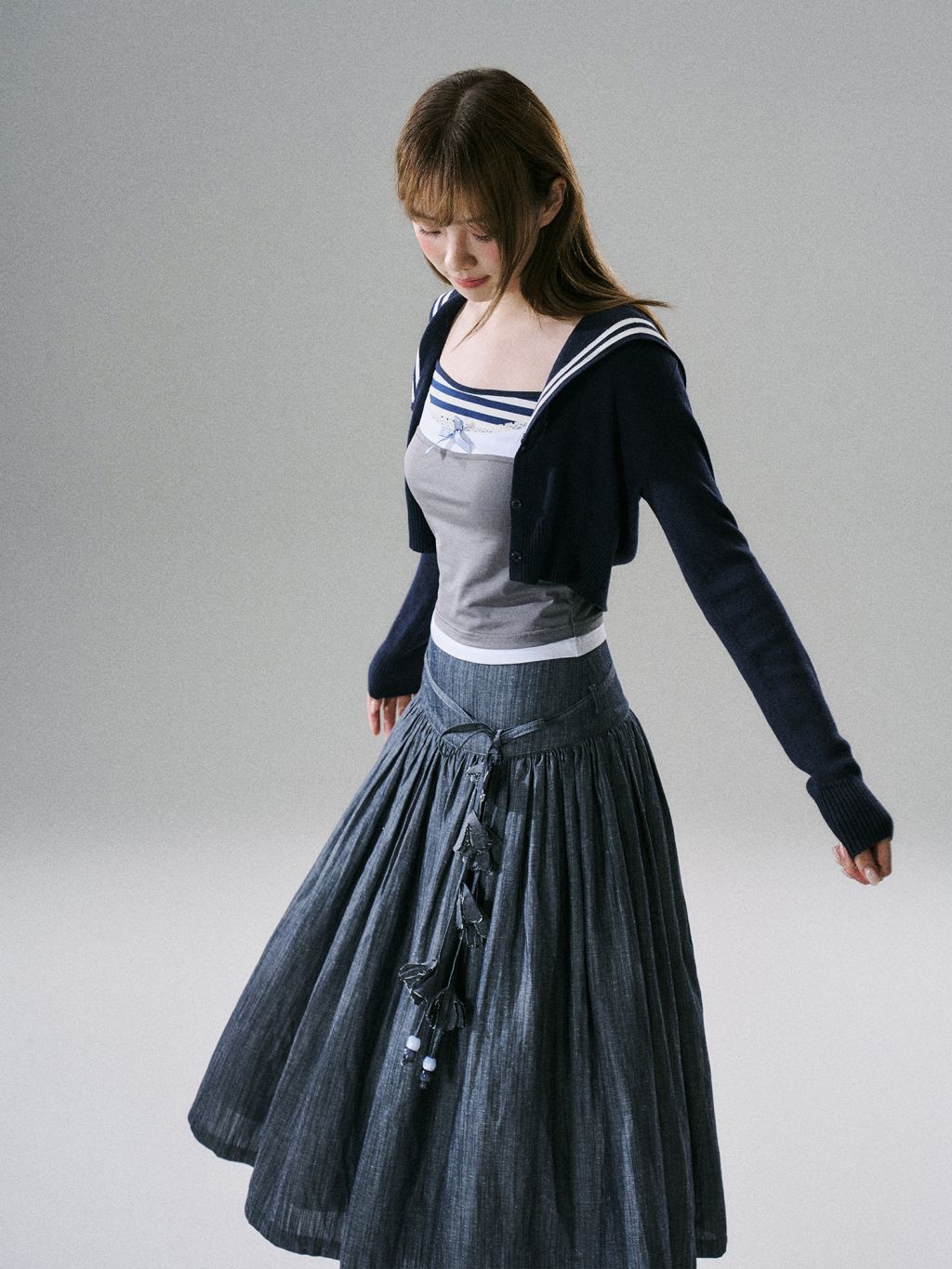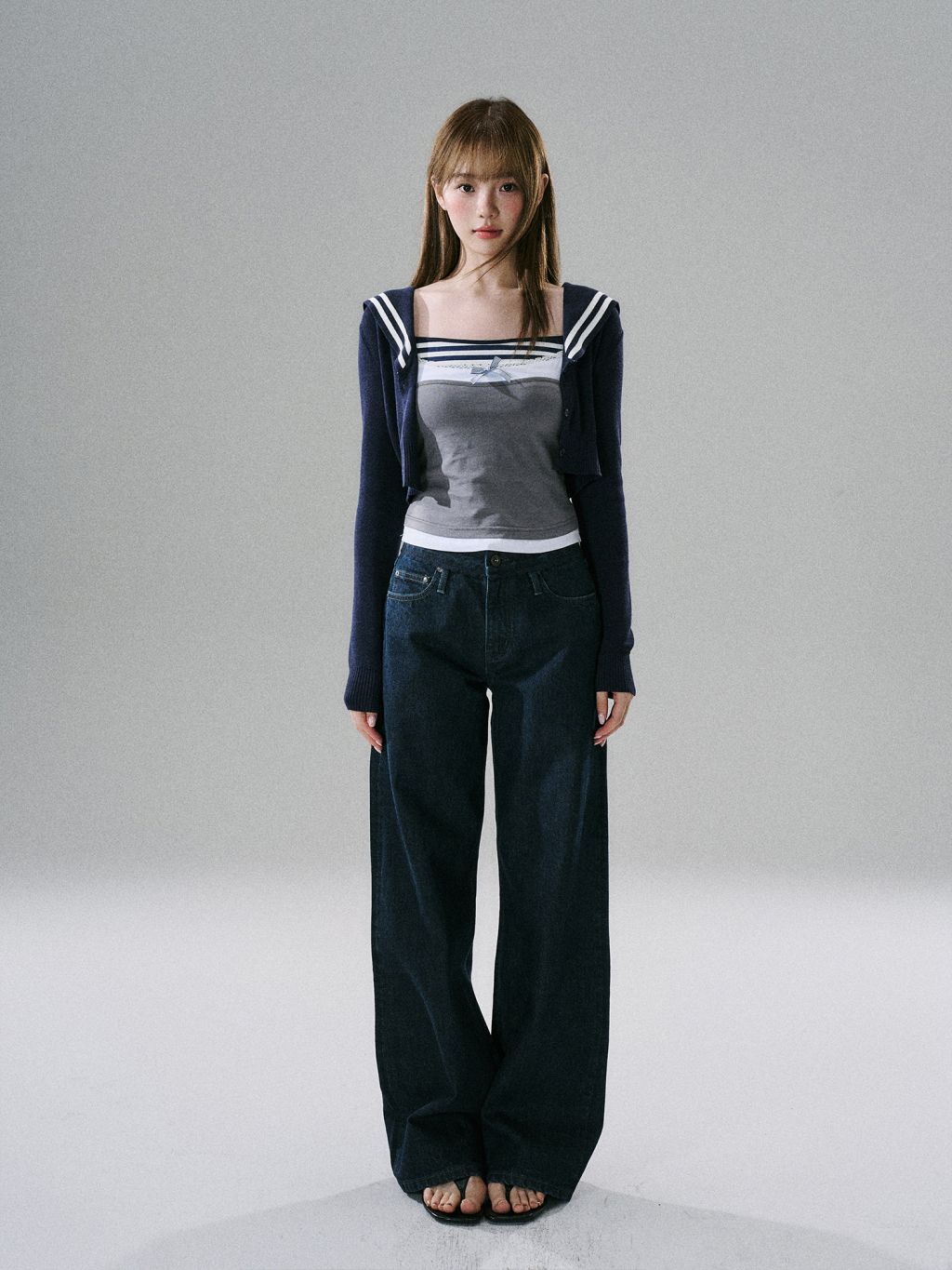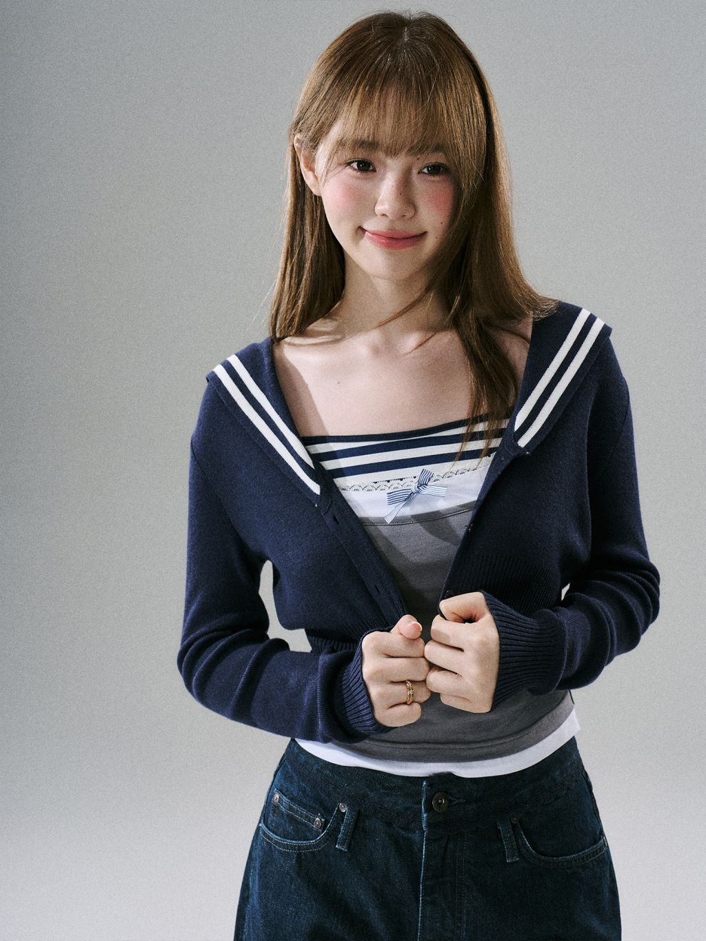 세일러 카라와 스트라이프 트리밍이 포인트인 크롭 가디건으로, 한 벌만 더해도 프레피 무드가 또렷해집니다. 짧은 기장 + 롱 슬리브 밸런스로 비율이 깔끔하게 정리됩니다.