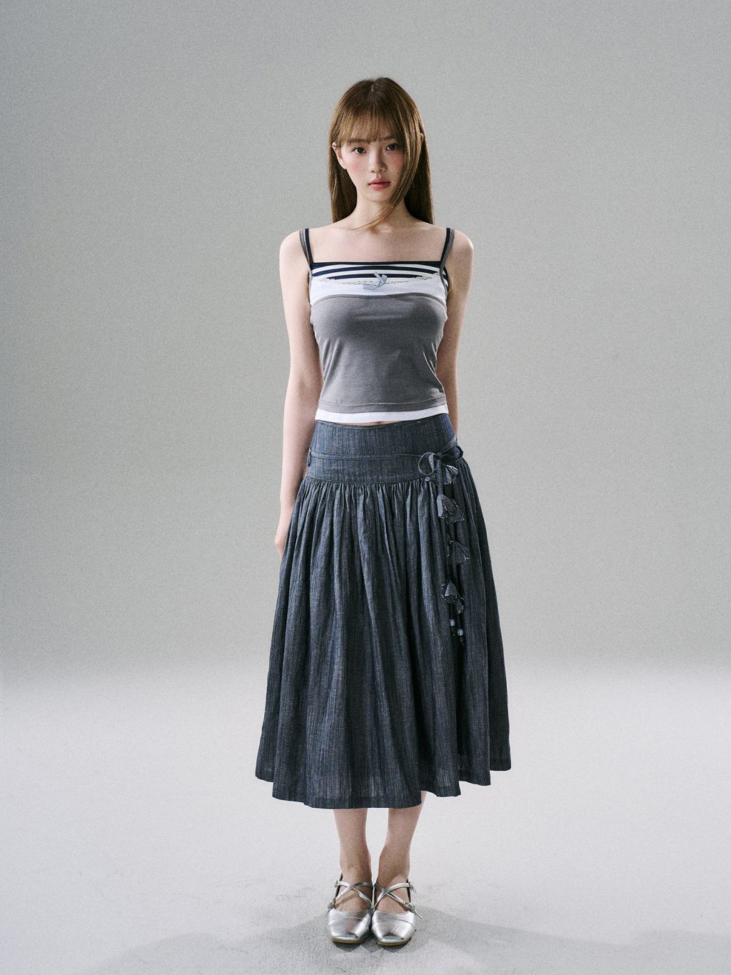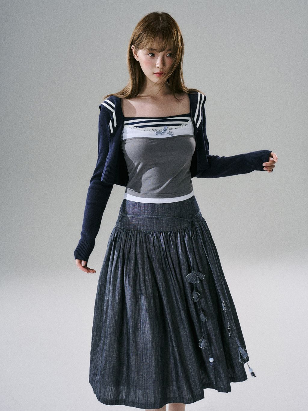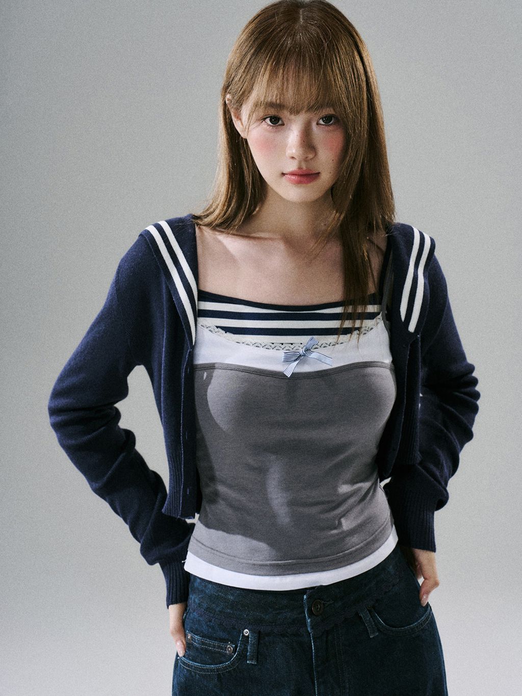 세일러 스트라이프와 리본 디테일을 레이어드한 듯 담아낸 캐미탑으로, 한 벌만으로 ‘프레피+걸코어’ 무드가 완성됩니다. 슬림한 핏과 짧은 기장감이 비율을 또렷하게 잡아줘요.