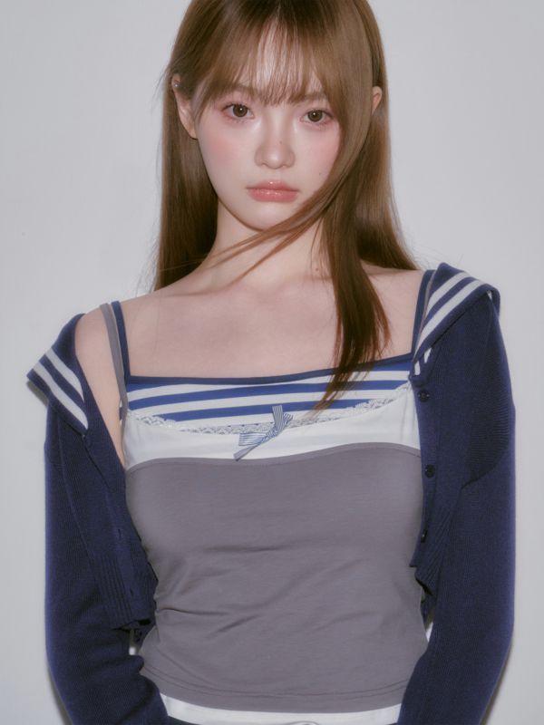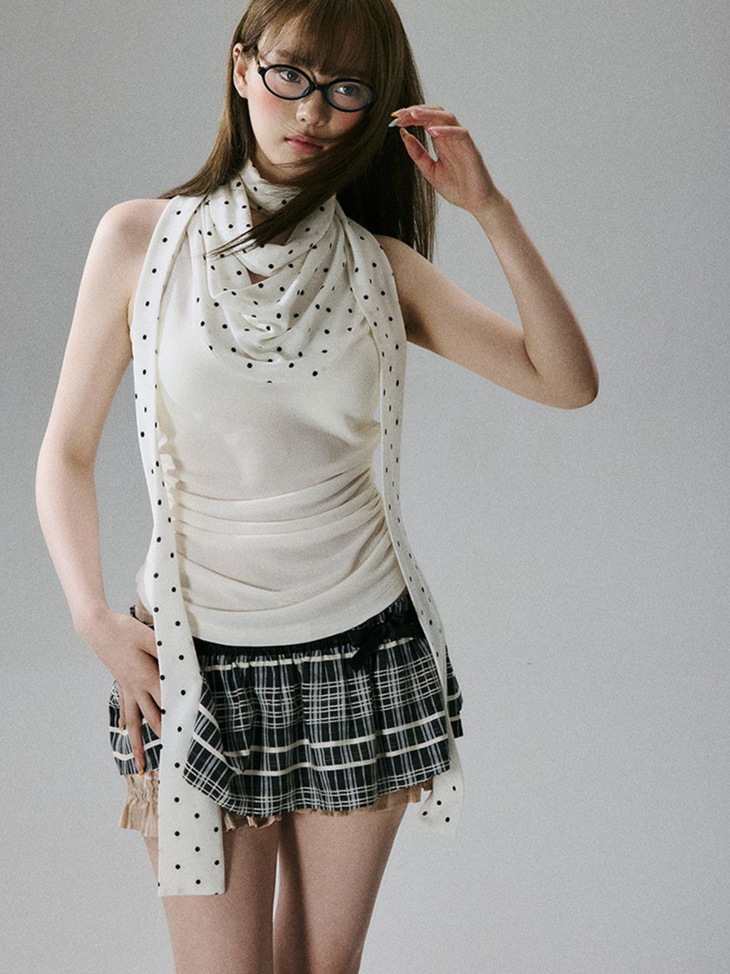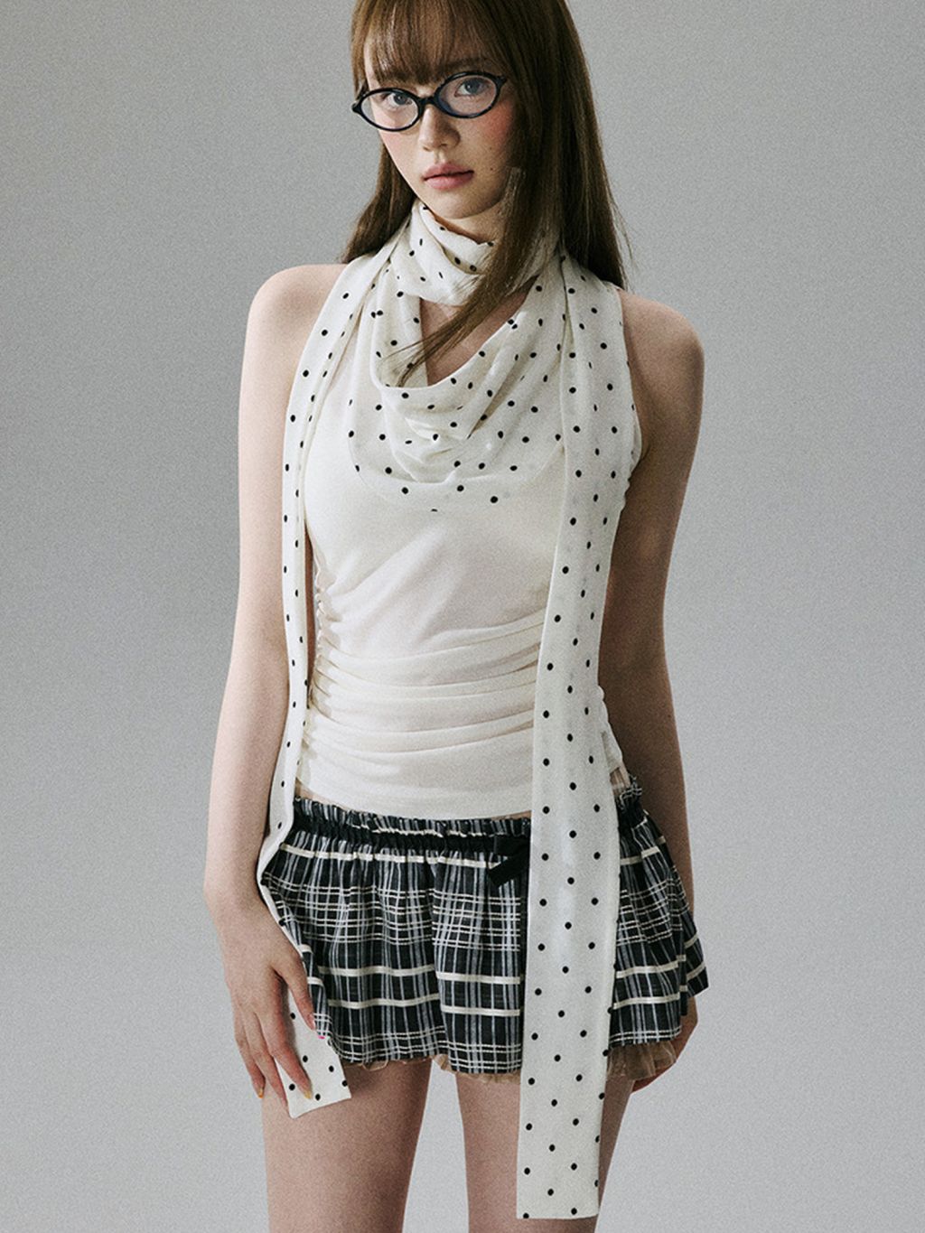 드레이프 네크라인 위로 도트 스카프가 길게 흐르면서, 한 벌만으로 ‘꾸안꾸’가 아니라 ‘꾸민 무드’를 완성하는 민소매 탑이에요. 바디는 슬림하게 잡아주고, 스카프 디테일이 시선 포인트를 만들어줘서 사진이 특히 예쁘게 나옵니다.