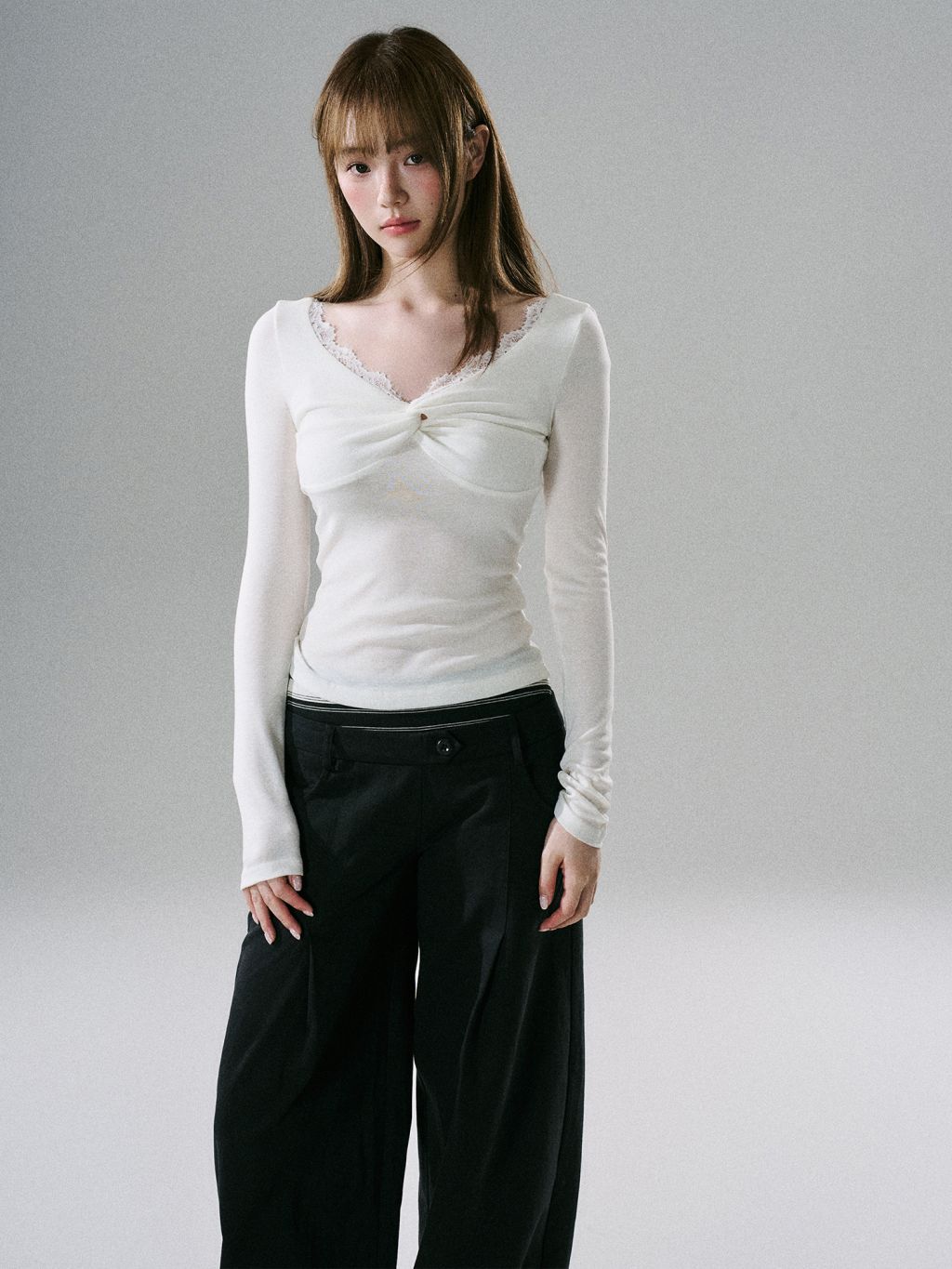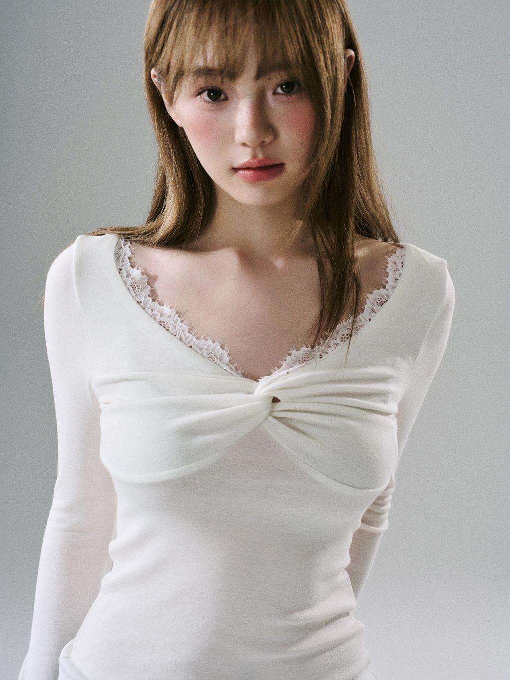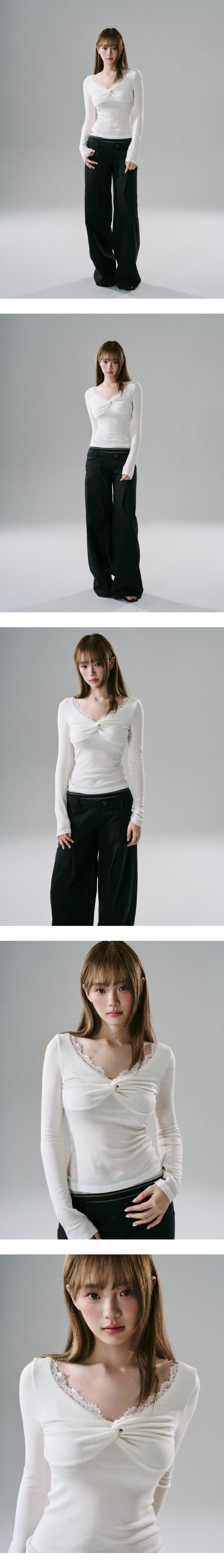 가슴 중앙 트위스트 디테일과 레이스 트리밍이 한 벌만으로도 ‘여리+센슈얼’ 무드를 완성해주는 슬림 핏 롱슬리브 탑입니다. 깊게 파이지 않는 와이드 V 넥 라인이 쇄골 라인을 예쁘게 살려줘요.