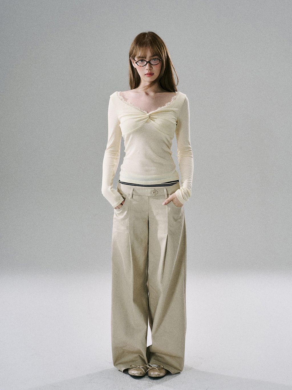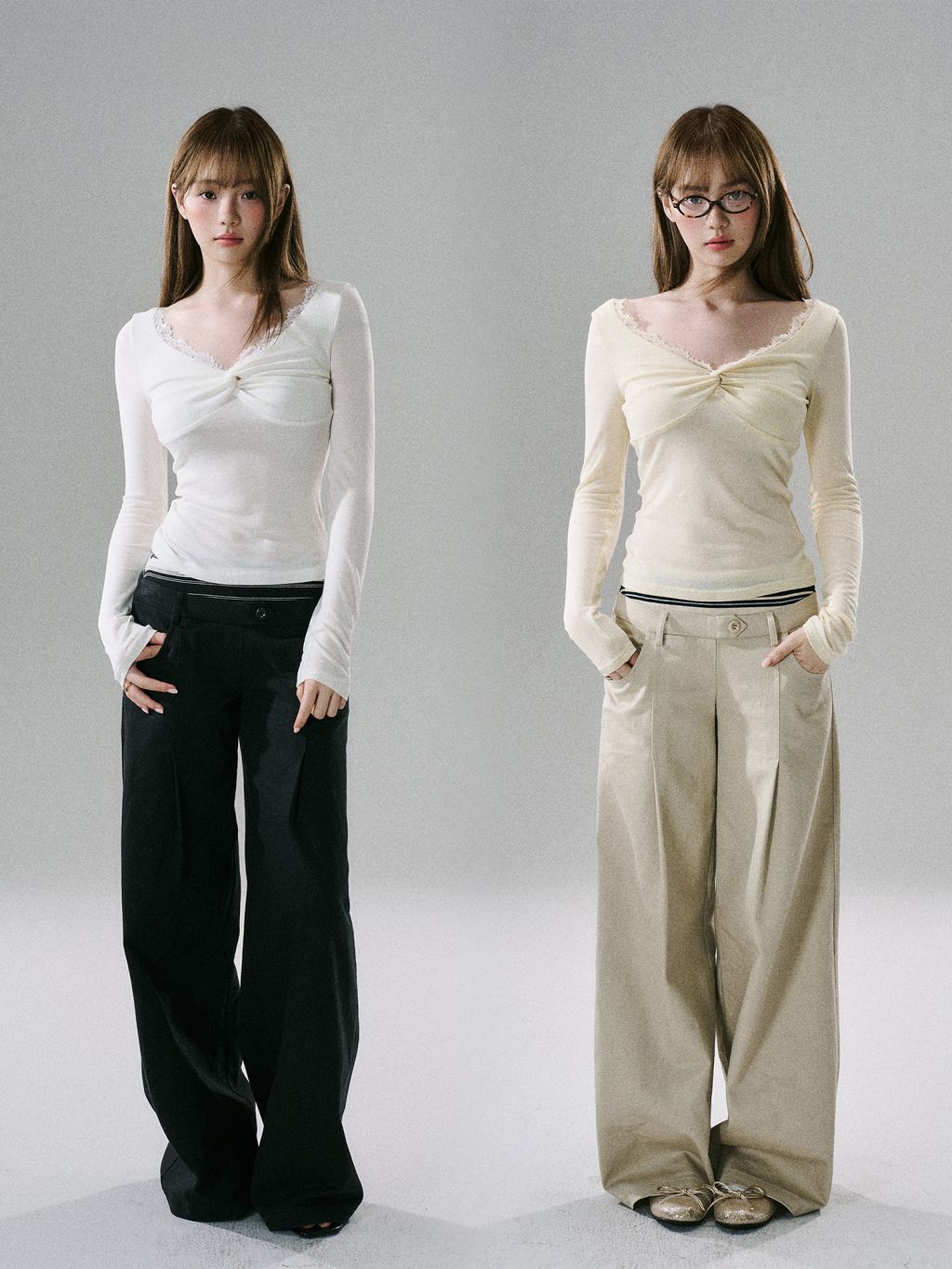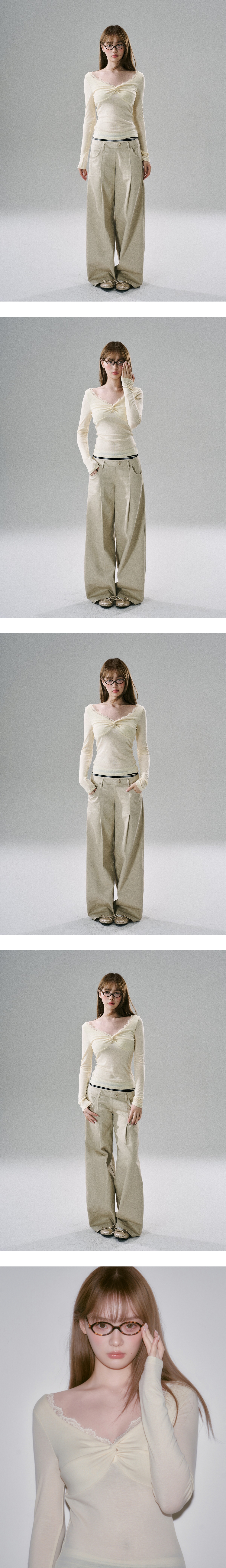 가슴 중앙 트위스트 디테일과 레이스 트리밍이 한 벌만으로도 ‘여리+센슈얼’ 무드를 완성해주는 슬림 핏 롱슬리브 탑입니다. 깊게 파이지 않는 와이드 V 넥 라인이 쇄골 라인을 예쁘게 살려줘요.