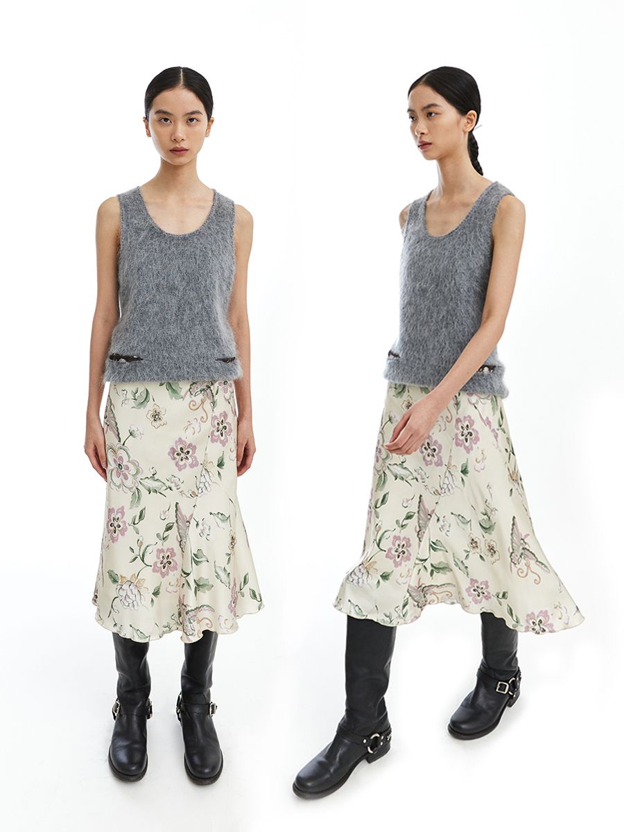 히든밴드가 있어 편안하게 입을 수 있는 은은한 광택이 고급스러운 플로럴 패턴의 스커트입니다.
