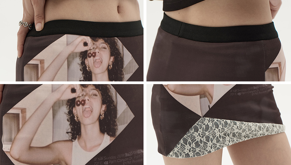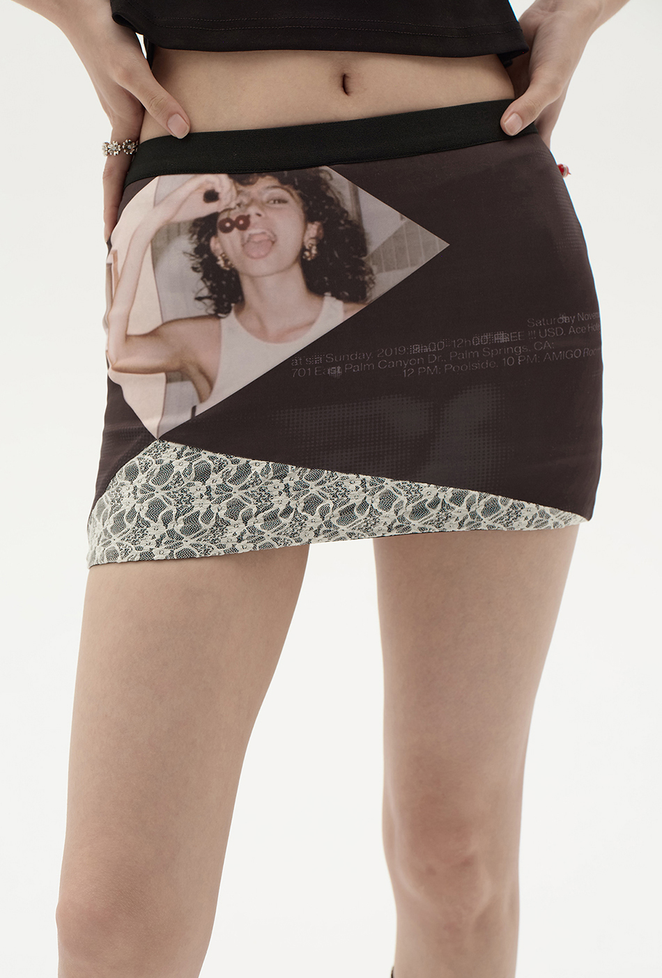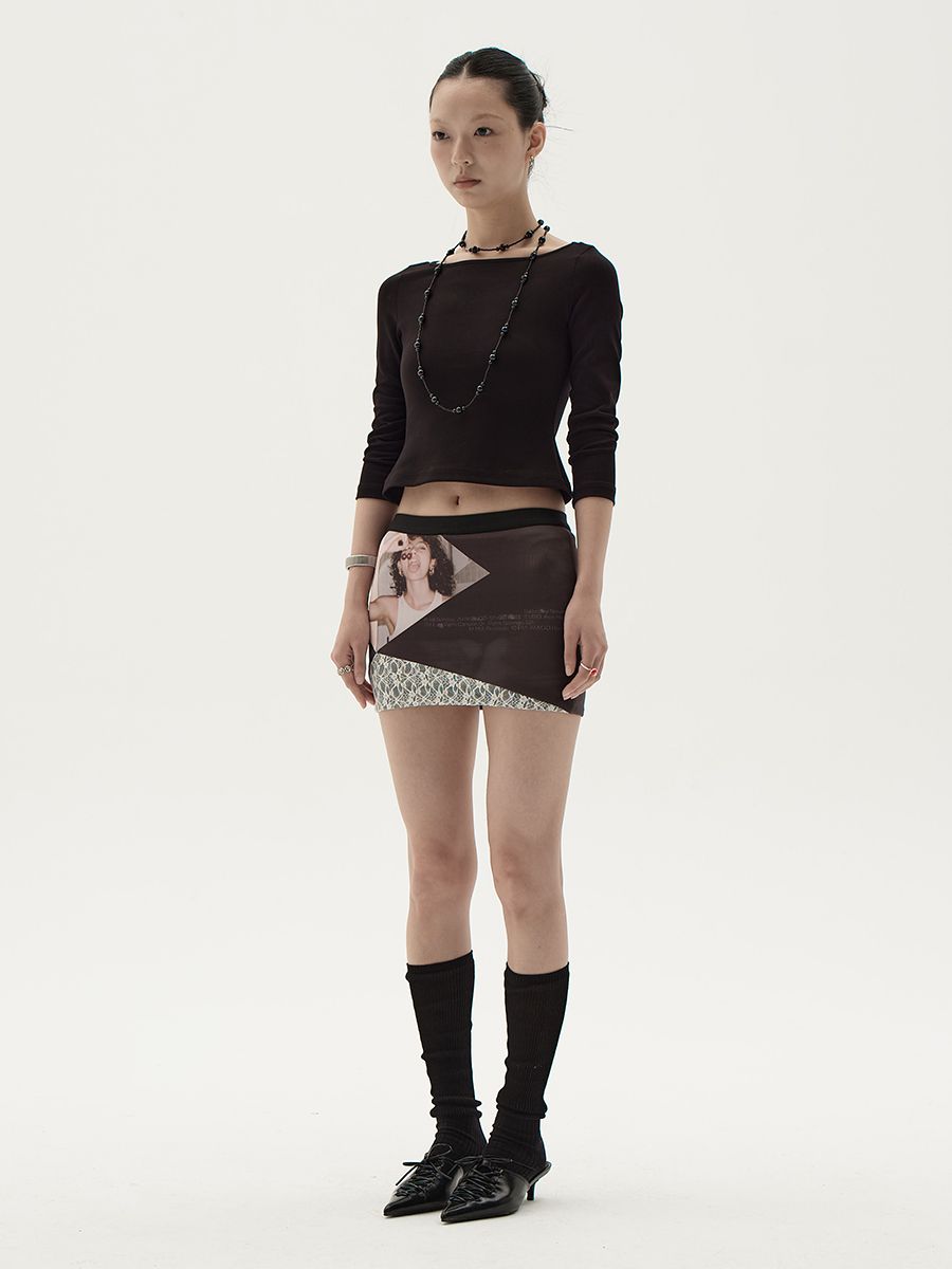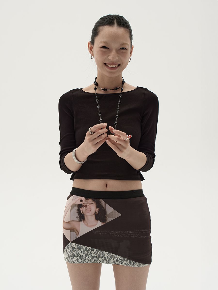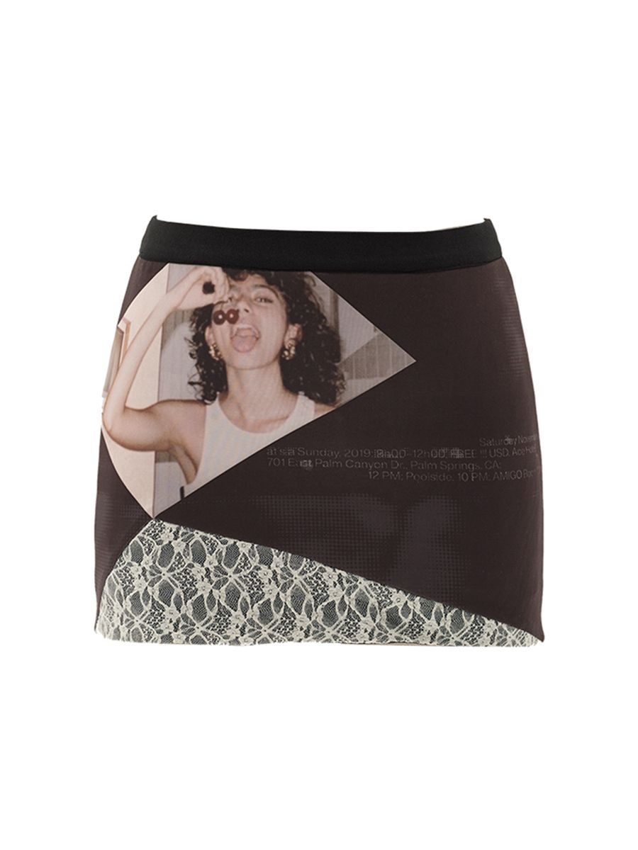 스판원단을 사용하게 바디라인을 살려주는 빈티지한 프린팅과 레이스 패치 디자인의 조화가 스타일리쉬한 스커트입니다.