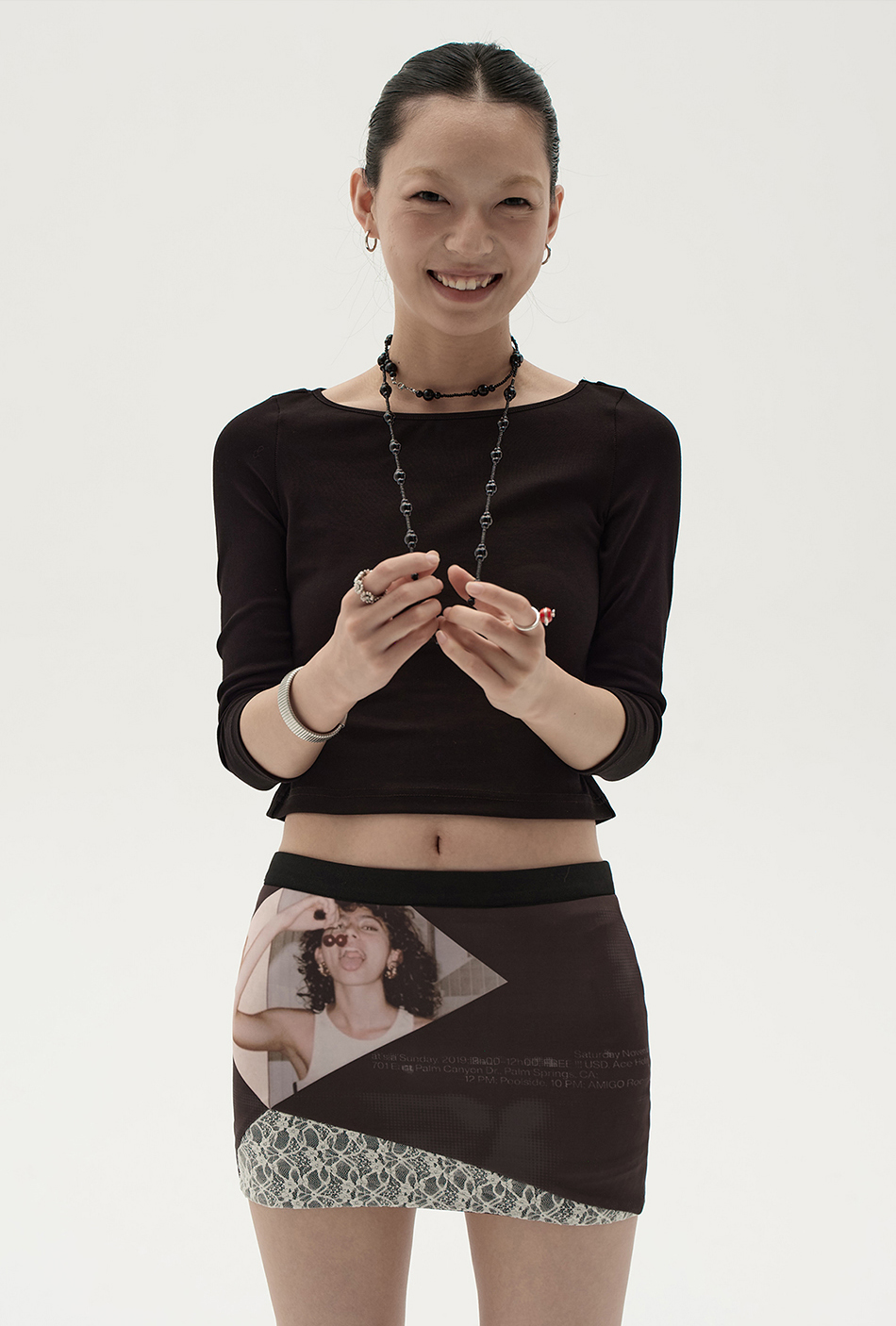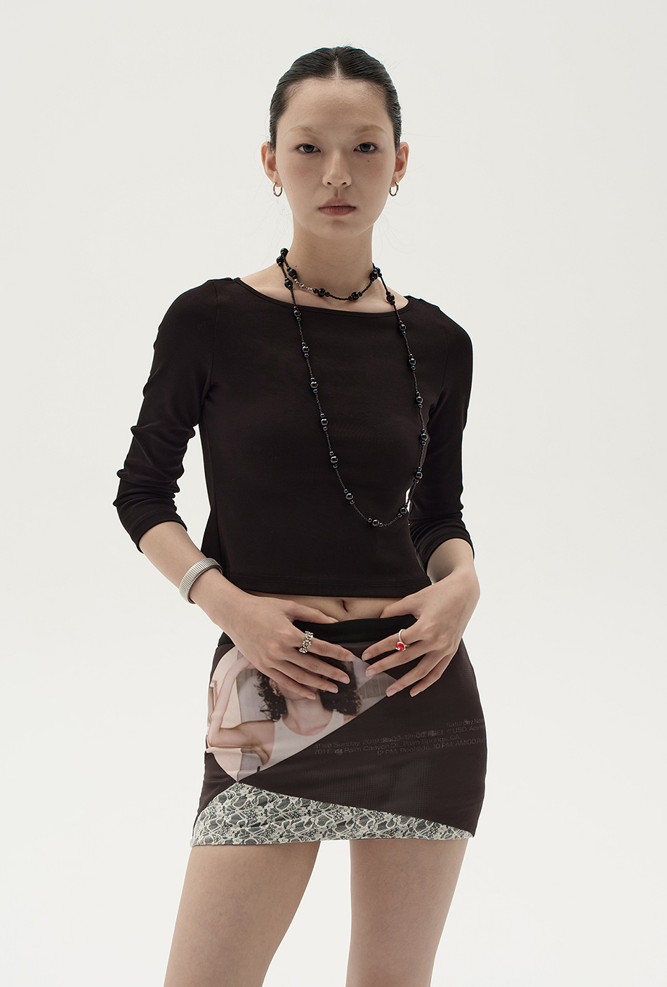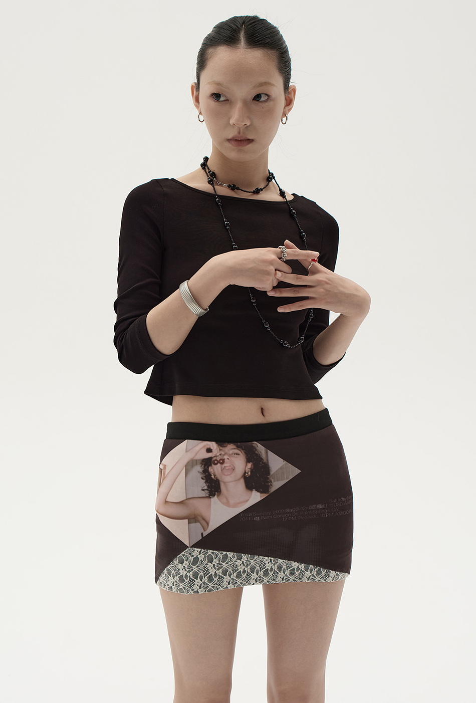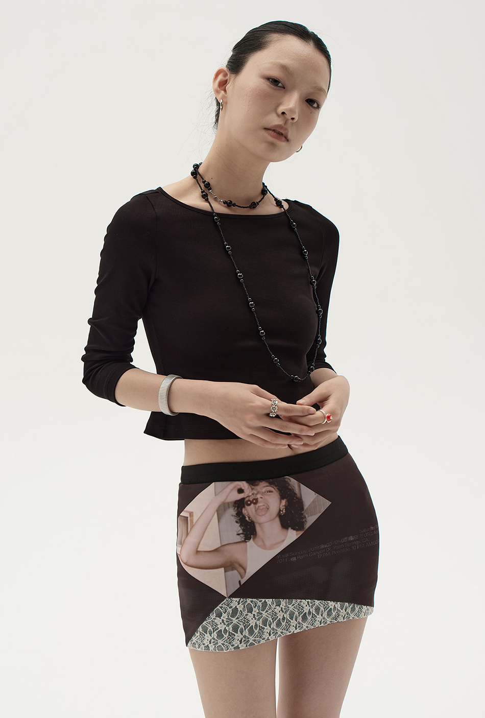 스판원단을 사용하게 바디라인을 살려주는 빈티지한 프린팅과 레이스 패치 디자인의 조화가 스타일리쉬한 스커트입니다.