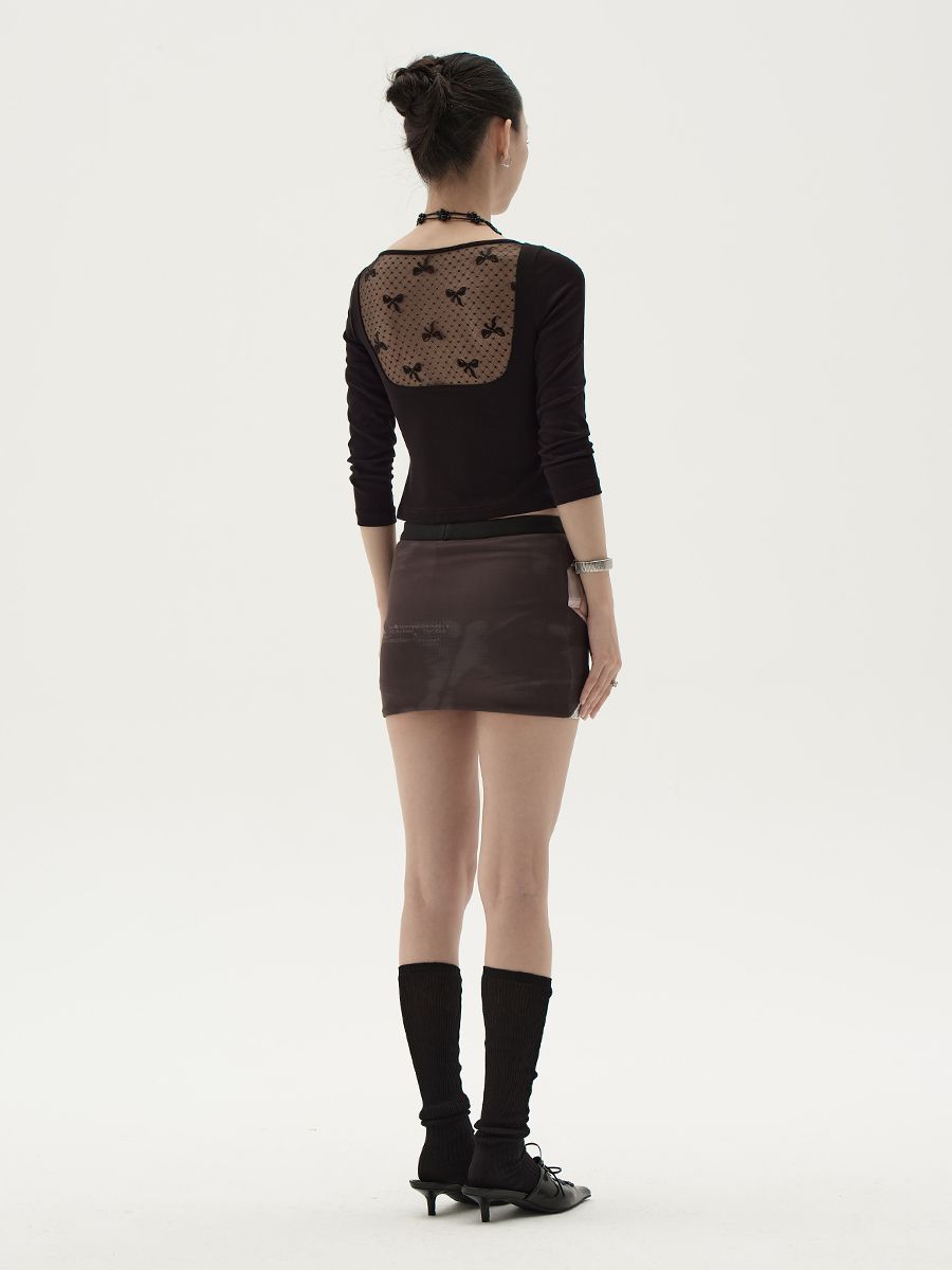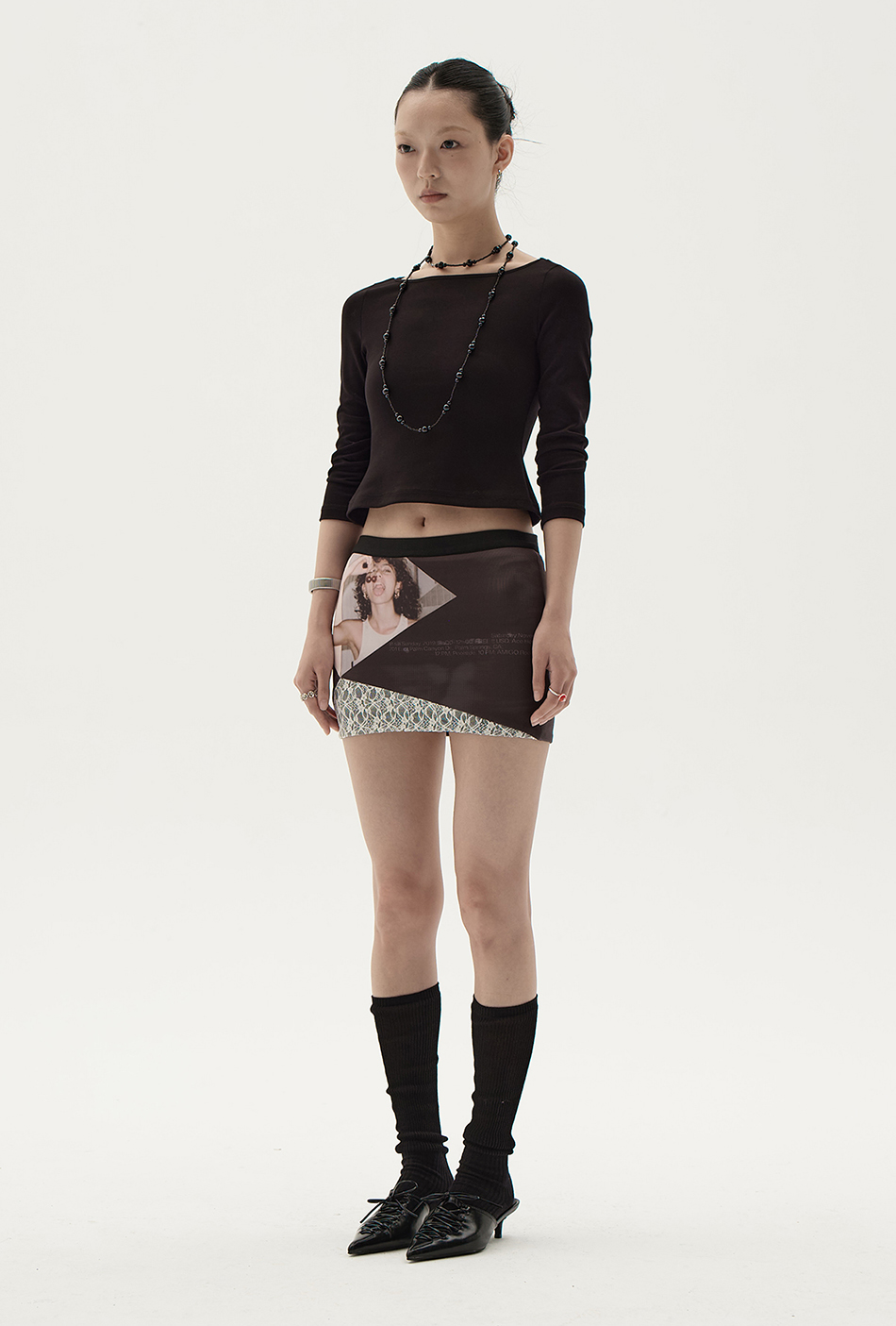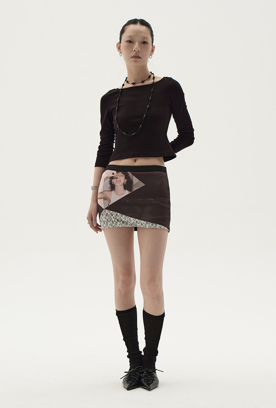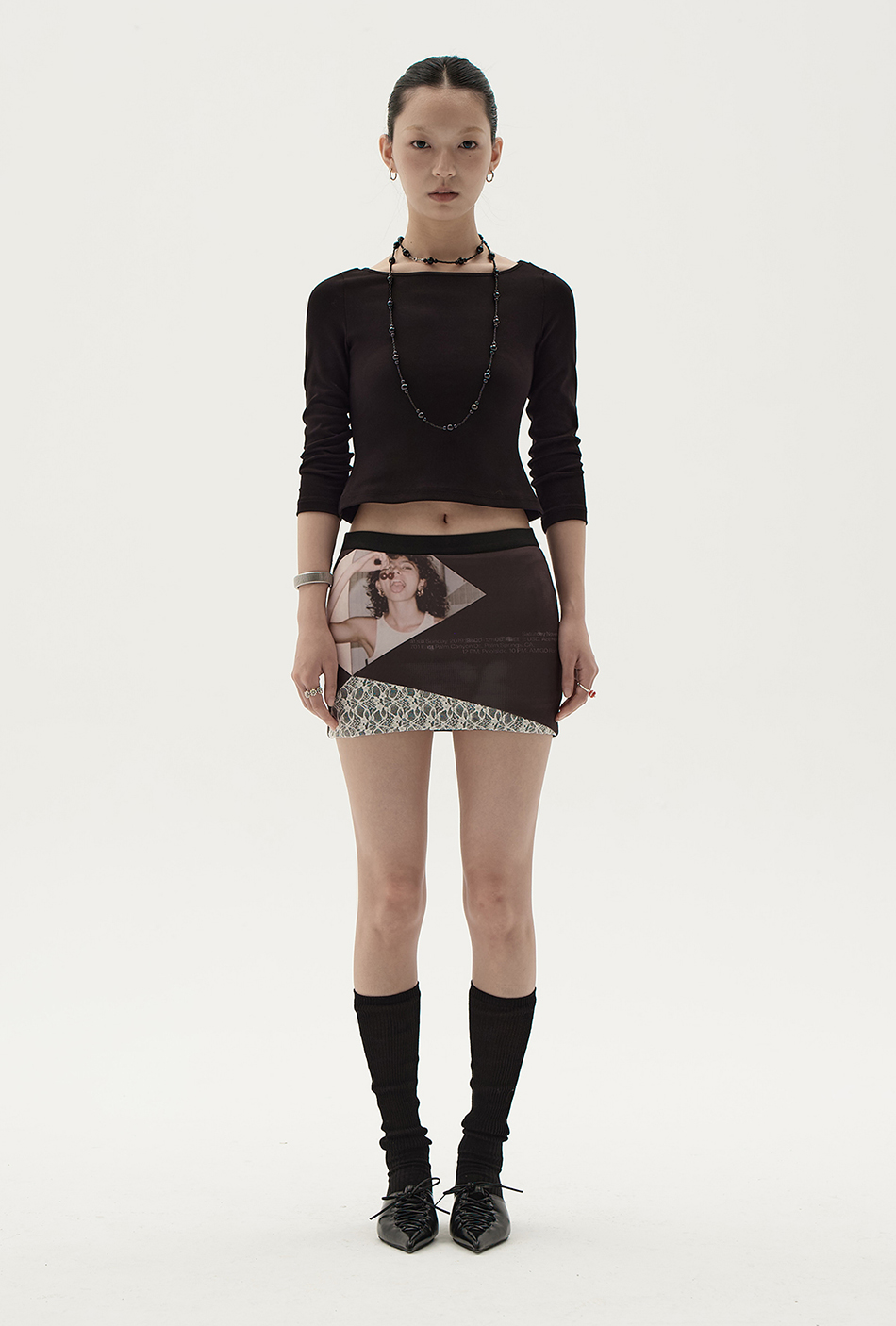 레이스 패치 디자인의 조화로 매력적인 비주얼을 보여주는 스커트입니다.